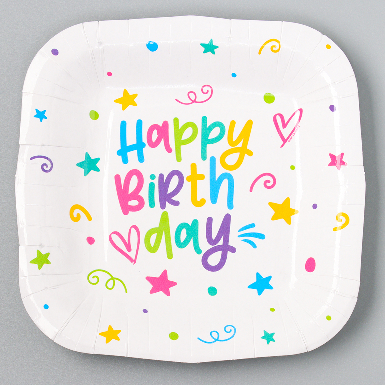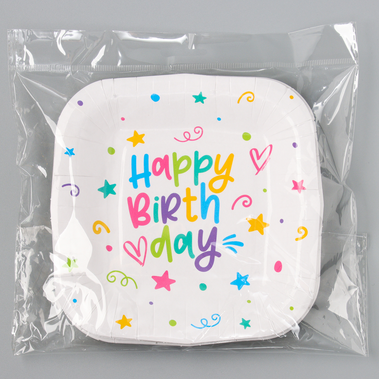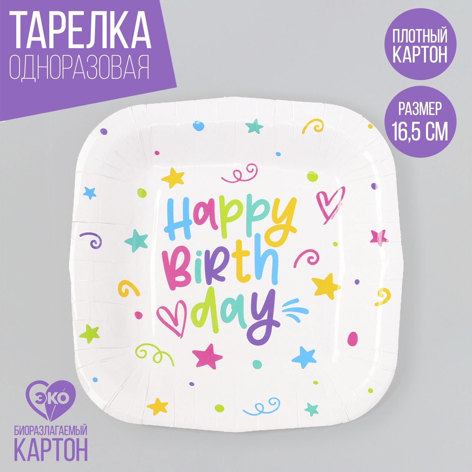 Тарелка одноразовая бумажная квадратная "Happy Birthday", звёздочки, 16,5х16,5 см