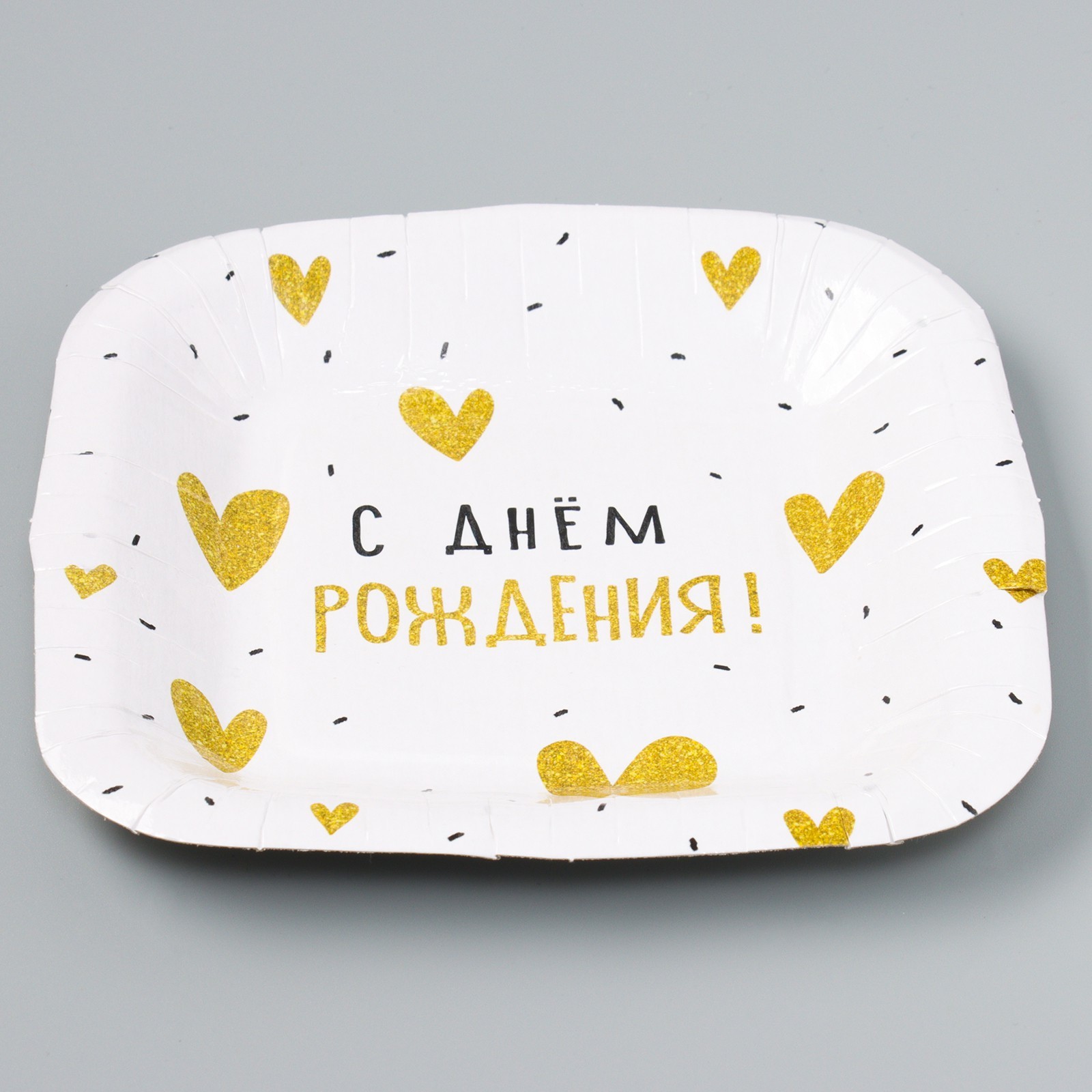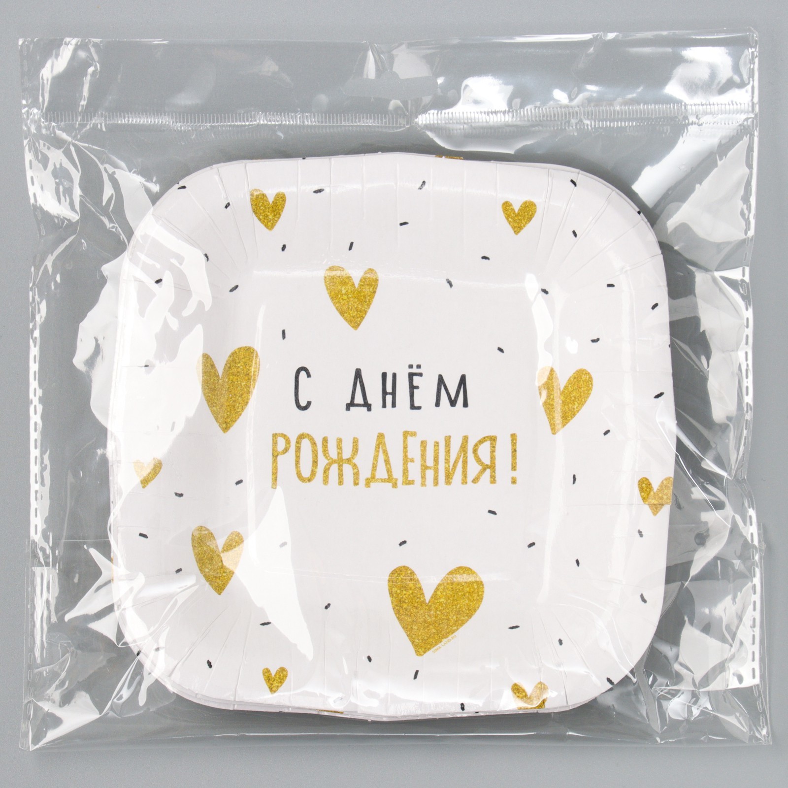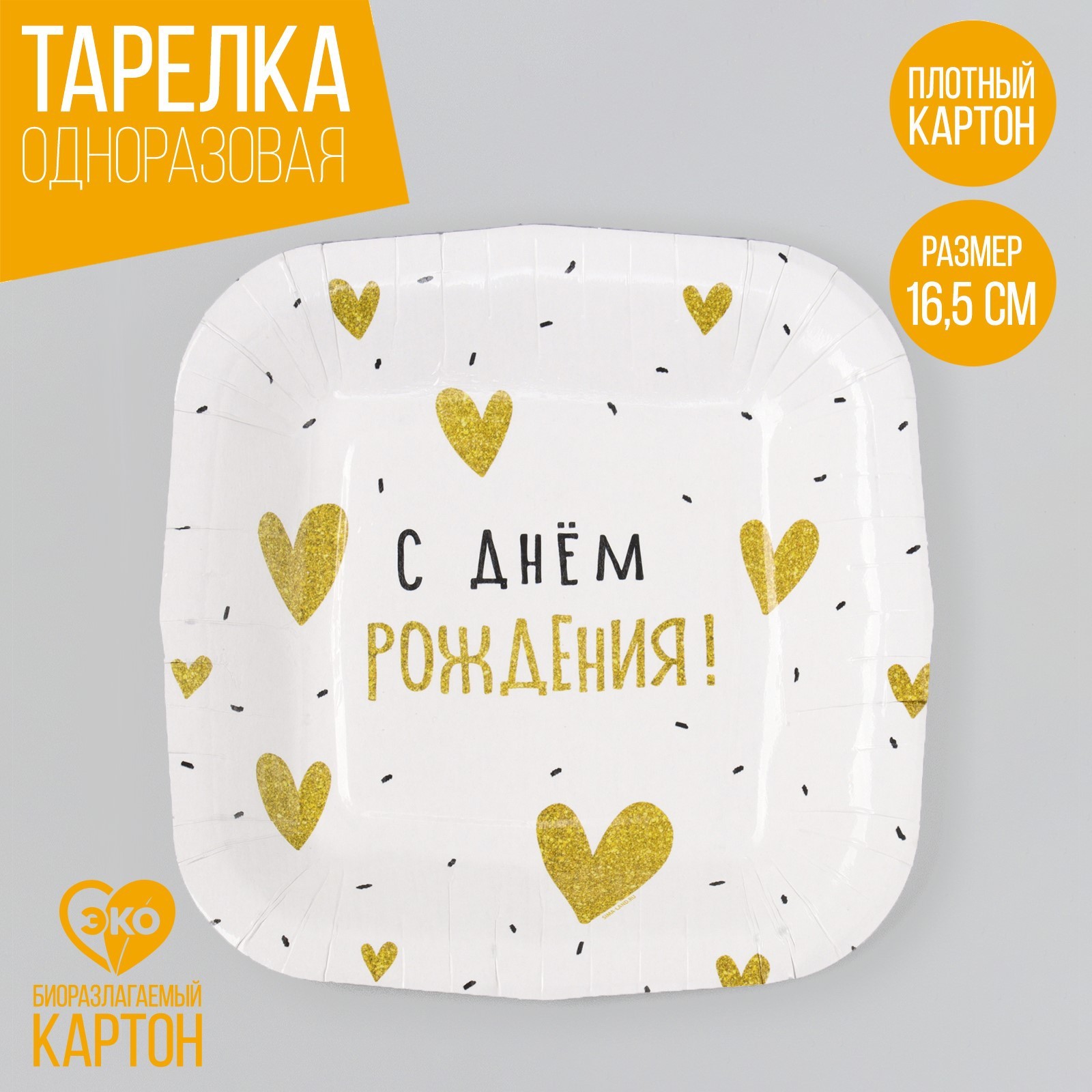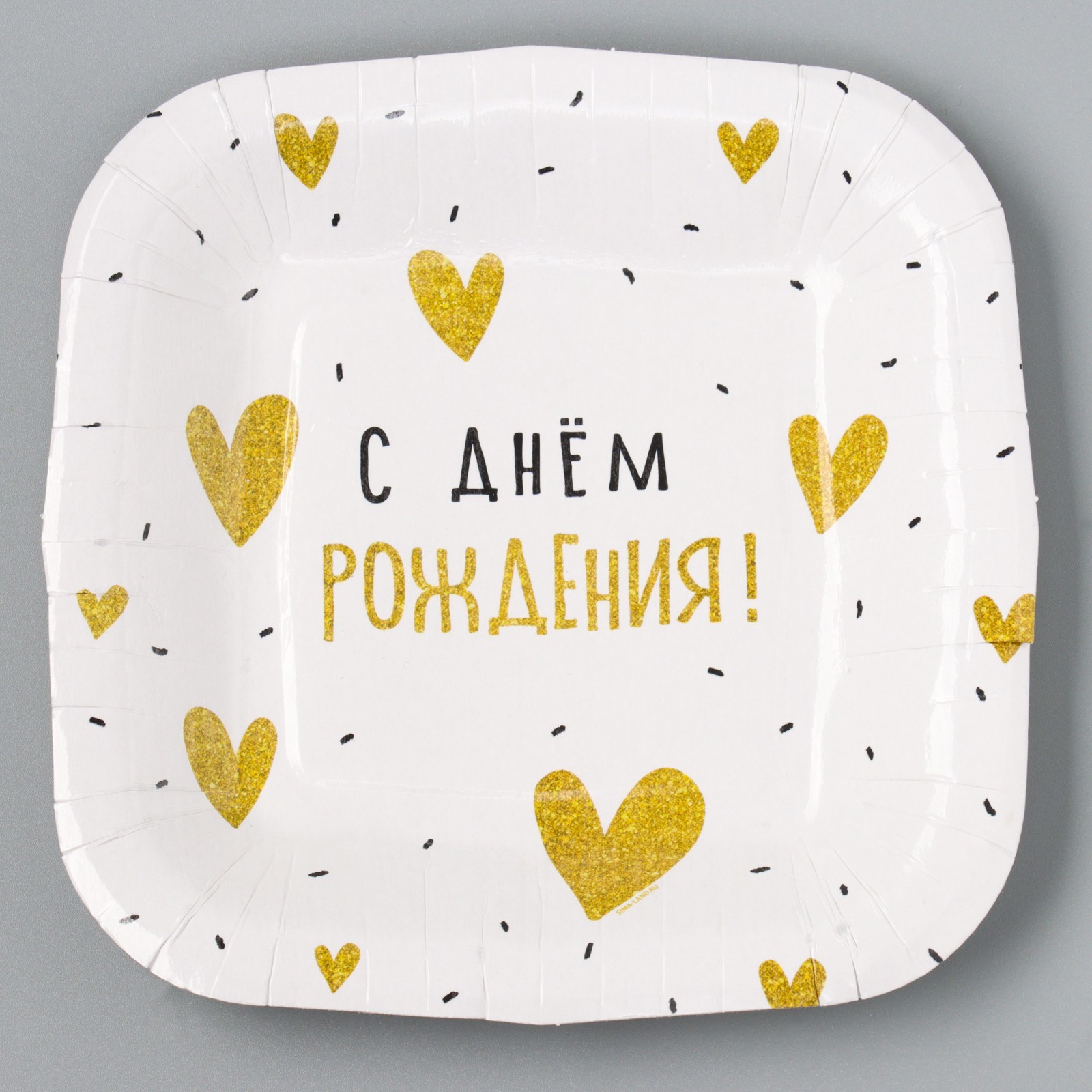 Тарелка одноразовая бумажная квадратная "с днём рождения"сердечки,16,5х16,5 см