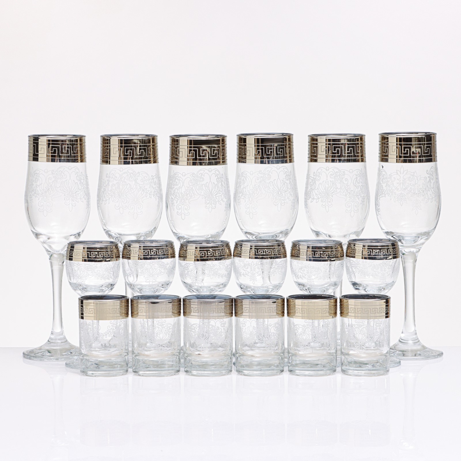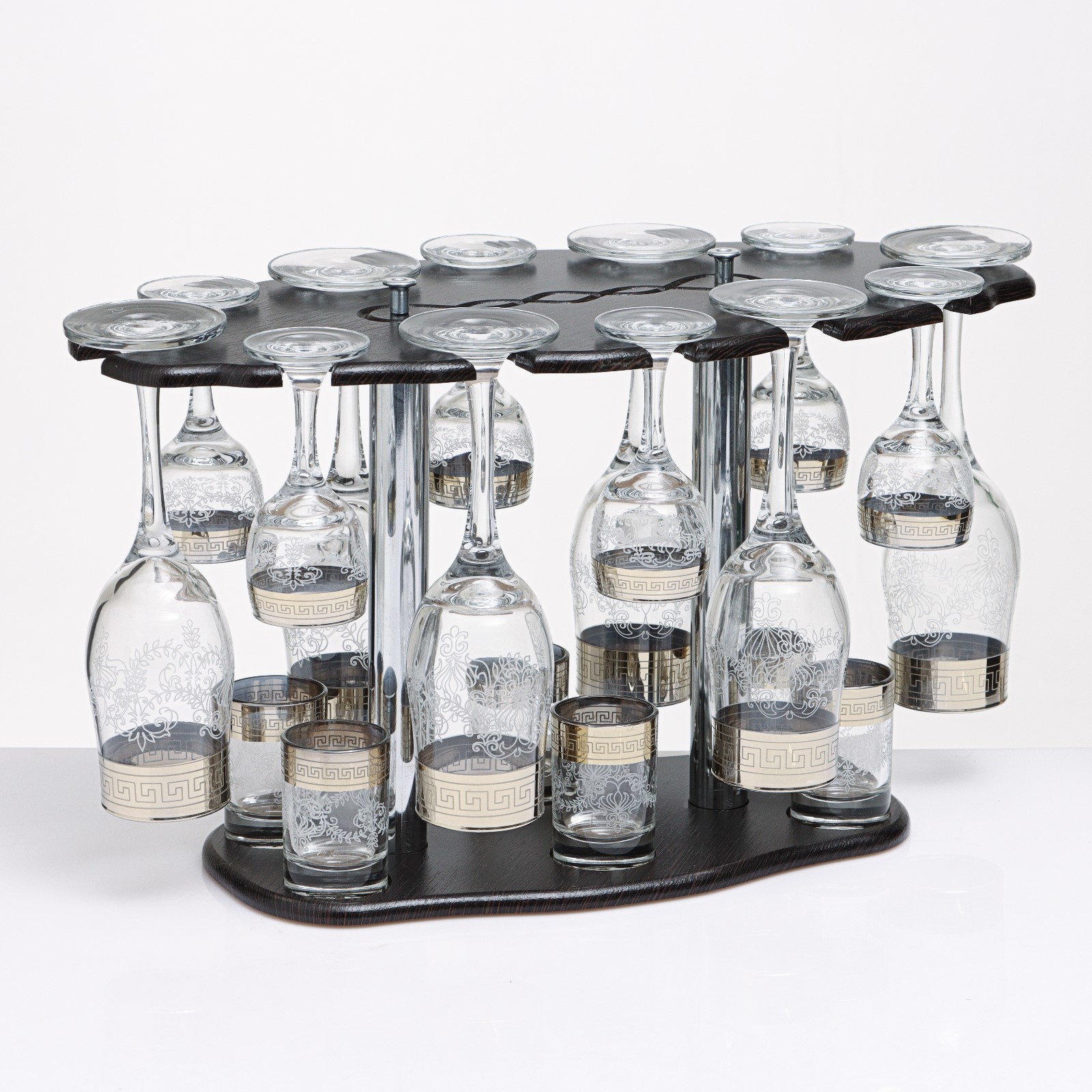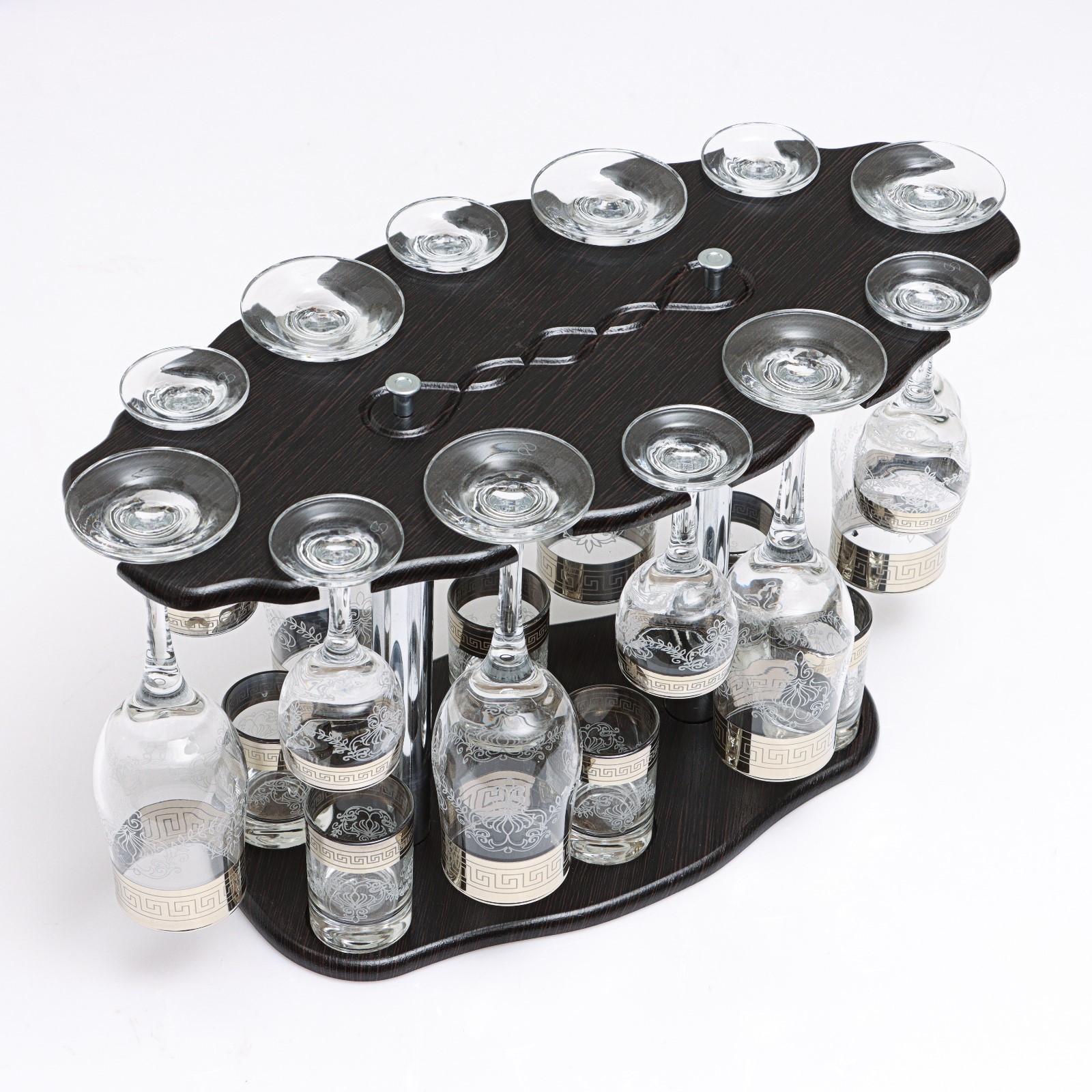 Минибар "гармония" 18 предметов: бокалы 200 мл + рюмка 60 мл + стопка 60 мл. Цвет: Чёрный В наборе, шт.: 18 Количество секций: 18 Объём бокала/рюмки, мл: 60 Назначение: Для вина Назначение: Для шампанского Назначение: Для водки/ликера Материал: МДФ Материал: Стекло Материал: Металл Вид установки: Настольный Температурное ограничение: Нет Посуда в комплекте: Да  развернуть описание ▼