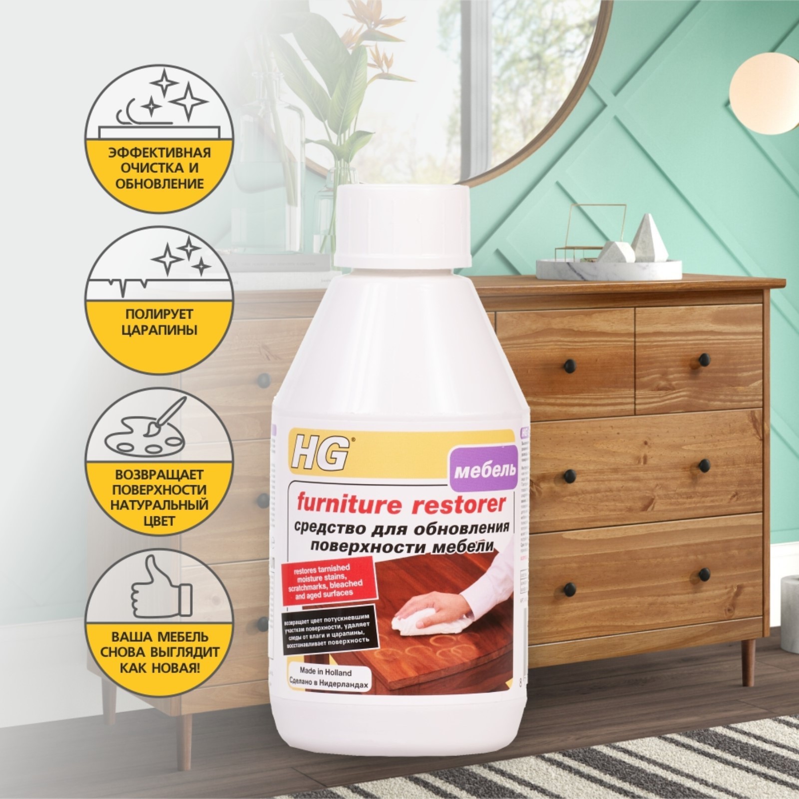 Средство для обновления поверхности мебели hg, 0.25 л. Качественно очищает и обновляет внешний вид мебели. Удаляет загрязнения, следы от стаканов, пятна от воды и алкоголя, заполирует царапины. Возвращает тусклым и полинявшим поверхностям их натуральные цвета. Вес, г/Объём, мл: 250 Форма выпуска: Жидкость Вид: Моющее средство : 0  развернуть описание ▼