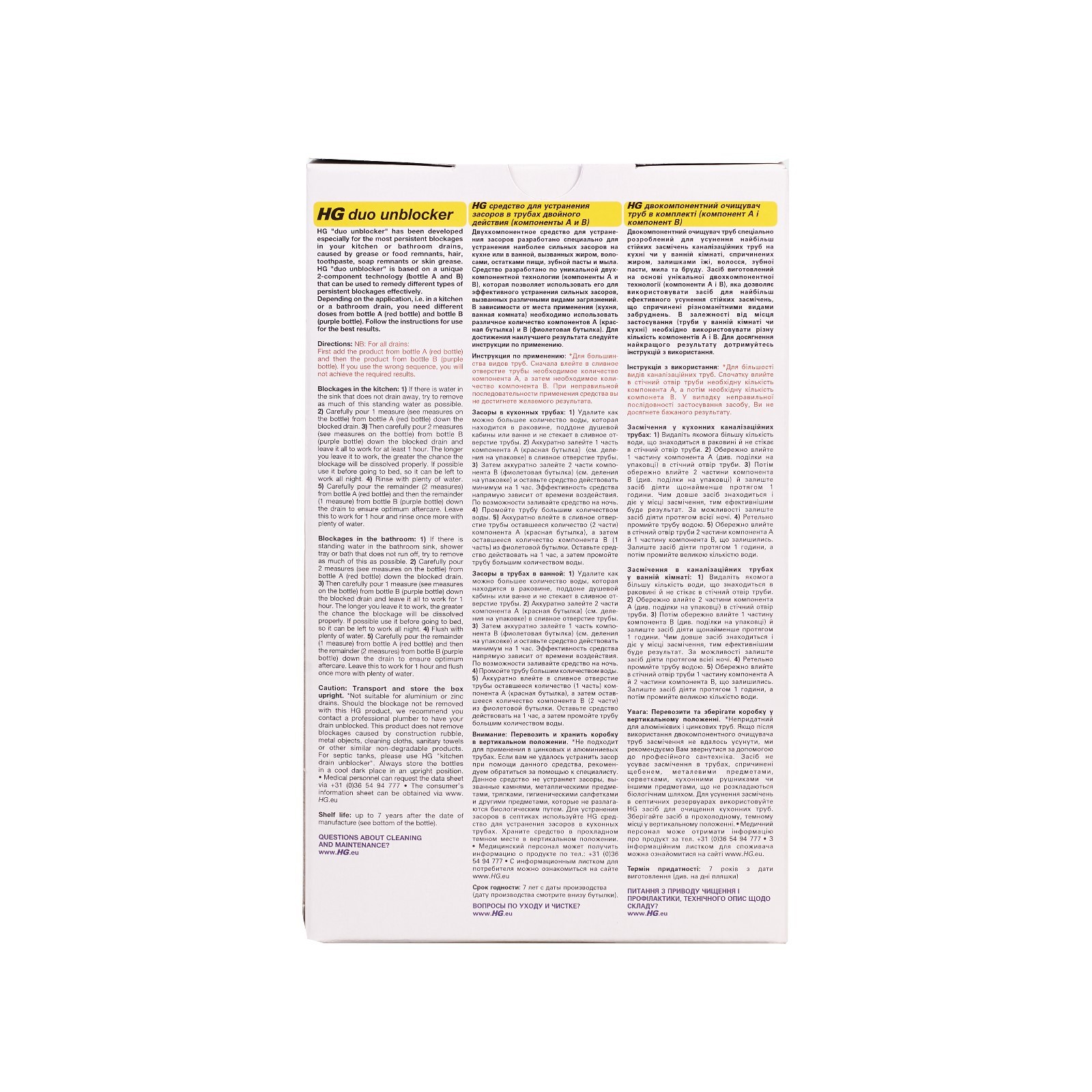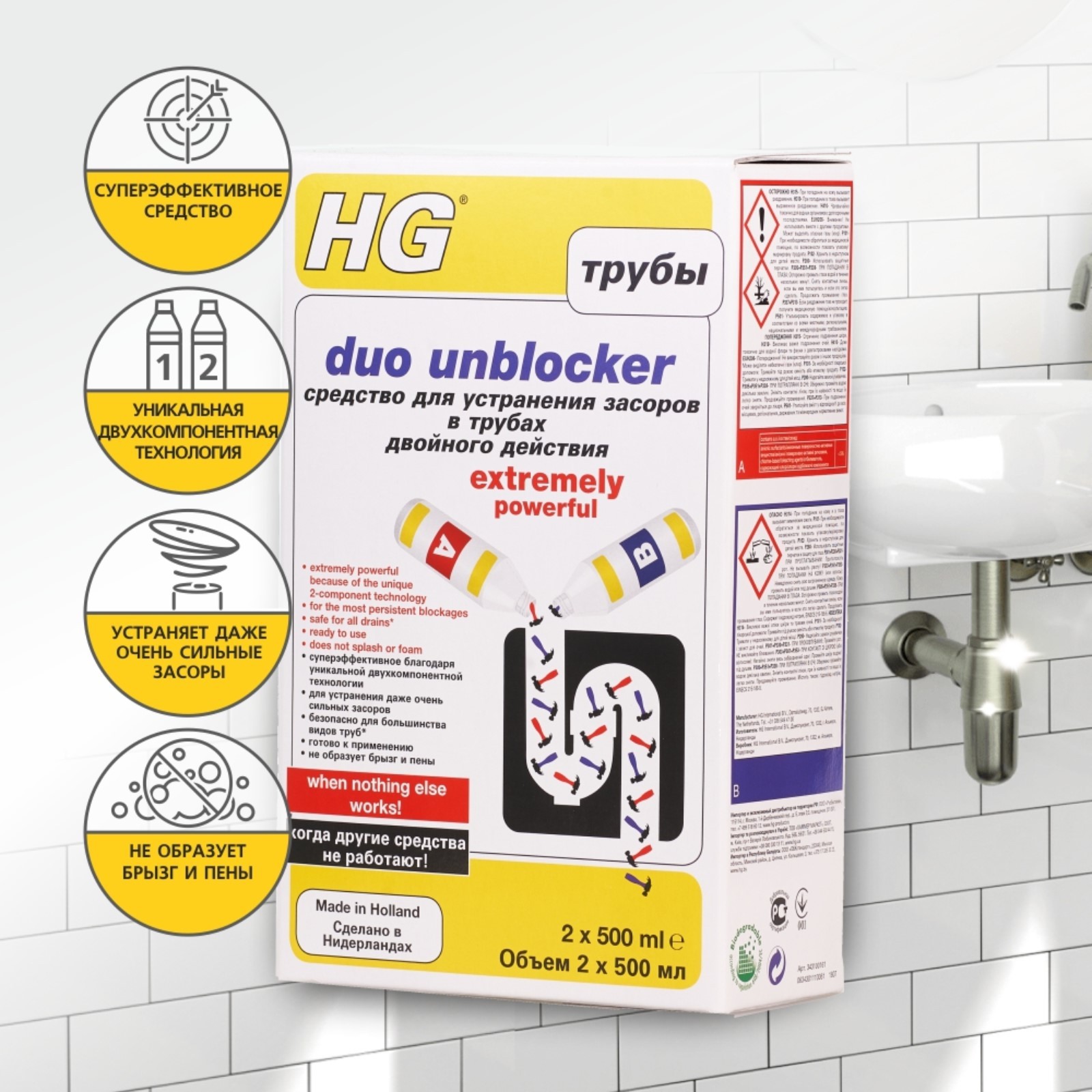 Средство для устранения засоров в трубах двойного действия hg, 2х0.5 л. Уникальное двухкомпонентное средство разработано специально для устранения наиболее трудных засоров жира и остатков пищи (на кухне) и волос, зубной пасты, остатков мыла (в ванной). Помогает легко решить проблему, определив количество средства А или В для использования в данный конкретный момент в зависимости от вида засора. В наборе, шт.: 2 Вес, г/Объём, мл: 500 : 0  развернуть описание ▼