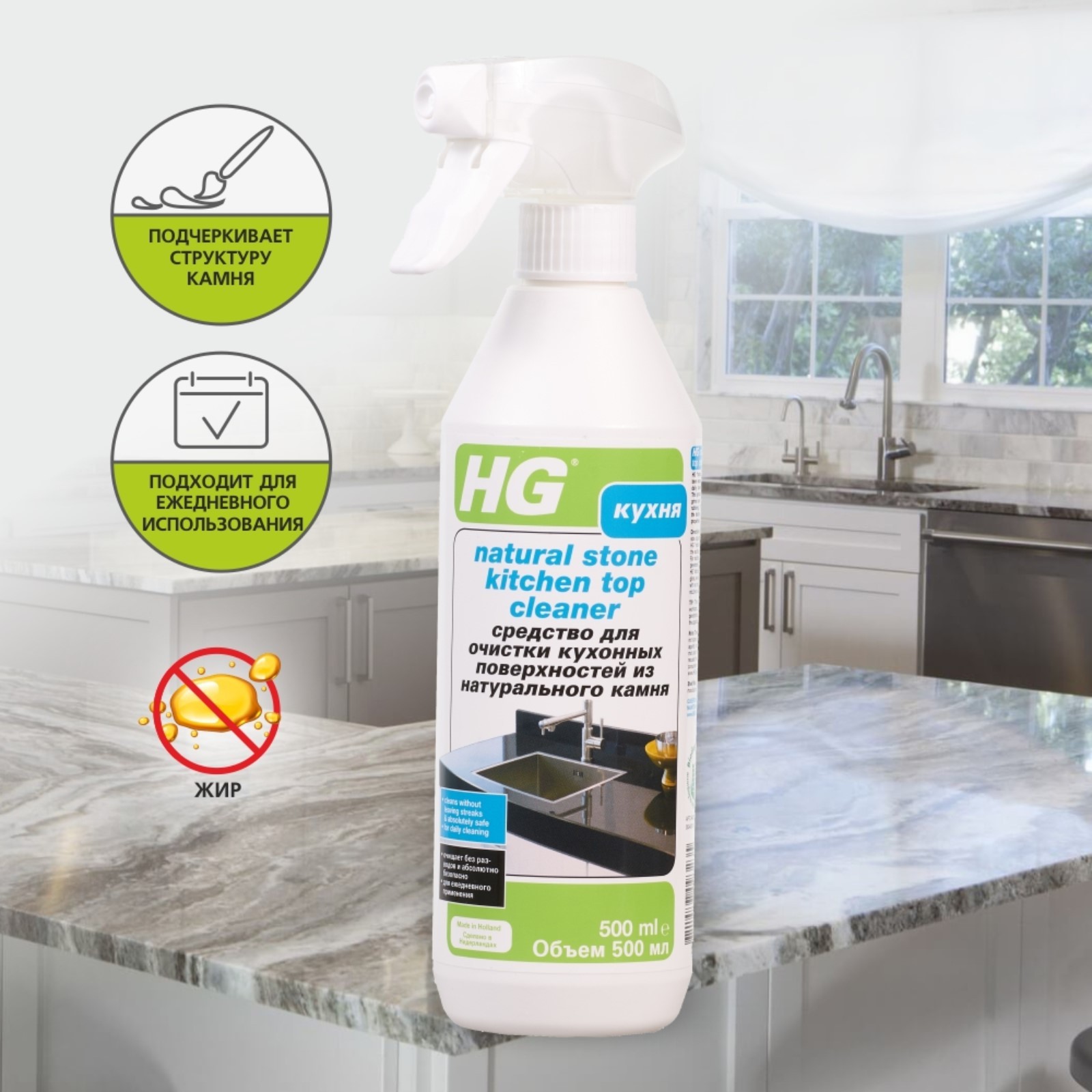 Средство для очистки кухонных поверхностей из натурального камня hg, 0.5 л. Безопасно, быстро и тщательно удалит жир и другие загрязнения со всех типов кухонных поверхностей из натурального камня. Подходит для ежедневного использования. Подчёркивает структуру камня. Объём, мл: 500  развернуть описание ▼
