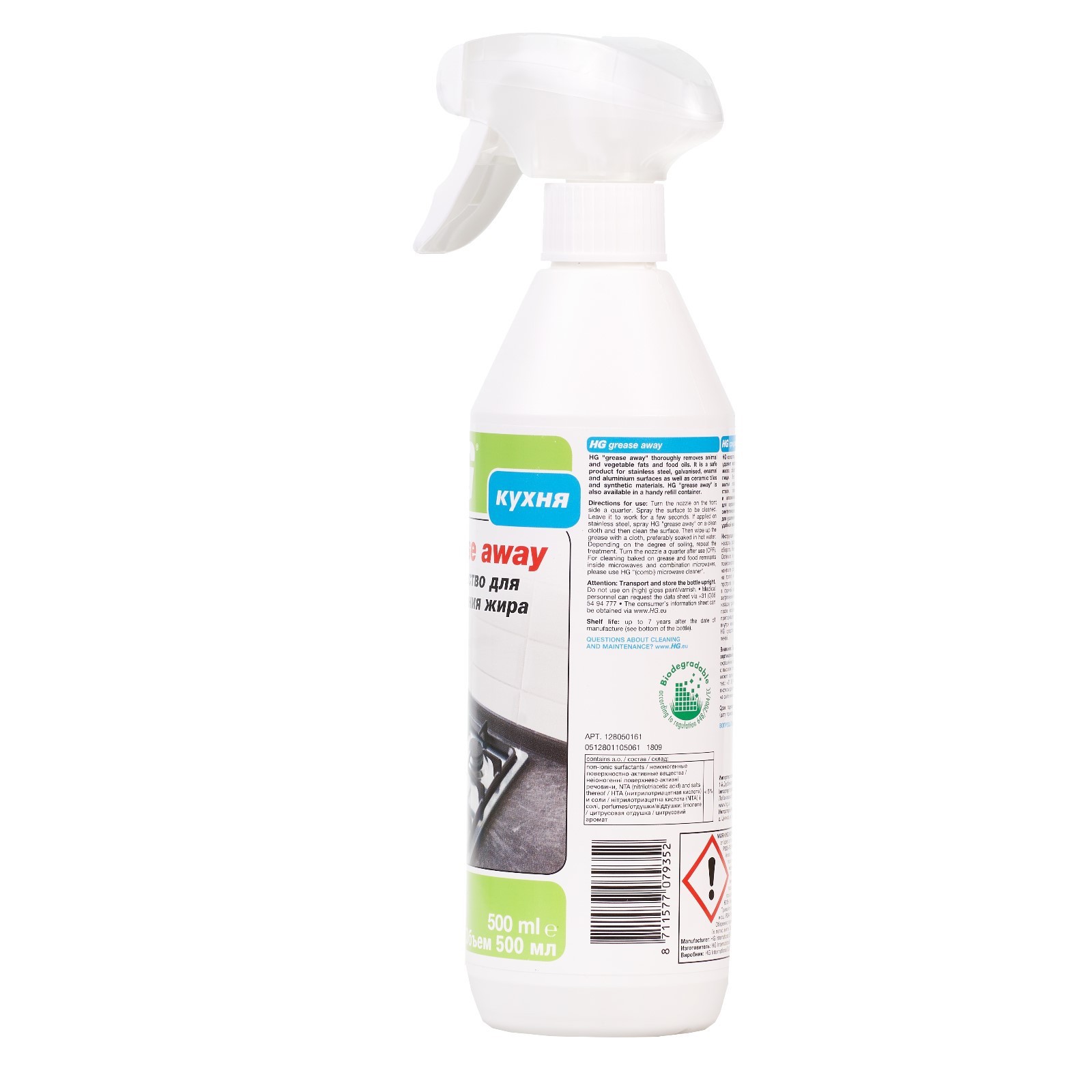 Средство для удаления жира hg, 0.5 л. Прекрасно удаляет животные и растительные жиры и масла, образующиеся при приготовлении пищи. Это безопасное средство для мытья поверхностей из нержавеющей стали, гальванизированных, эмалевых и алюминиевых поверхностей, а также для керамической плитки и изделий из синтетических материалов. Вес, г/Объём, мл: 500  развернуть описание ▼