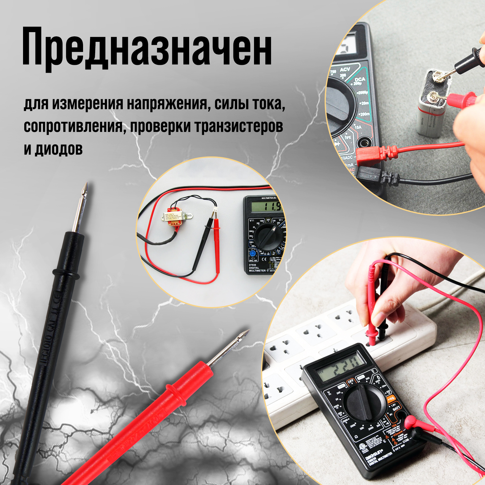 Мультиметр тундра mini, dt-83c, acv/dcv, dca, 200-2м , проверка батареек 9v. DCV – измерение постоянного напряжения ACV - измерение переменного напряжения DCA – измерение постоянного тока hFE – измерение коэффициента передачи транзистора – генератор прямоугольных импульсов о))) – прозвонка – измерение сопротивления Компактный мультиметр предназначен для измерения постоянного и переменного напряжения,постоянного тока, сопротивления, проверки диодов, транзисторов. Метод измерений - АЦП двойного интегрирования с автоматической коррекцией нуля, автоматическим определением полярности и индикацией перегрузки. Полная защита от перегрузок. Предназначен для применения в полевых условиях, лабораториях, мастерских и домашнем хозяйстве. Описание Переключатель режимов работы и пределов.Высокая чувствительность – 100 мкВ.Автоматическая индикация перегрузки - 1.Автоматическое определение полярности постоянного тока или напряжения.Все пределы защищены от перегрузок.Измерение сопротивления от 0,1 Ом до 2 МОм.Измерение h21E транзисторов при Ib=100 мкА.Точность - ±(показание + кол-во единиц счёта).Точность гарантирована в течении 1 года при 23±5° С и относительной влажности менее 75%.Общие характеристики: максимум дисплея: 1999 чисел (3 1/2 разряда) с автоматическим определением полярности и единиц измерения;метод индикации: ЖК дисплей;метод измерений: АЦП двойного интегрирования;индикация перегрузки: 1 в старшем разряде;скорость измерений: 2-3 измерения в сек.;макс. синфазное напряжение: 500 В пост./перем. Эфф.скорость измерений: 2-3 измерения в сек.Количество батареек:1|Типоразмер батареек:LR23A|Батарейки в комплекте:Нет|Функции:Измерение силы постоянного тока|Функции:«Прозвонка» провода|Функции:Проверка батареек под нагрузкой|Функции:Проверка диодов|Страна:Китай  развернуть описание ▼