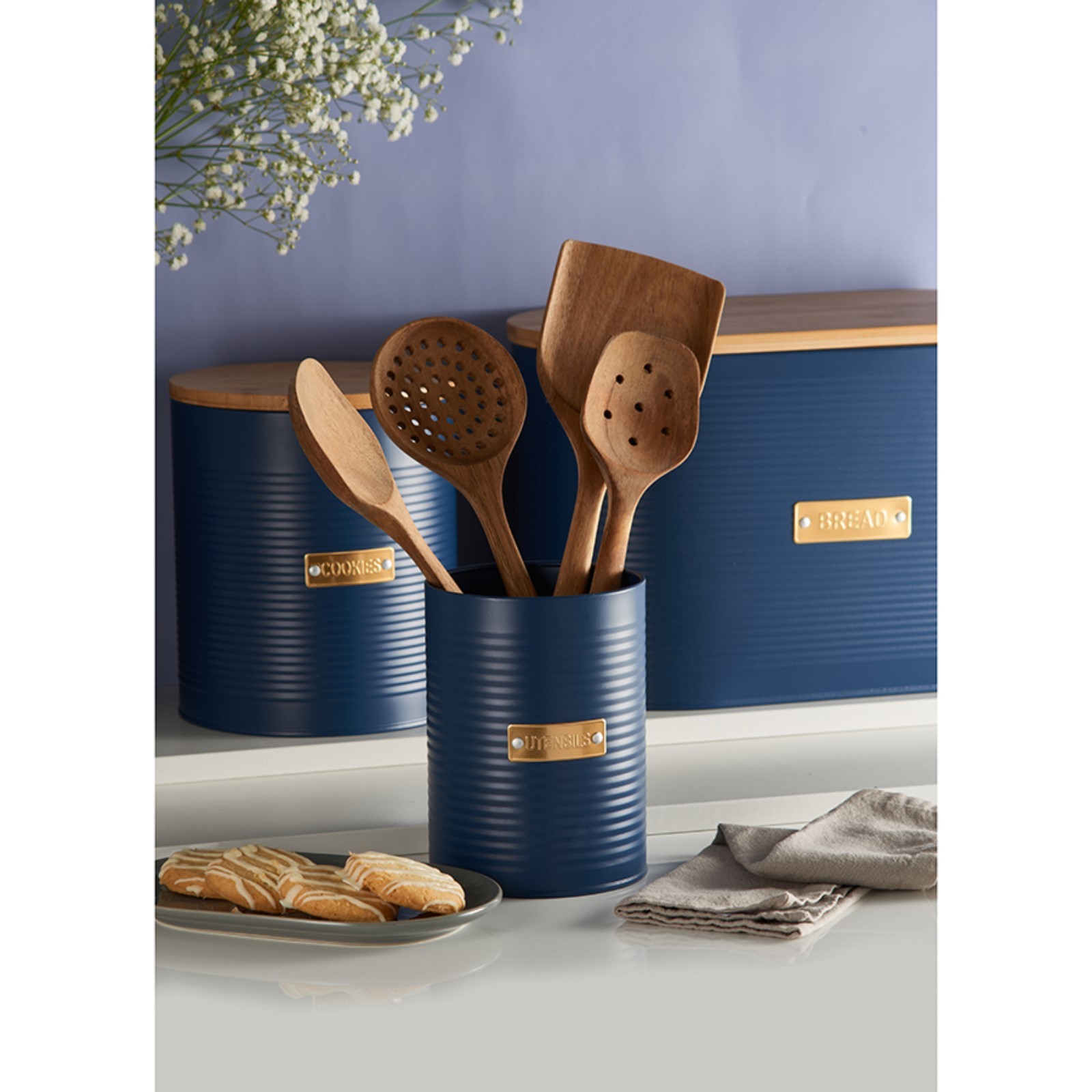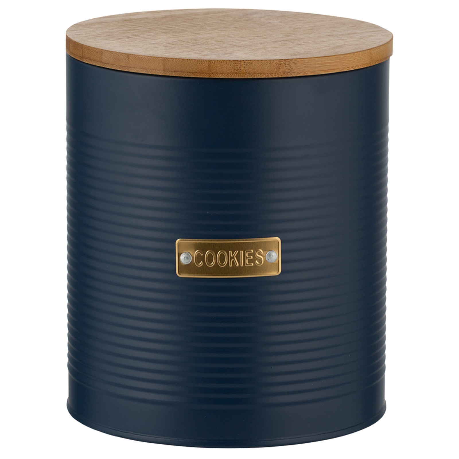 Банка для печенья typhoon otto, 2.6 л, цвет синий. Контейнер выполнен из прочной, устойчивой к коррозии и деформации углеродистой стали. Плотно прилегающая бамбуковая крышка с силиконовым уплотнителем защищает содержимое банки от заветривания и отсыревания. Рельефная поверхность и красивое сочетание золотистого декора с матовым покрытием насыщенного синего цвета делает дизайн интересным. Материалы: углеродистая сталь, бамбук, силикон. Объём: 2. 6 л. Цвет: синий. Перед первым использованием емкость рекомендуется хорошо вымыть вручную в теплой воде с мягким моющим средством. Запрещается применение абразивных материалов и агрессивной бытовой химии. Цвет: Синий Форма: Круглая Объём, л: 2.6 tnved: 7323930000 Материал: Углеродистая сталь Форма: Круг, шар, цилиндр  развернуть описание ▼