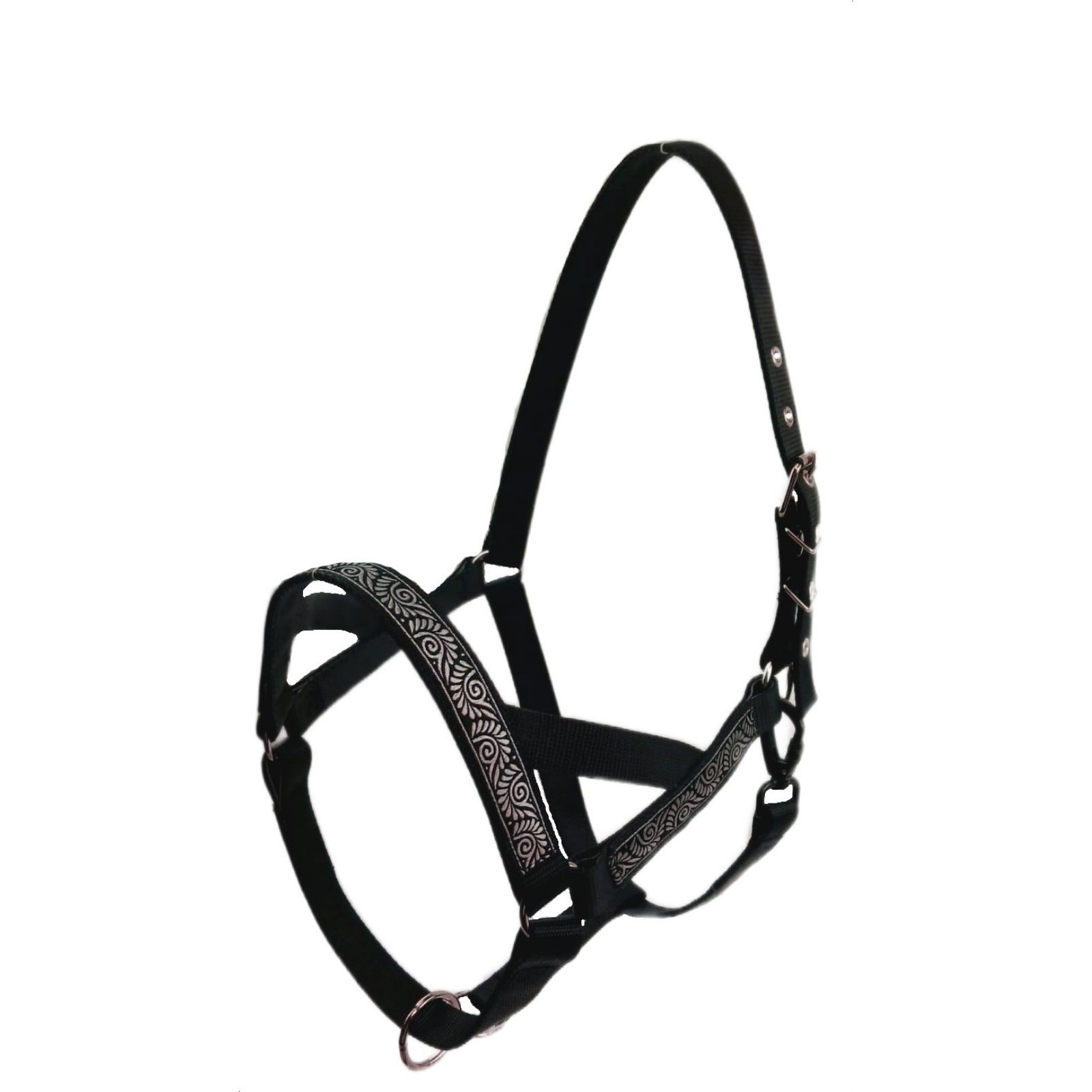 Недоуздок для пони, жеребят, капрон, жаккард, 25 мм, кс405. Недоуздок (узда без удил) предмет конюшенного обихода, предназначен для привязи и выгула лошади. Недоуздок изготовлен из капроновой ленты, сшит в два слоя, украшен прочной жаккардовой лентой с оригинальным орнаментом. Регулировка на затылочном ремне надежной стальной пряжкой, что обеспечивает идеальную посадку на голове лошади. Недоуздок легко снимается и одевается с помощью карабина. Недоуздок для жеребят и пони, обхват шеи на затылок (ОШ) 80-90см, обхват морды (ОМ) 50-55см. Стальная фурнитура. Сварные кольца. Материал изделия: высокопрочная капроновая лента 25 мм. Цвет: Чёрный Материал: Капрон Материал: Жаккард Размер: Pony Вид: Недоуздок  развернуть описание ▼