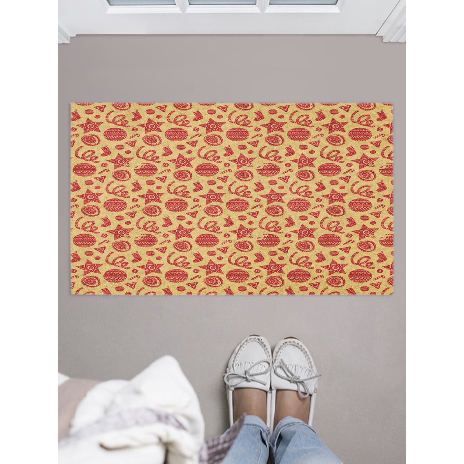 Придверный коврик в прихожую «народные украшения», размер 45х75 см. Цвет: Красный Цвет: Жёлтый Форма: Прямоугольная Длина, см: 45 Ширина, см: 75 Тематика: Праздник Тематика: Новогодняя Материал: Войлок Вид покрытия коврика: Текстильный Тип коврика: С коротким ворсом/гладкие Состав ткани: Полиэстер Форма: Прямоугольник  развернуть описание ▼