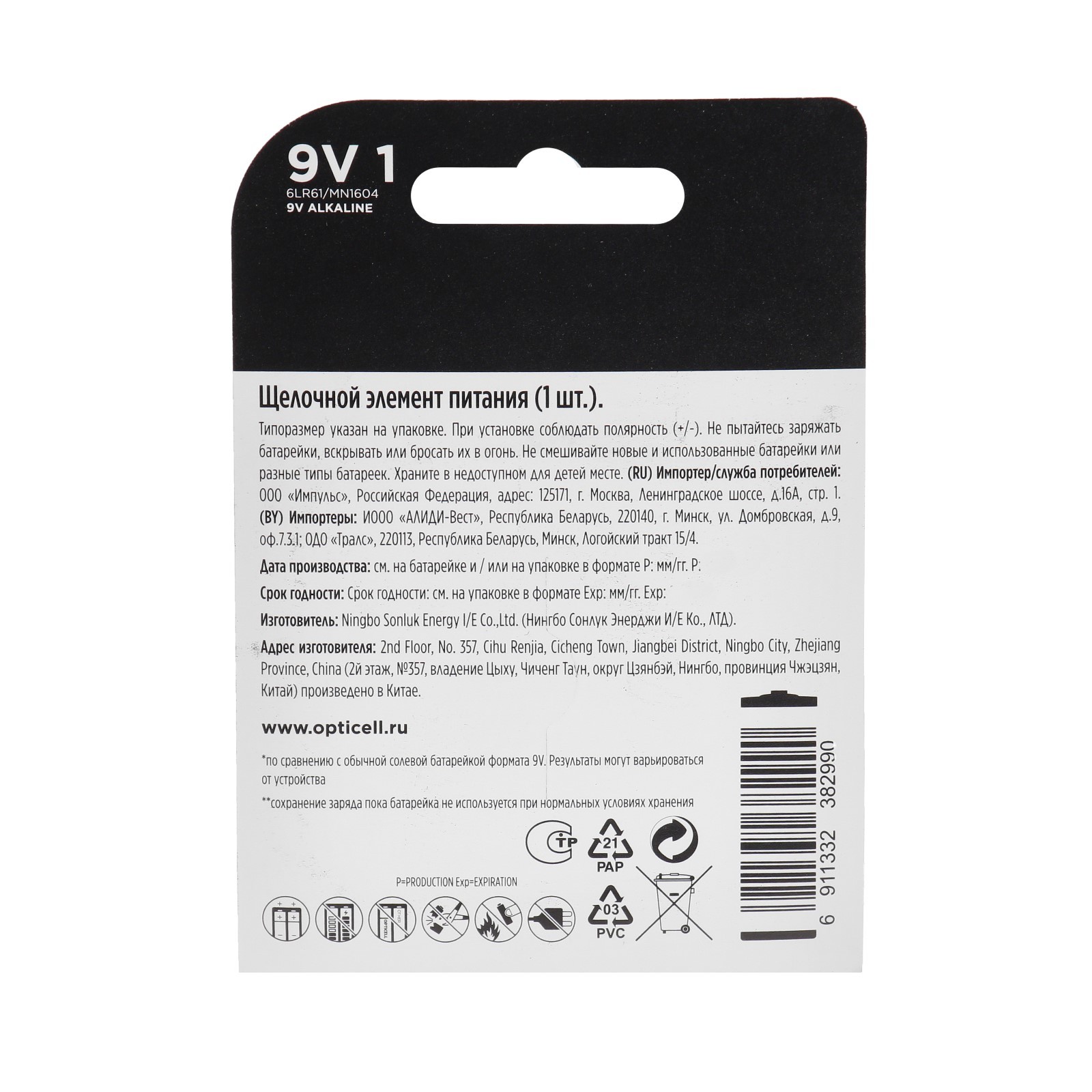 Батарейка алкалиновая opticell, 9v, 6lr61-1bl, крона, 9в, блистер, 1 шт. Батарейки базовой линейки Opticell размера 9V — надежный источник питания для часто используемых устройств, нуждающихся в дополнительной мощности, таких как механизированные игрушки, фонарики, портативные игровые консоли, пульты дистанционного управления и т. д. Работают намного дольше!* (*по сравнению с обычной солевой батарейкой формата 9V. Результаты могут варьироваться от устройства). Срок хранения до 10 лет** (**сохраняет заряд пока батарейка не используется при нормальных условиях хранения). Защита от протеканияНе содержит тяжелых металловвидео parts count: 0 В упаковке, шт.: 1 Вид упаковки: Блистер Типоразмер батареек: Крона Тип батарейки: Алкалиновая Температурное ограничение: Нет  развернуть описание ▼