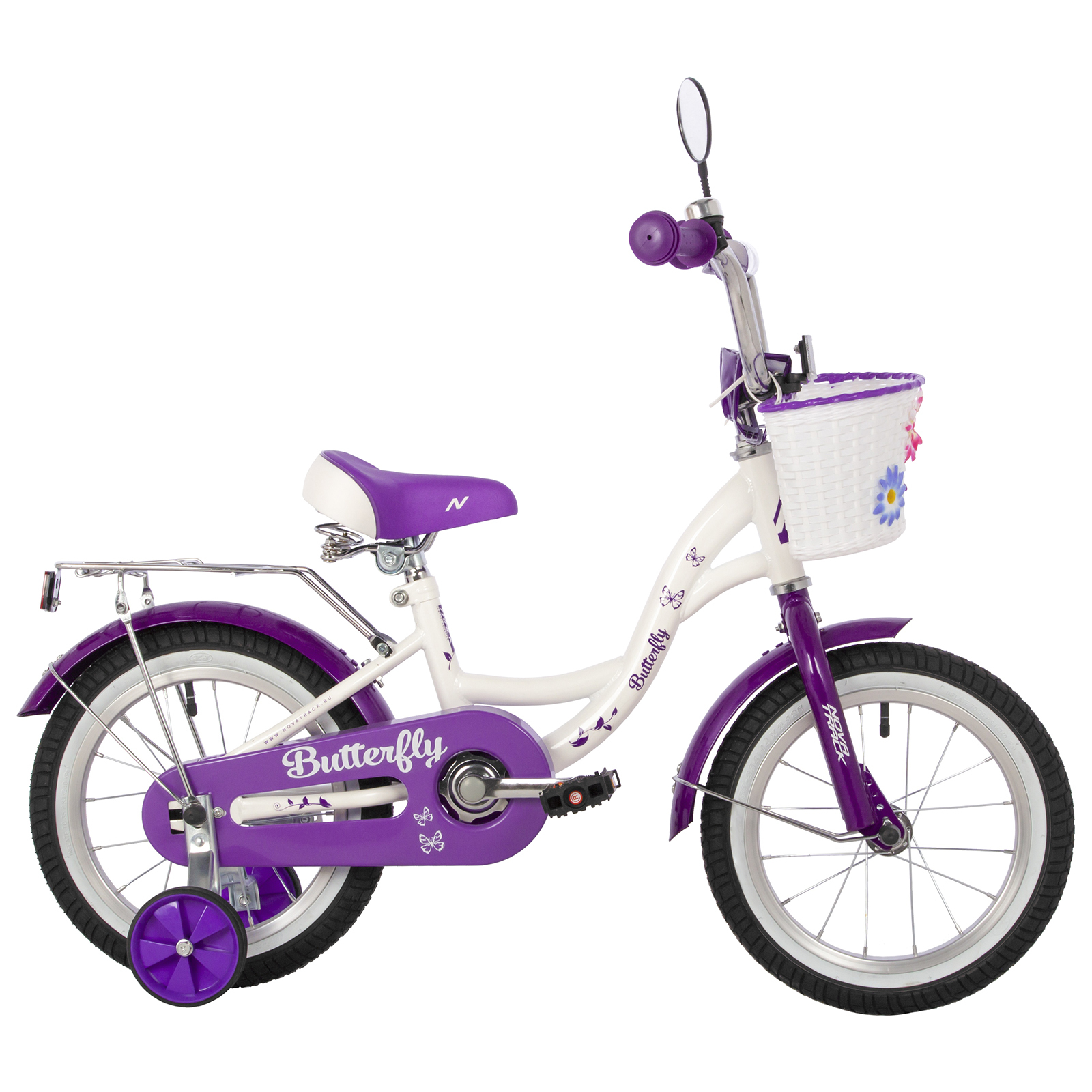 Велосипед 14" novatrack butterfly, цвет белый/фиолетовый. Велосипед подойдёт для девочек от 3 до 5 лет. Модель оснащена корзинкой, багажником, звонком, зеркалом заднего вида и катафотами. Параметры Количество скоростей: 1. Диаметр колёс: 14". Вид обода: однослойный. Материал рамы: сталь. Тип вилки: жёсткая. Тип тормоза: задний ножной. Максимальная нагрузка: 40 кг. Рекомендованный рост ребёнка: 95–105 см. Цвет: Белый Для кого: Для девочки Количество скоростей: 1 Максимально допустимый вес, кг: 40 Модельный год: 2023 Наличие амортизаторов: Без амортизаторов Материал рамы: Сталь Диаметр колёс, дюймы: 14 Передний тормоз: Отсутствует Задний тормоз: Ножной Складная рама: Нет Вид обода: Однослойный Рекомендуемый возраст, лет: 3 - 5 Рекомендуемый рост, см: 95 - 105 Возраст: Детский Подножка: Нет Вид: Универсальный Вид: Городской Багажник: Да Корзина: Да Температурное ограничение: Нет Дополнительные боковые колёса: Да  развернуть описание ▼