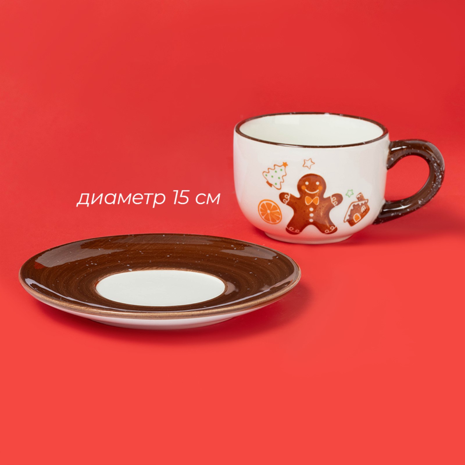 Чайная пара новогодняя доляна «имбирные человечки», кружка 12.5 9.3 6.5 см, блюдце d=15 см. Чайная пара с новогодним дизайном — уютный аксессуар для праздничного чаепития. В комплект входят кружка объёмом 250 мл и блюдце диаметром 15 см, оформленные в бело-коричневой гамме с рисунком имбирных человечков. Такая подача делает утренний кофе или вечерний чай частью зимней сказки. Набор выполнен из прочной доломитовой керамики — материал долговечен и безопасен для здоровья. Праздник в каждой детали Рисунок с новогодними мотивами добавляет изделиям атмосферу доброты и ожидания чуда.Кружка и блюдце повторяют тематический стиль, создавая целостный образ сервировки.Подставка для ложки входит в комплект — всё необходимое собрано в одном наборе.Гладкая поверхность без матовости придаёт паре лаконичности и блеска.Белый и коричневый оттенки работают на зимнюю стилистику и легко сочетаются с другими элементами стола.Когда чай становится событием Этот набор создан для тех, кто любит встречать Новый год с атмосферой и деталями, которые радуют глаз. Он подойдёт как для домашнего использования, так и в качестве подарка. Идеальный выбор для тех, кто украшает праздник начиная с посуды и верит в волшебство, спрятанное в простых моментах. Цвет:Коричневый|Цвет:Белый|Количество персон:1|Объём, мл:250|Тематика:Новогодняя|Рисунок:Да|Материал:Керамика (Доломит)|Наличие подставки:Да|Можно мыть в посудомоечной машине:Нет|Можно использовать в СВЧ-печи:Нет|Текстура:Гладкая|Особенности:Без особенностей|Матовая поверхность:Нет|Страна:Китай  развернуть описание ▼