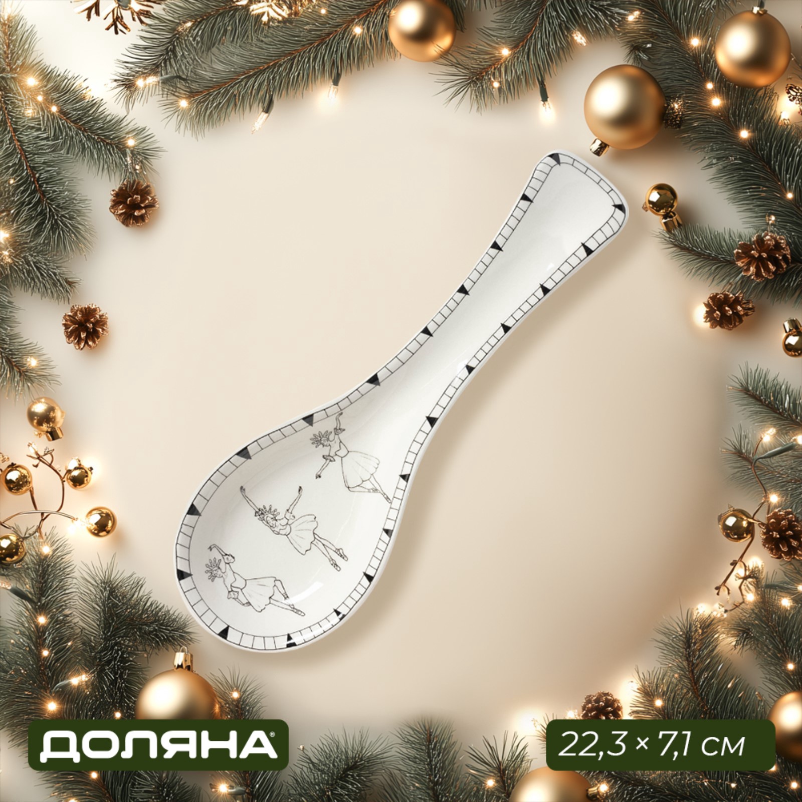 Подставка под ложку новогодняя доляна «волшебная сказка», 22.3 7.1 2.5 см, белая. Представляем вам новогоднюю подставку для ложки Доляна «Приближение чуда». Эта удивительная подставка выполнена из керамики в белом цвете, что придает ей элегантность и праздничный вид. Милый и атмосферный дизайн рисунка принесет уют и праздничное настроение в ваш дом. Данная подставка не только красива и стильна, но и практична. Она поможет вам сохранить порядок на столе, предотвратит разливание жидкости и позволит удобно разместить ложку в процессе приготовления пищи. Благодаря качественным материалам, из которых изготовлена подставка, она легко моется и долго хранит свой первоначальный вид. Новогодняя подставка станет отличным подарком для друзей или близких на предстоящие праздники. Цвет:Чёрный|Цвет:Белый|Рисунок:Да|Символ года:Нет|Тематика праздника:Новый год|Материал:Керамика (Доломит)|Страна:Китай  развернуть описание ▼