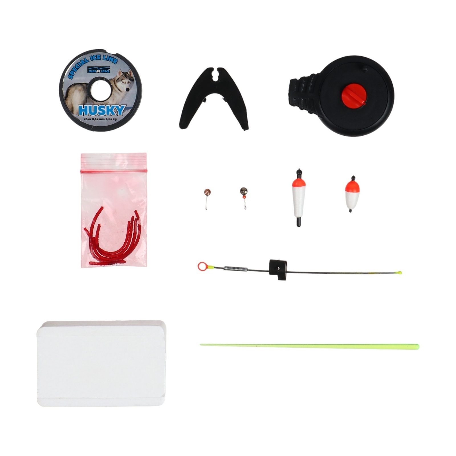 Удочка балалайкаНожка под удочкуШестик для удочкиЛеска зимняяМотыльницаМотыль искуственныйМормышка 2 шт. Поплавок зимний 2 шт. Сторож для зимней рыбалки 1 шт.