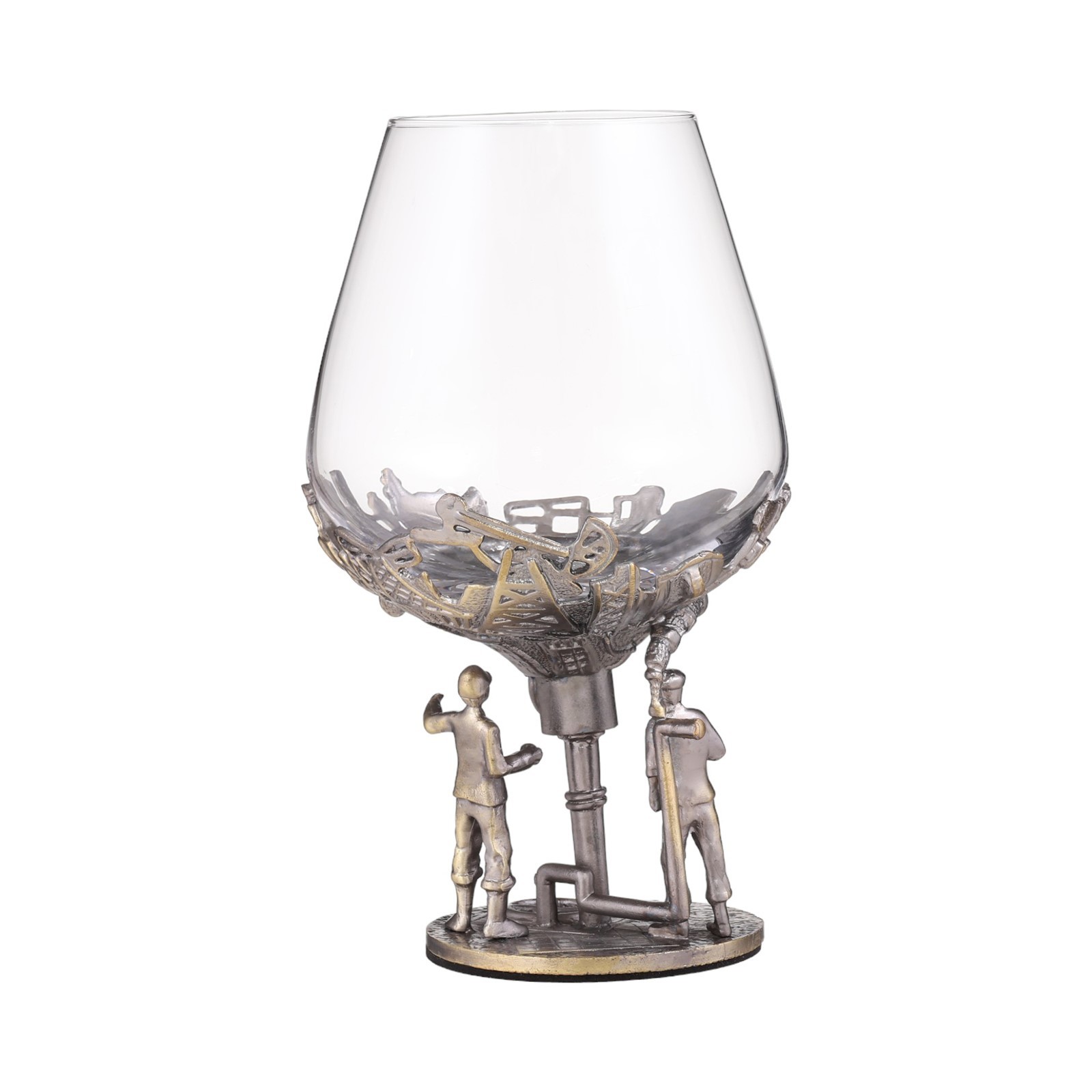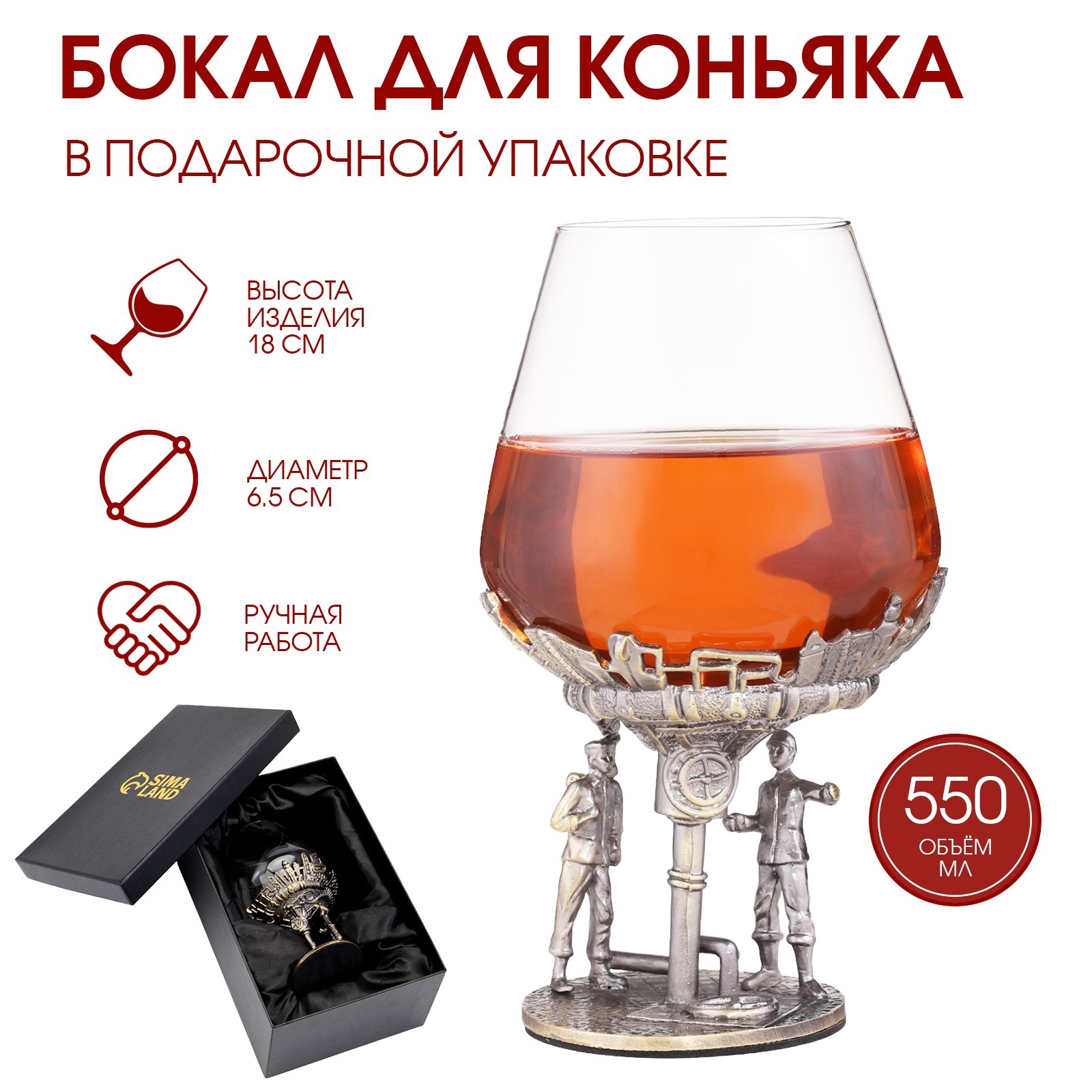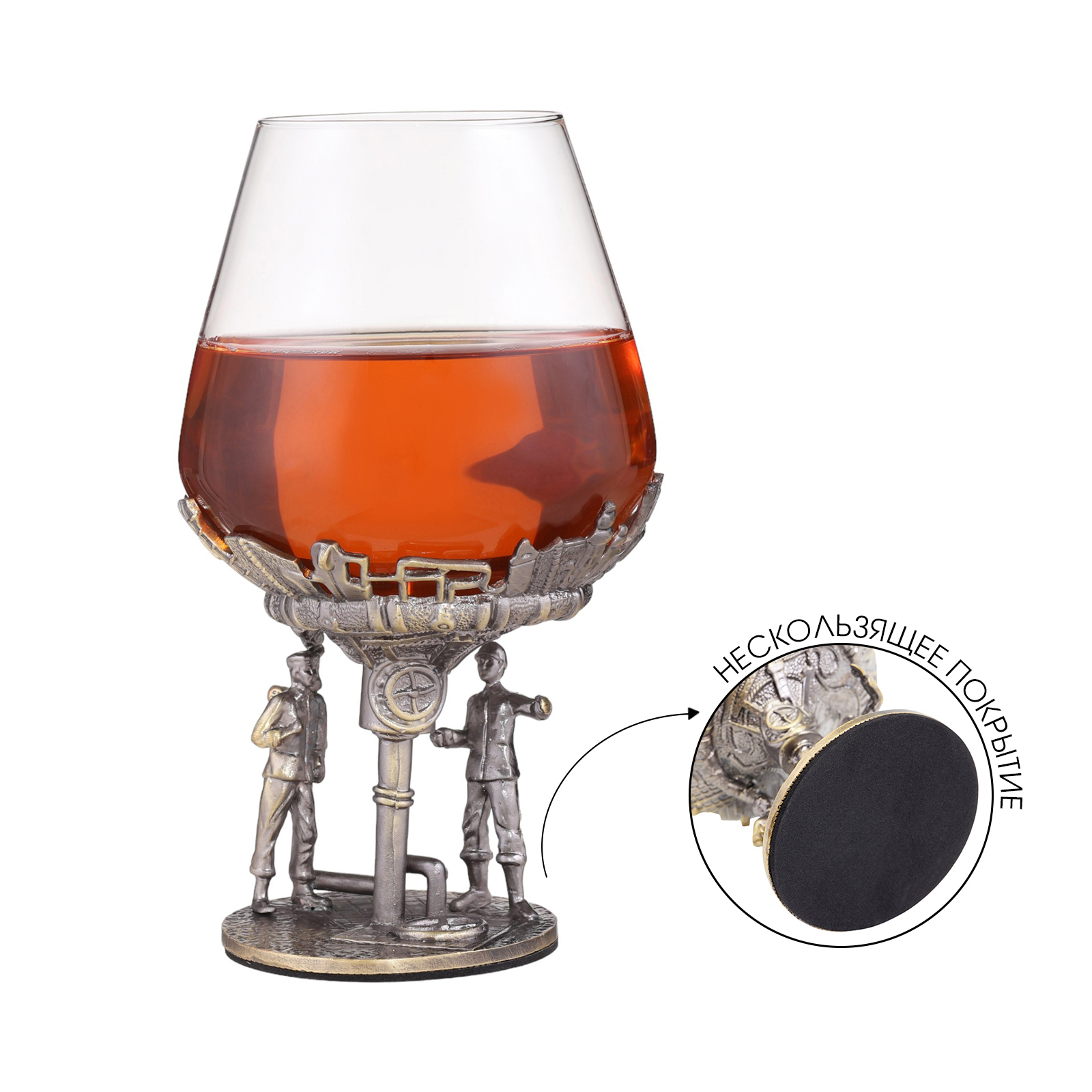 Бокал для коньяка "нефтянники", 550 мл, бронза. Бокал для коньяка "Нефтяники" - это изысканный и стильный аксессуар, который станет прекрасным дополнением к вашей коллекции посуды. Имеет классическую форму снифтера, которая идеально подходит для подачи коньяка. Снифтер имеет широкое основание, узкую горловину и короткую ножку. Такая форма позволяет коньяку медленно нагреваться от тепла руки, раскрывая все свои ароматы и вкусовые качества. Уникальная форма и дизайн, придают посуде особую элегантность. Гравировка обеспечивает максимальную точность и детализацию изображения. На ножке бокала изображены два нефтяника в касках и рабочей одежде на фоне множества труб, вентилей и вышек. Они обсуждают какой-то рабочий момент. Символизируют изысканность, стиль и мужественность. Они олицетворяют силу, уверенность и решительность, которые свойственны настоящим мужчинам. Объем бокала составляет 550 мл, что является оптимальным для подачи коньяка. Такой объем позволяет насладиться напитком в полной мере. Размеры также продуманы до мелочей: общая высота - 18 см, высота самого бокала – 10 см, верхний диаметр фужера - 6. 5 см, нижний диаметр - 7. 3 см, обеспечивают удобство использования. Стакан изготовлен из высококачественного стекла и цинкового сплава, что обеспечивает его прочность. Стекло позволяет любоваться цветом содержимого, а ножка из цинкового сплава делает бокал устойчивым и долговечным. Стекло не впитывает запахи и не меняет вкус напитка. Легко моется и сохраняет свой первоначальный вид на протяжении долгого времени. Имеет противоскользящее покрытие, что предотвращает скольжение бокала на поверхности, снижает риск падения и опрокидывания. Защищает поверхность стола от царапин и повреждений, вызванных соприкосновением с дном сосуда. Бокалы пригодятся для эстетичной подачи и употребления различных напитков. Могут быть частью сервировки стола и подчеркивать атмосферу мероприятия. А также служить украшением интерьера. Бокал также хорошо подходит для подачи красных, белых, розовых и игристых вин. Объем бокала позволит в полной мере оценить аромат и вкус вина, особенно если это сложные и насыщенные сорта. Бокал "Нефтяники" станет отличным подарком настоящему мужчине на любой значимый праздник. Не останется незамеченным среди ценителей коньяка и коллекционеров. Он будет радовать своего владельца красотой и функциональностью на протяжении многих лет. Подчеркнет индивидуальность и вкус своего обладателя, став незаменимым атрибутом любого праздничного стола. Поставляется в подарочной коробке. Размер коробки 26. 2 х 17 х 11. 6 см. Цвет: Бронзовый В наборе, шт.: 1 Объём, мл: 550 Назначение: Для коньяка Материал: Цинковый сплав Материал: Стекло Можно мыть в посудомоечной машине: Нет Текстура: С рельефом Особенности: Гравировка  развернуть описание ▼