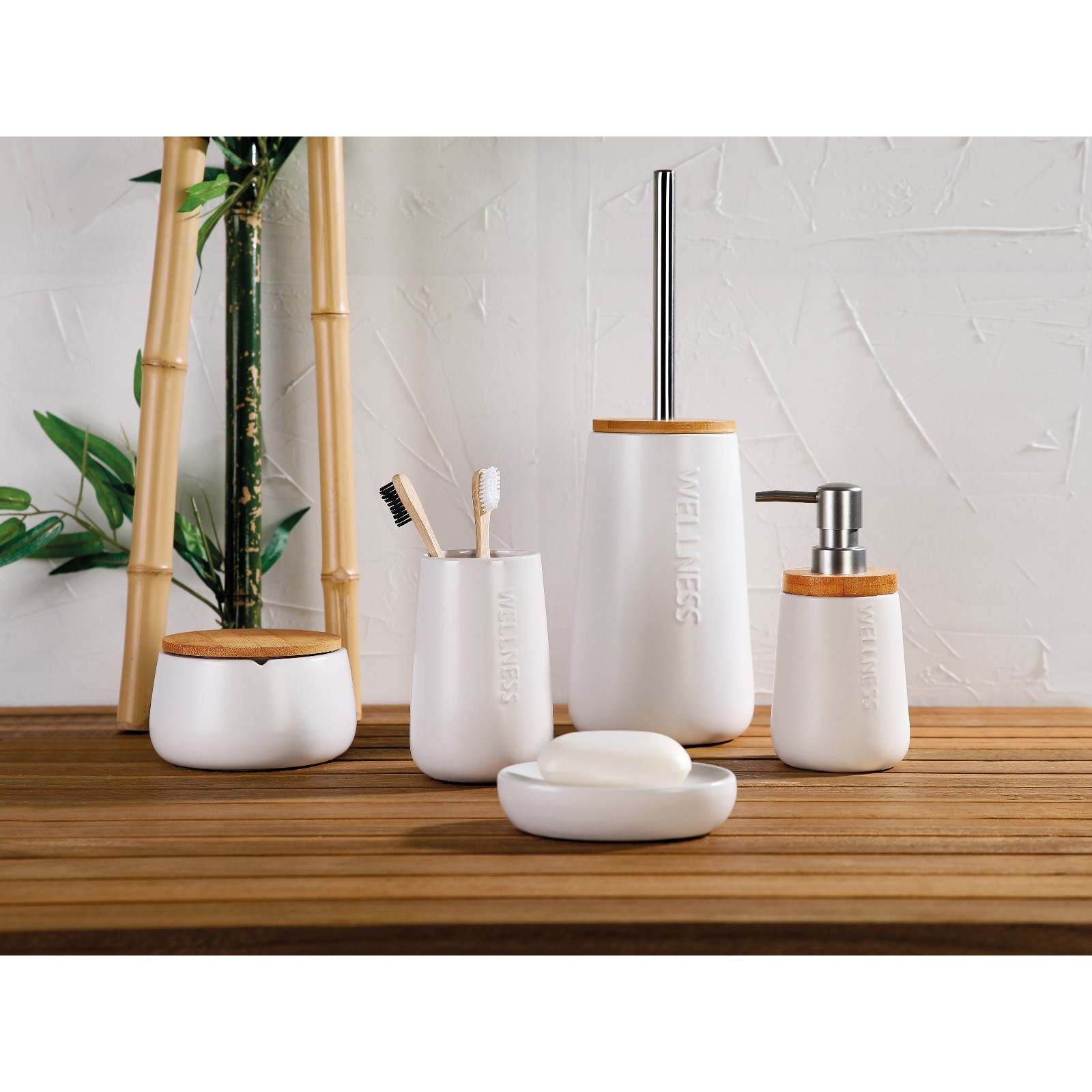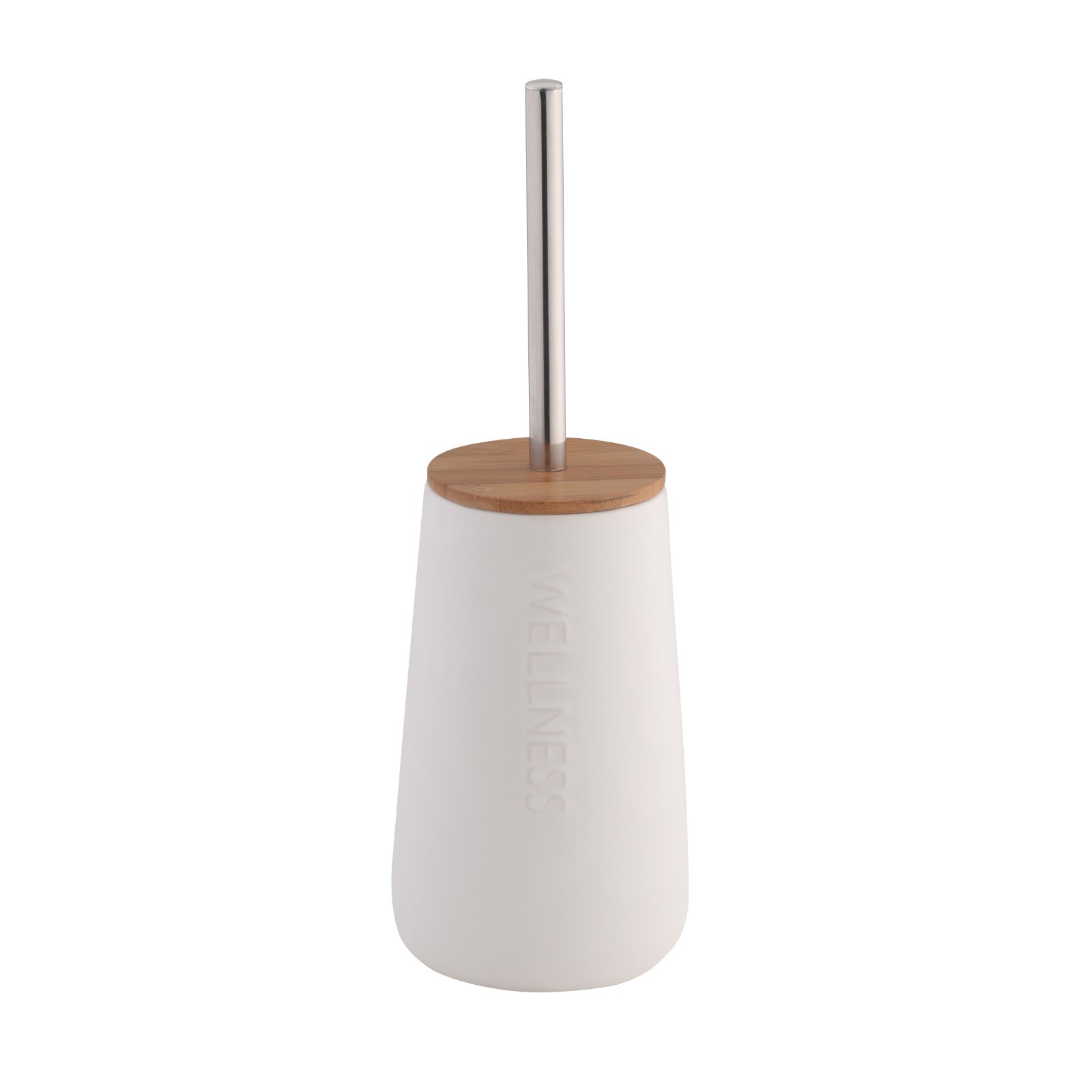 Array. Гарнитур для туалета Axentia Bonja Wellness, из белого доломита с крышкой из бамбука. Изготовлен из натурального доломита белого цвета, с тисненой надписью Wellness и бамбуковой крышкой, ручка щётки из нержавеющей стали, головка щётки чёрного цвета. Идеально сочетается с другими предметами из серии для ванных комнат Axentia Bonja Wellness. Размеры гарнитура: D=11, 5 см, высота 35 см. Размеры щётки: D=насадки-щётки 8 см, высота 8 см, D=резьбы 13 мм. Корпус выполнен из натурального доломита белого цвета, в щётке сочетаются нержавеющая сталь и пластик. Благодаря утонченному дизайну комплект вписывается в любую обстановку и может быть прекрасно дополнен другими предметами для ванных комнат из серии Bonja Wellness. Цвет: Белый Материал ручки: Металл Материал подставки: Керамика Вид: Ёршик с подставкой Вид установки: Напольный  развернуть описание ▼