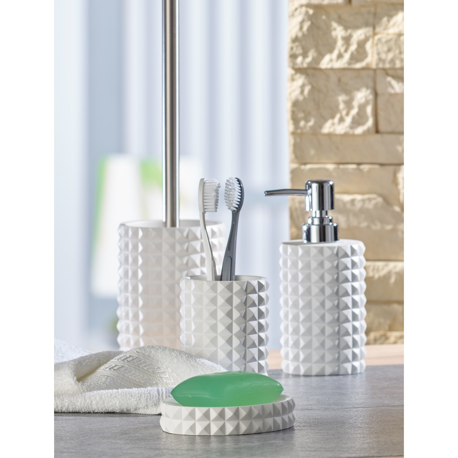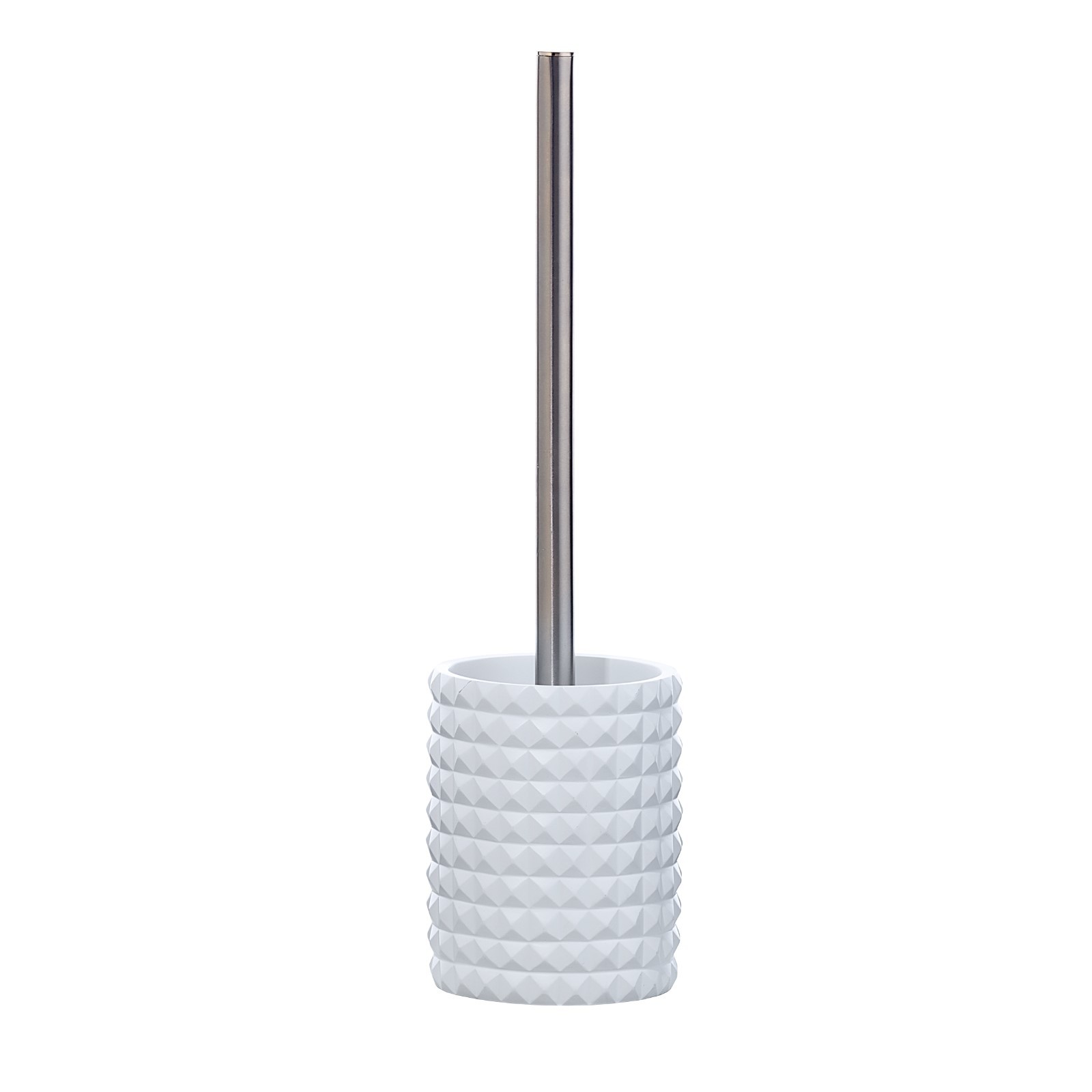 Array. Гарнитур для туалета Axentia Vegas - стильный и функциональный аксессуар из белого полирезина. Включает отдельно стоящий держатель ершика с привлекательной структурой и нержавеющей стальной ручкой. Устойчив к ультрафиолетовому излучению и погодным условиям. Компактный и легкий, подходит для размещения в углу туалета. Размеры: 10 см в диаметре и 35 см в высоту для гарнитура, 7 см в диаметре и 9 см в высоту для щетки. Цвет: Белый Материал ручки: Сталь Материал подставки: Полирезин Вид: Ёршик с подставкой Вид установки: Напольный  развернуть описание ▼