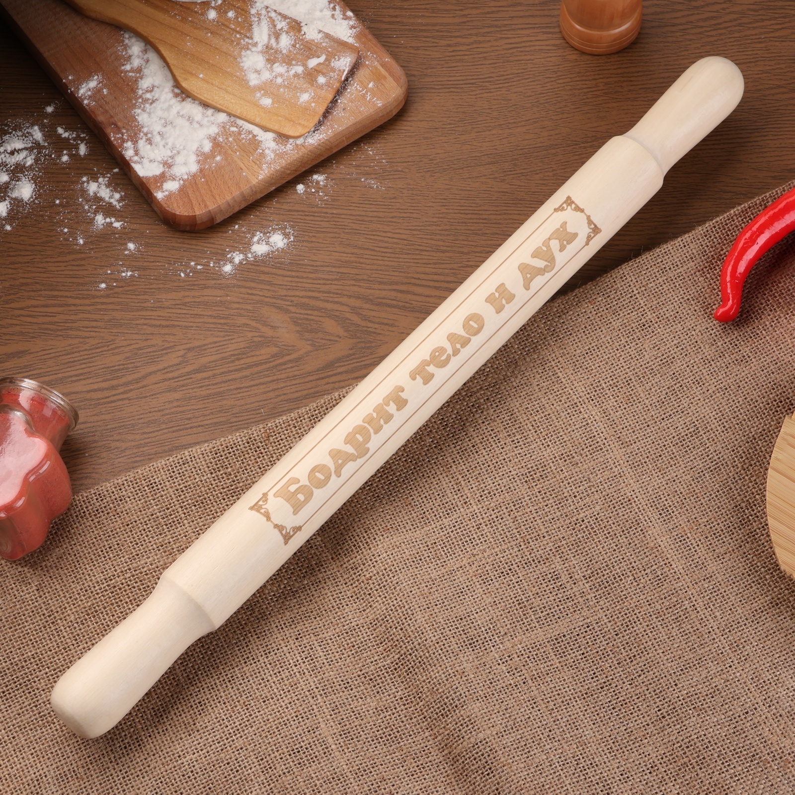 Скалка большая с гравировкой "бодрит тело и дух", 49см, D=36 мм