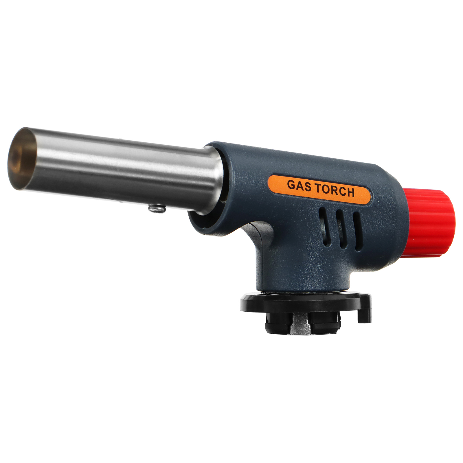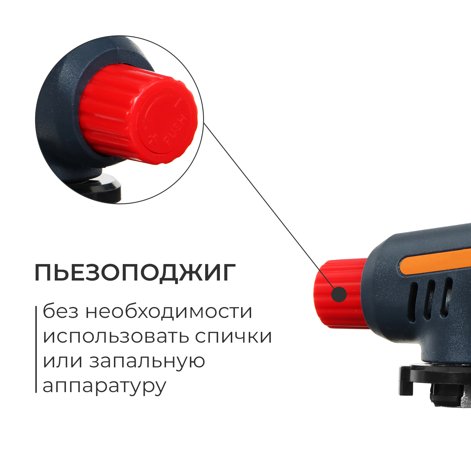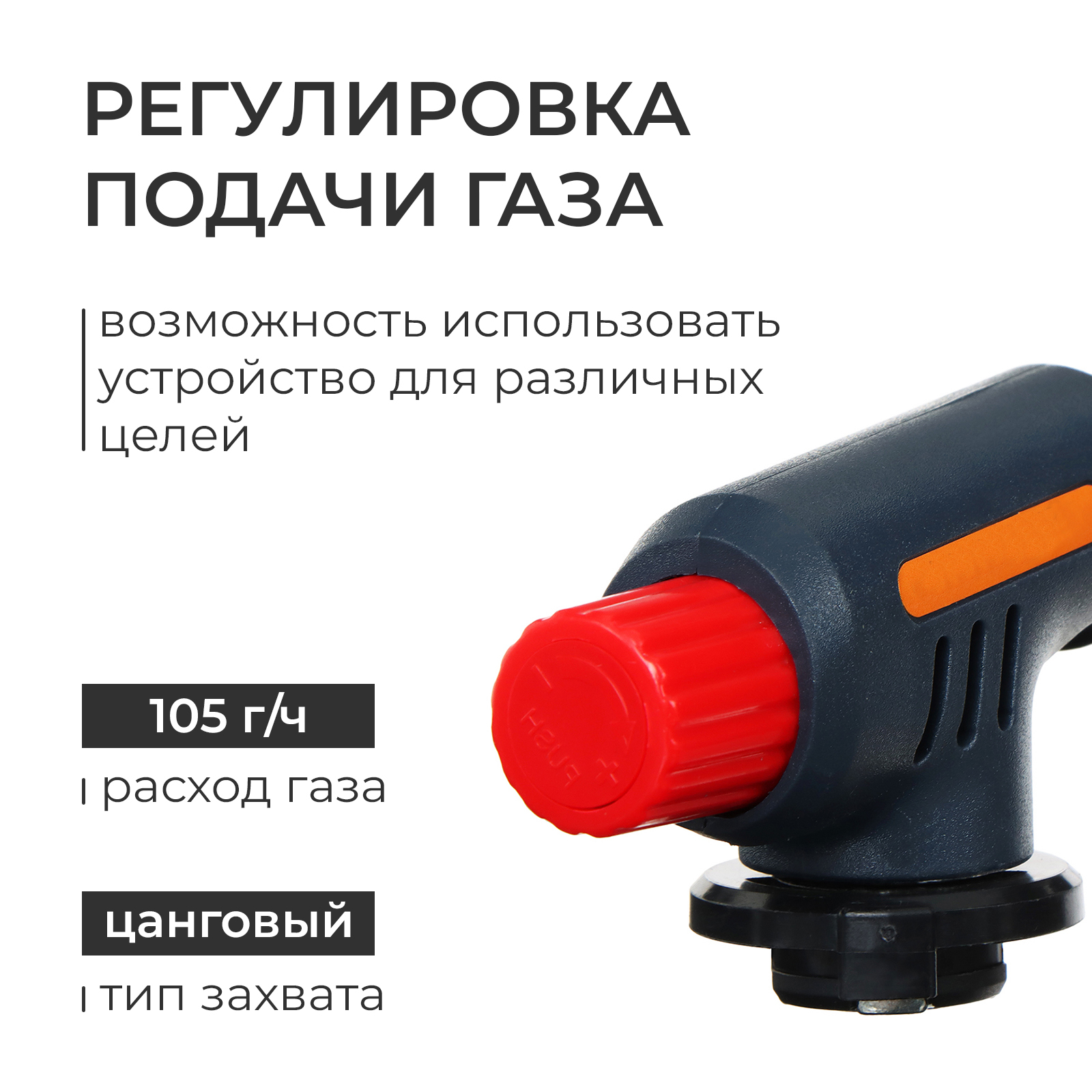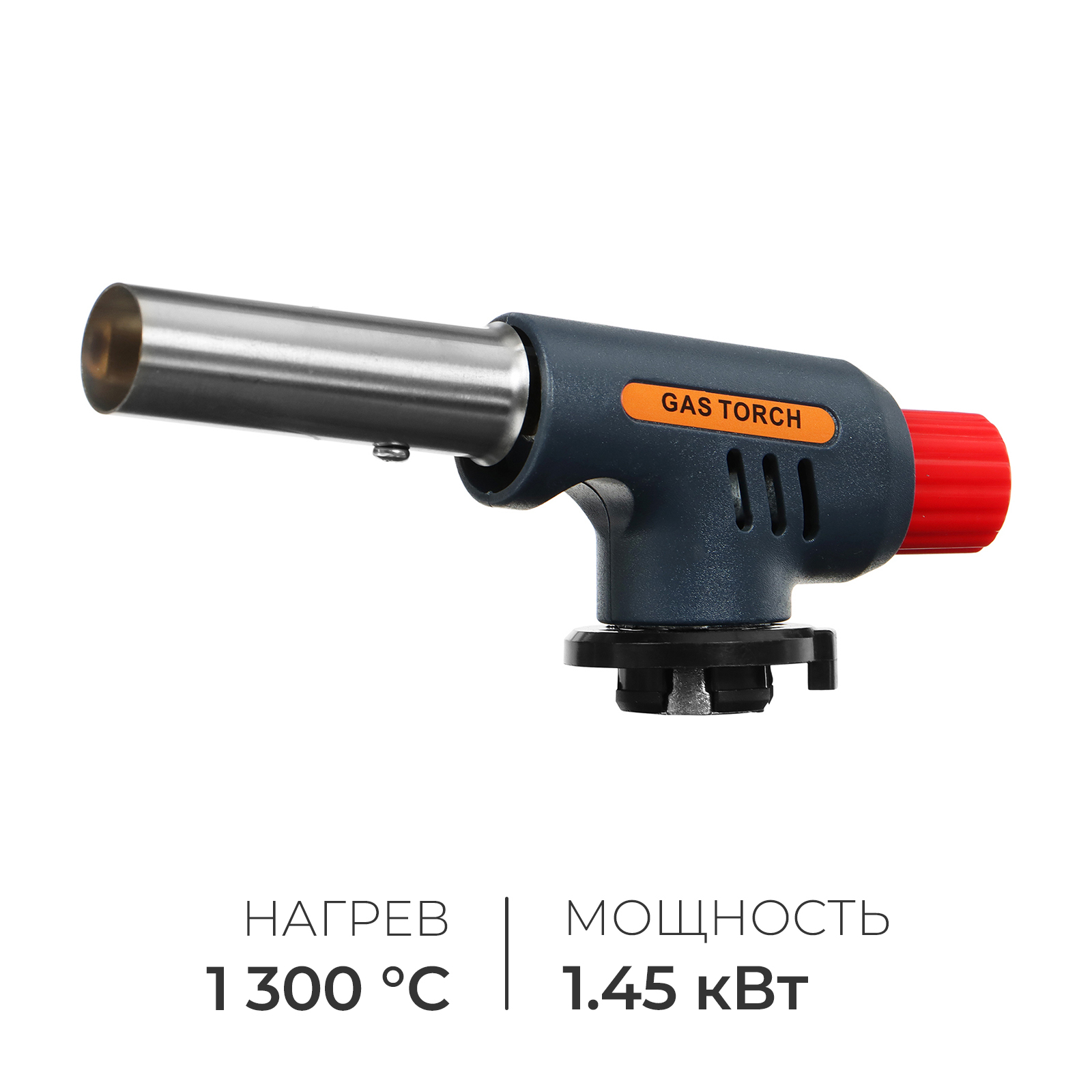 Газовая горелка, пьезоподжиг, цанговый захват. Газовая горелка подойдёт для разжигания углей, обжарки продуктов и проведения строительных работ. Особенности Пьезоподжиг обеспечивает удобный и быстрый розжиг без спичек и зажигалок. Цанговый захват помогает надёжно фиксировать баллоны с газом. Регулировка пламени позволяет выбрать оптимальную температуру для различных задач. Параметры Максимальная температура пламени: 1 300 °С. Мощность: 1, 45 кВт. Расход газа: 105 г/час. Вид газа: пропан, бутан. Внимание! При работе горелки некоторые части могут сильно нагреваться. Не используйте прибор в непосредственной близости от мест, где находятся легковоспламеняющиеся предметы: бензин, газ, спички, бумага и т. п. Тип захвата: Цанговый Температурное ограничение: Нет Тип: Горелка  развернуть описание ▼