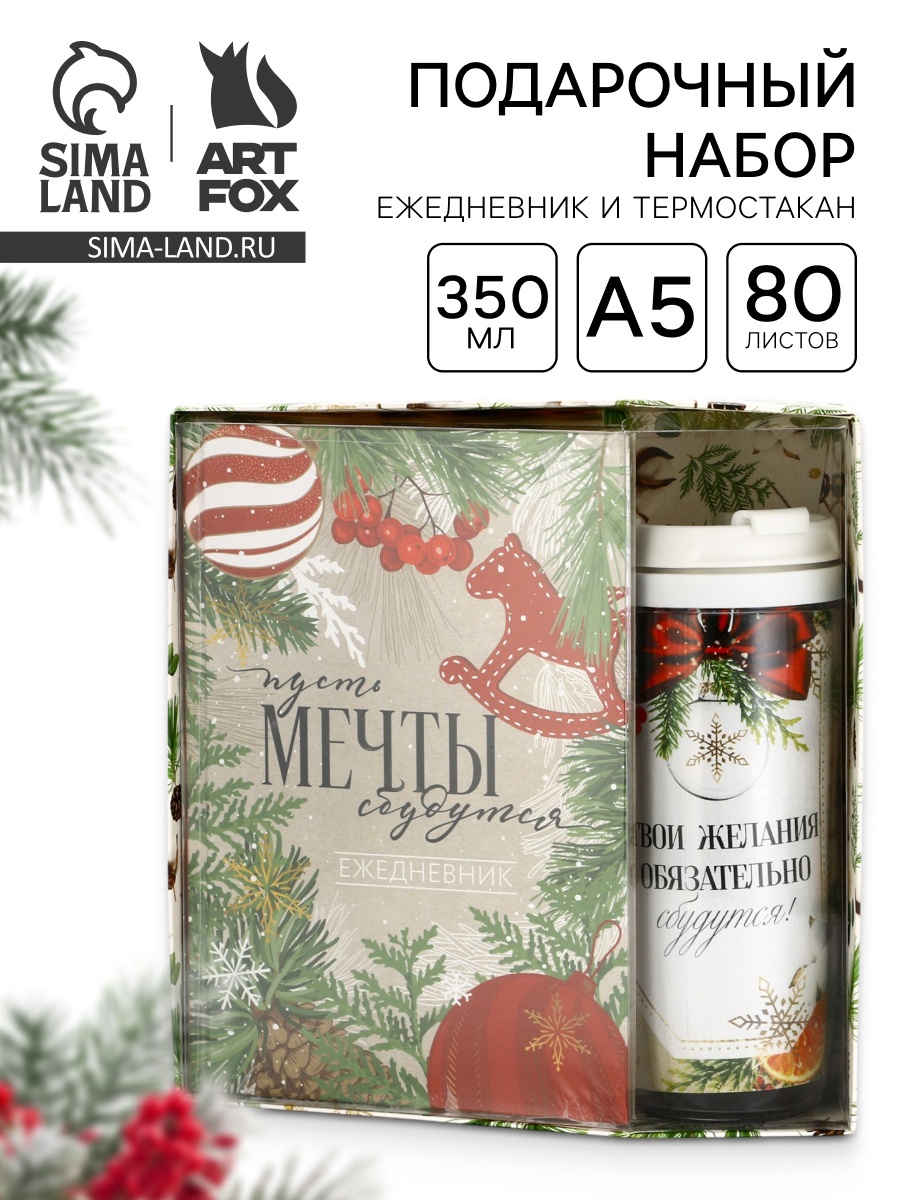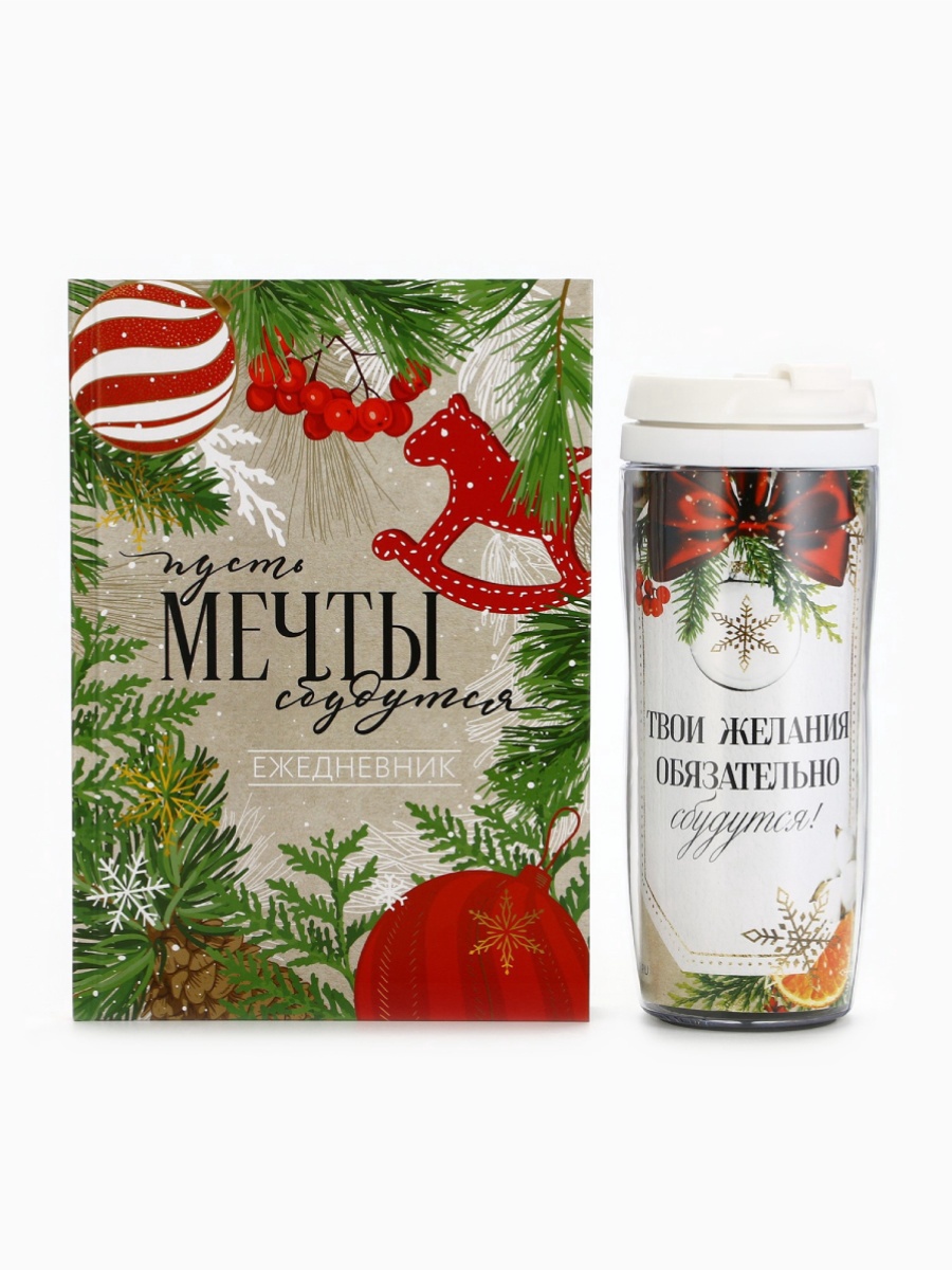 Подарочный набор новогодний, ежедневник а5, 80 листов, термостакан 350 мл «пусть мечты сбудутся!».