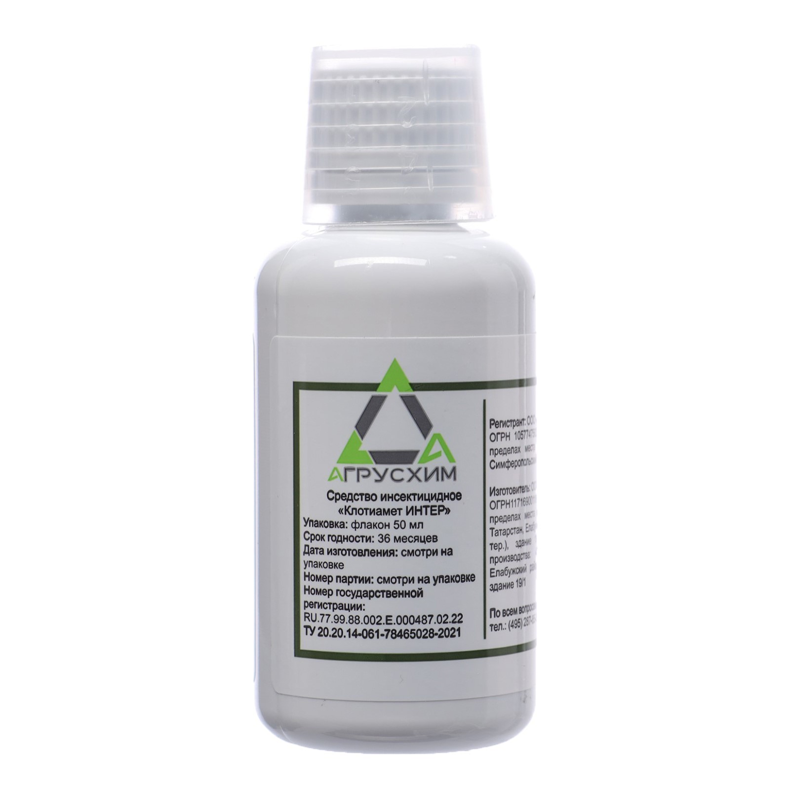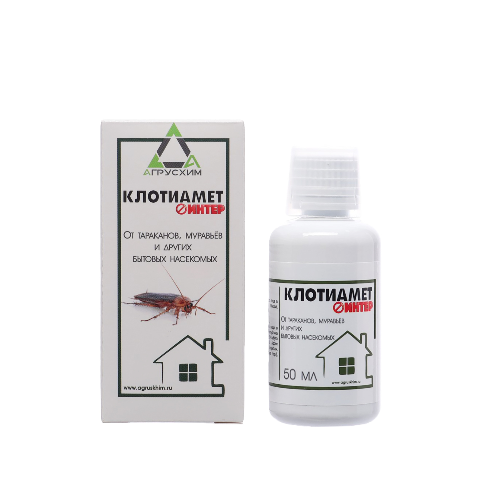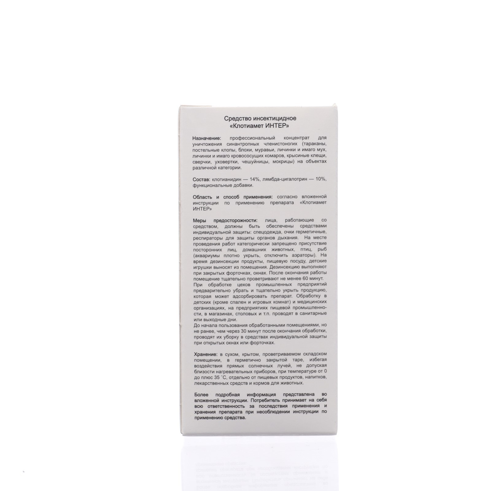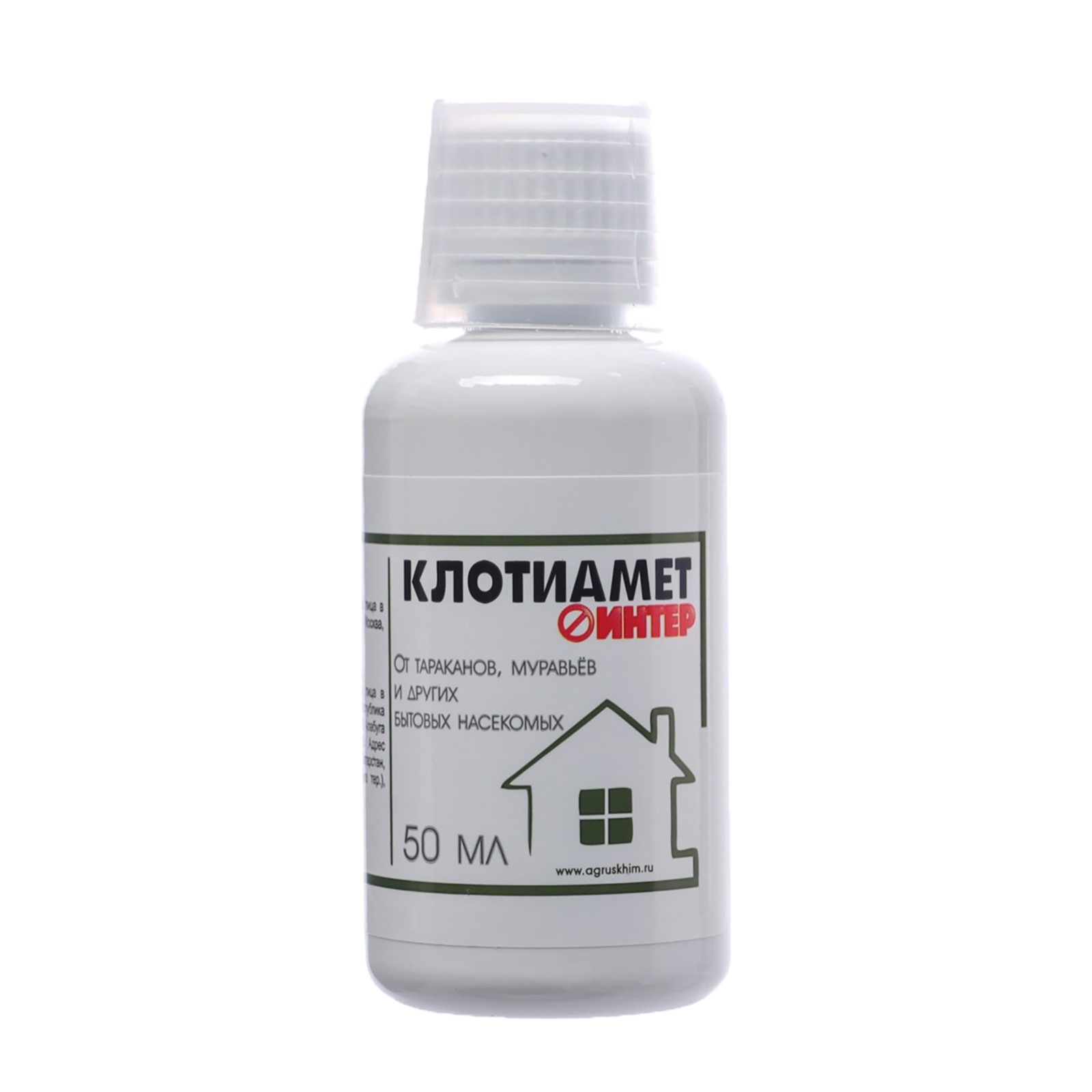Средство от бытовых насекомых клотиамет интер, 50 мл. Обладает острым инсектицидным действием в отношении широкого спектра бытовых насекомых. Обладает высокой биологической активностью, что обеспечивает практически мгновенное действие, и длительным периодом защиты (до 2 месяцев). Уничтожает популяции насекомых, устойчивых к фосфорорганическим инсектицидам. Средство предназначено для применения специалистами организаций, занимающихся дезинфекционной деятельностью, с целью уничтожения синантропных членистоногих на объектах различной категории в отсутствие взрослых и детей. Вид средства: Жидкость Температурное ограничение: Нет  развернуть описание ▼