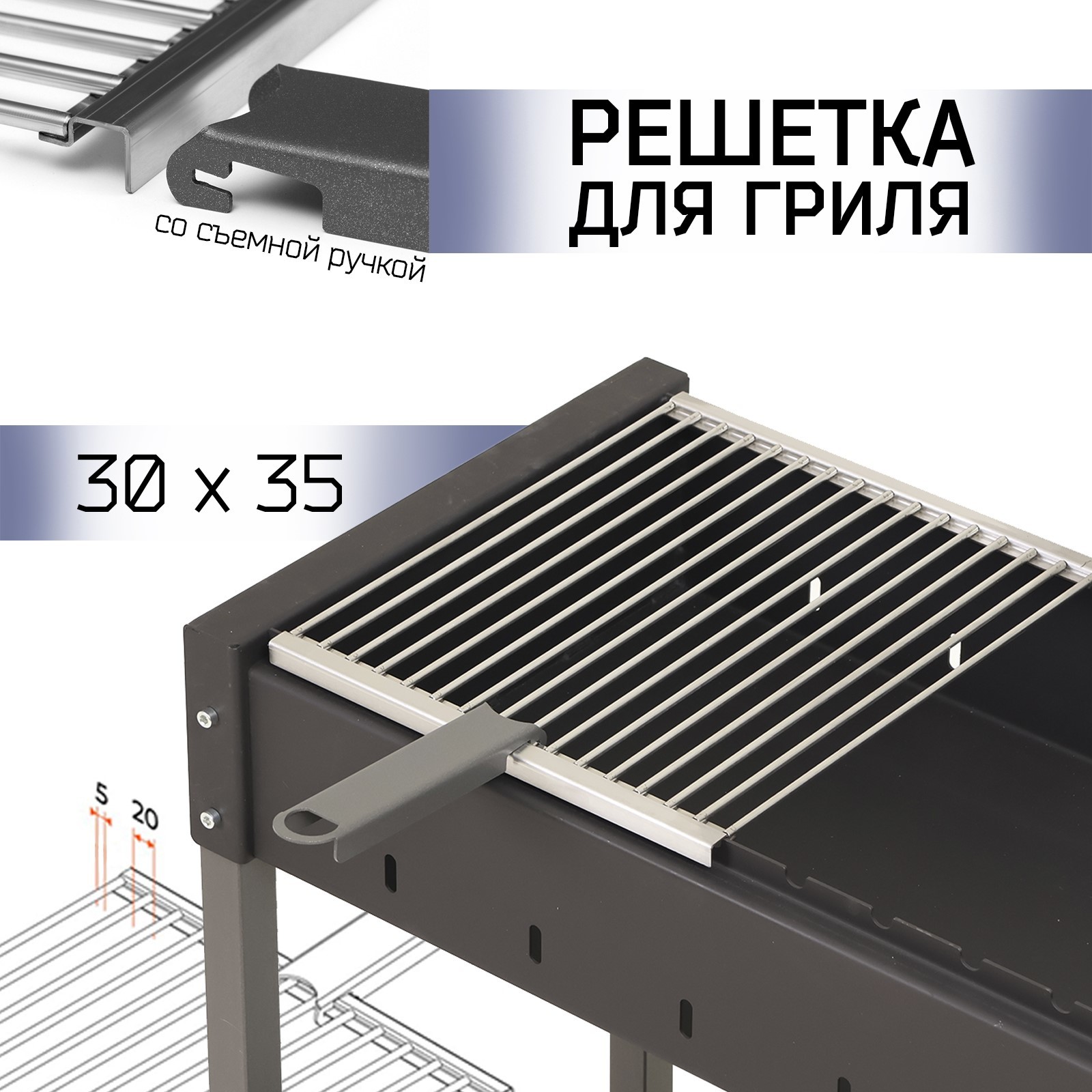 Решетка для барбекю рб 101, 29,8 х 35,3 х 1,7 см. Решетка для мангала, барбекю и гриля GRATAR — идеальный выбор для любителей блюд на огне. Решетка изготовлена из пищевой нержавеющей стали с толщиной прутьев 5 мм. Продукты не прилипают к поверхности решётки, что облегчает процесс готовки и последующей чистки. Съёмная ручка позволяет легко снимать и устанавливать решётку на мангал. Благодаря этому решетка более компактна, ее удобно брать с собой в путешествия, поход, на дачу или в гости. Идеально подходит к мангалам и грилям GRATAR. Размер, см: 35 х 30 Материал рабочей части: Нержавеющая сталь Температурное ограничение: Нет Назначение: Универсальная Назначение: Для мяса Антипригарное покрытие: Нет  развернуть описание ▼