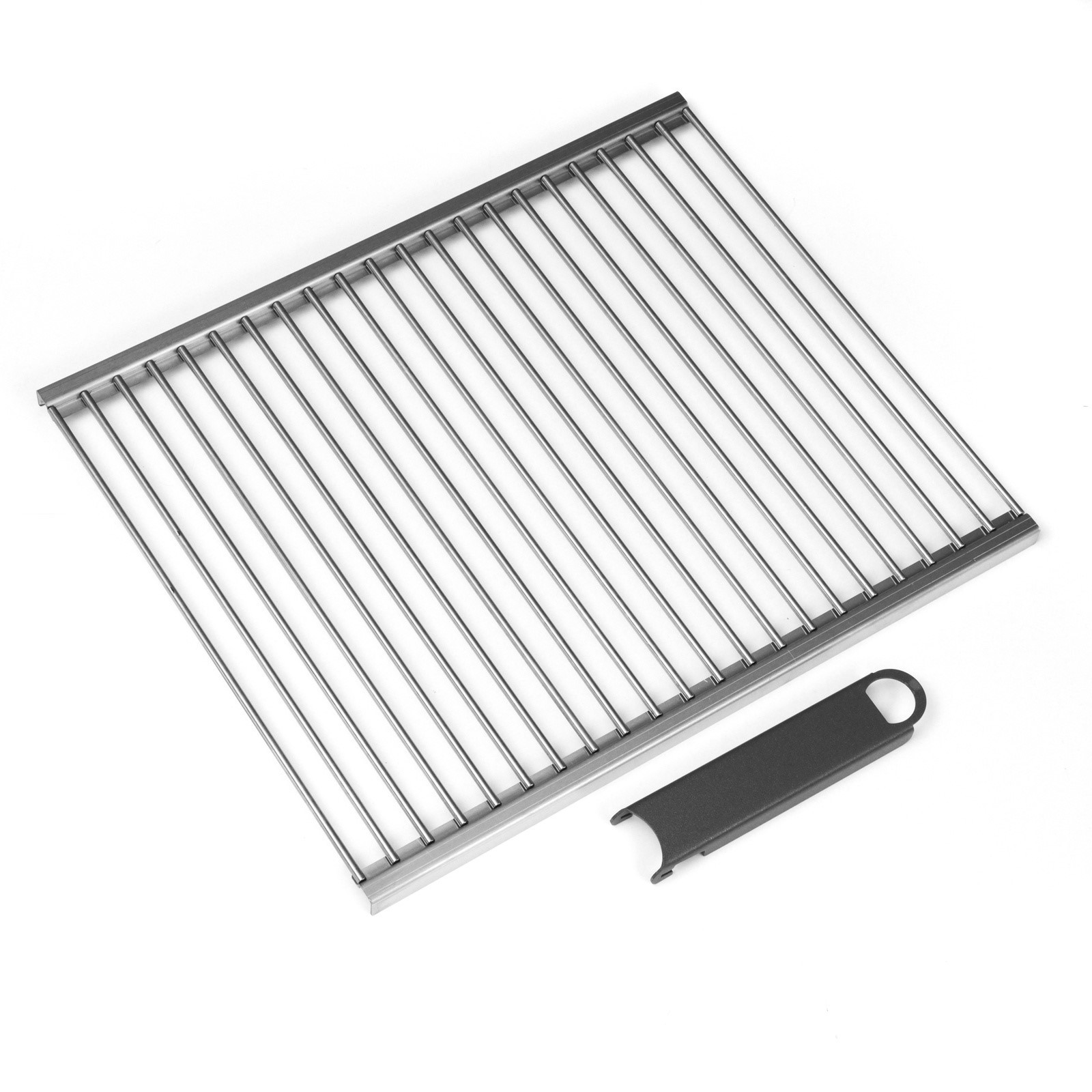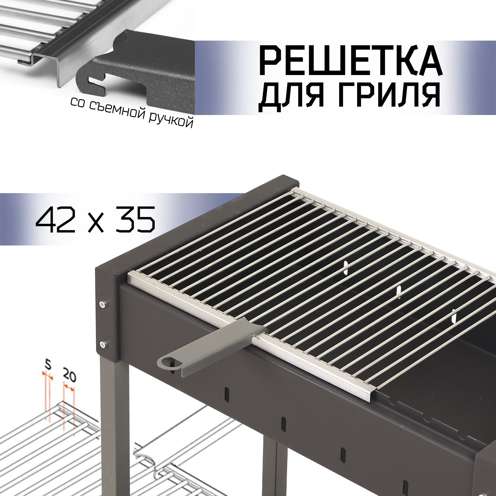 Решетка для барбекю рб 102, 42,3 х 35,3 х 1,7 см. Решетка для мангала, барбекю и гриля GRATAR — идеальный выбор для любителей блюд на огне. Решетка изготовлена из пищевой нержавеющей стали с толщиной прутьев 5 мм. Продукты не прилипают к поверхности решётки, что облегчает процесс готовки и последующей чистки. Съёмная ручка позволяет легко снимать и устанавливать решётку на мангал. Благодаря этому решетка более компактна, ее удобно брать с собой в путешествия, поход, на дачу или в гости. Идеально подходит к мангалам и грилям GRATAR. Размер, см: 42 х 35 Материал ручки: Металл Материал рабочей части: Нержавеющая сталь Температурное ограничение: Нет Назначение: Для мяса Назначение: Универсальная Антипригарное покрытие: Нет  развернуть описание ▼