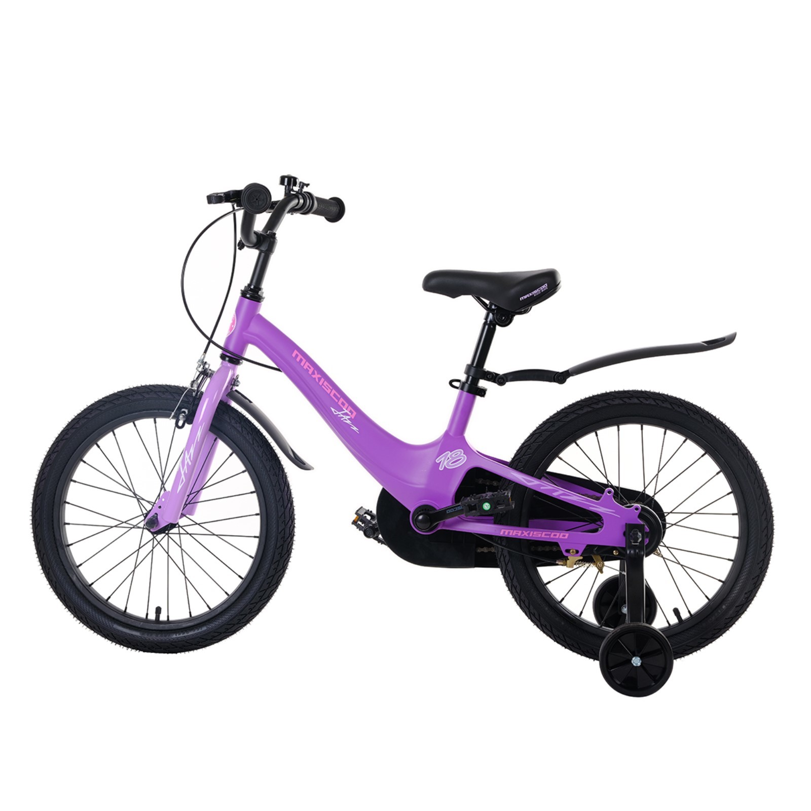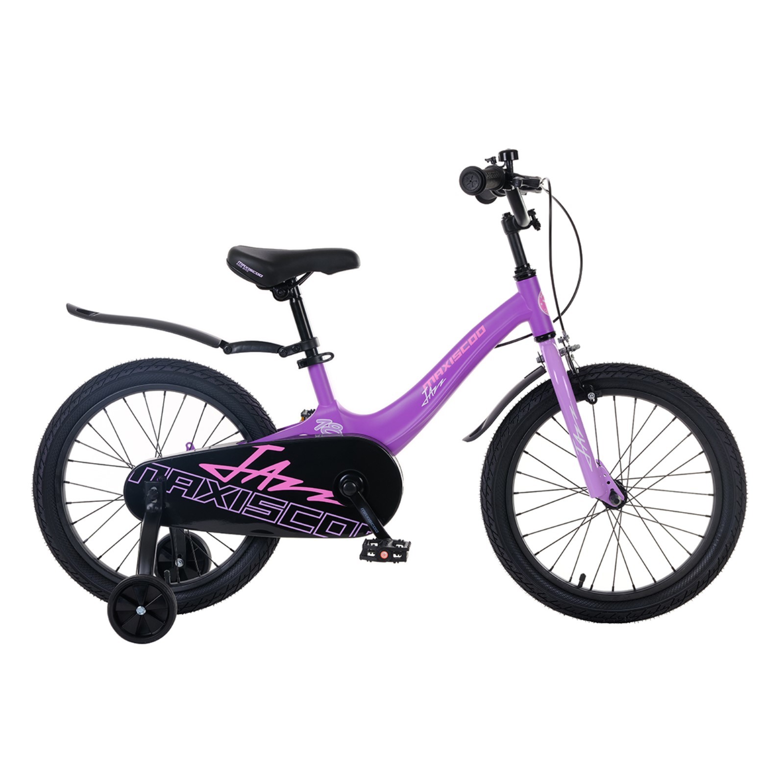 Велосипед 18 maxiscoo jazz стандарт, цвет фиолетовый матовый. Технические характеристики: рама - облегченный магниевый сплав;прочная стальная вилка;стальные колесные диски;задний роллерный и передний ободной ручной тормоз;надежный стальной руль с регулировкой по высоте;картриджная каретка на промподшипниках со съемными шатунами;прорезиненные ручки Maxiscoo;эргономичное сиденье, регулируемое по высоте;дополнительные боковые колеса;полная защита цепи для безопасности;нескользящие педали;крылья в комплекте. Цвет: Розовый Для кого: Для девочки Количество скоростей: 1 Максимально допустимый вес, кг: 40 Модельный год: 2024 Наличие амортизаторов: Без амортизаторов Материал рамы: Магниевый сплав Диаметр колёс, дюймы: 18 Передний тормоз: Ободной (V-Brake) Задний тормоз: Роллерный Рекомендуемый возраст, лет: 6 - 7 Рекомендуемый рост, см: 110 - 130 Подножка: Нет Вид: Универсальный Дополнительные боковые колёса: Да  развернуть описание ▼