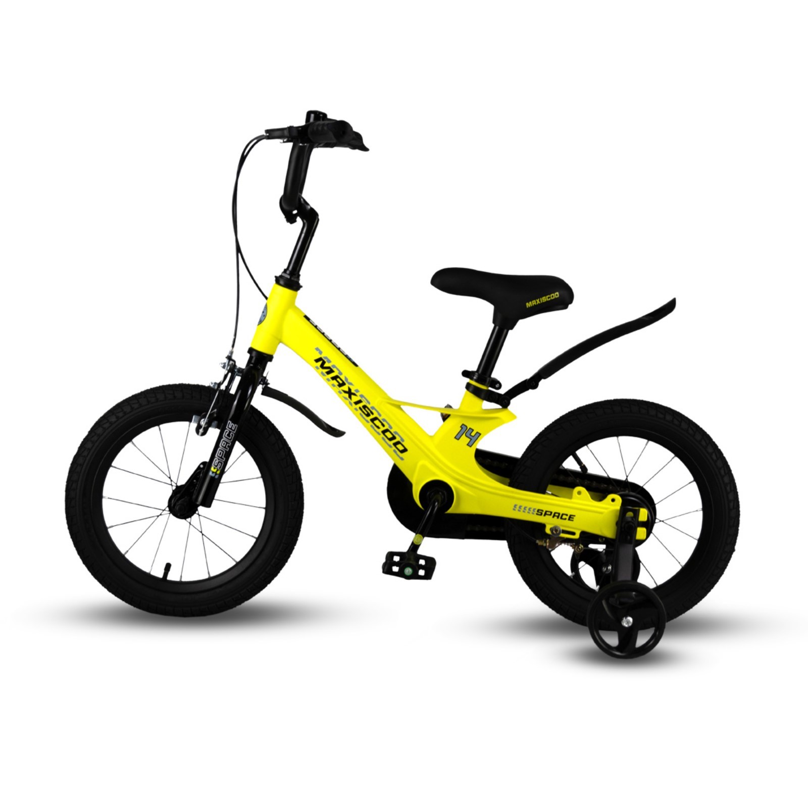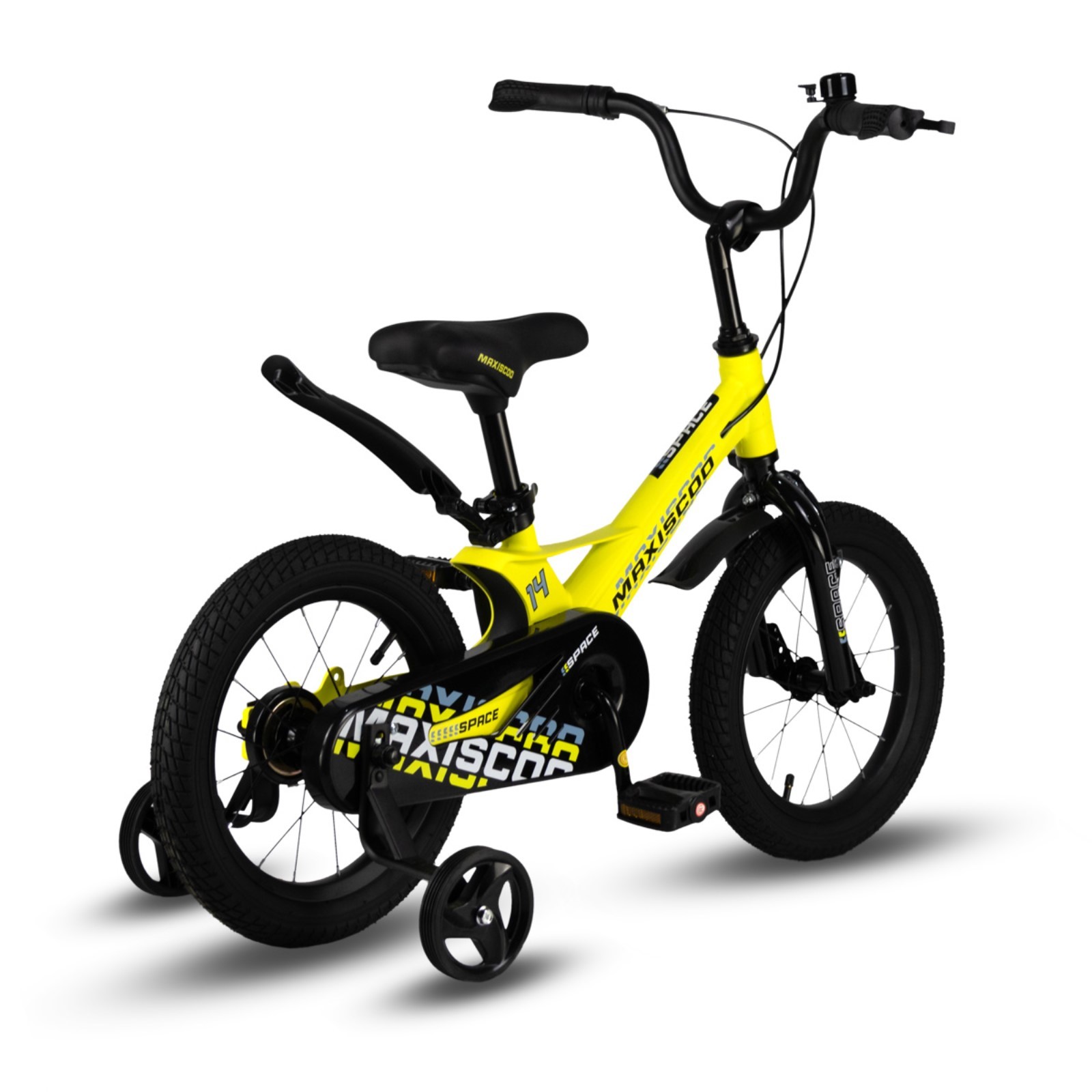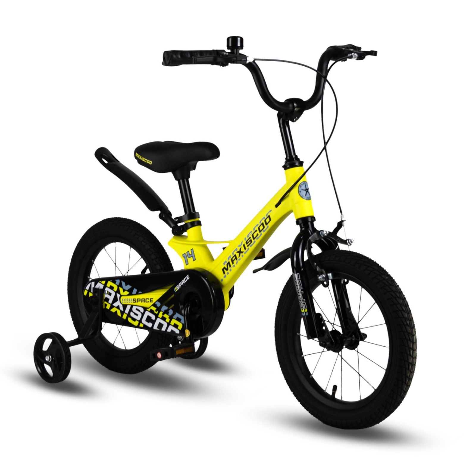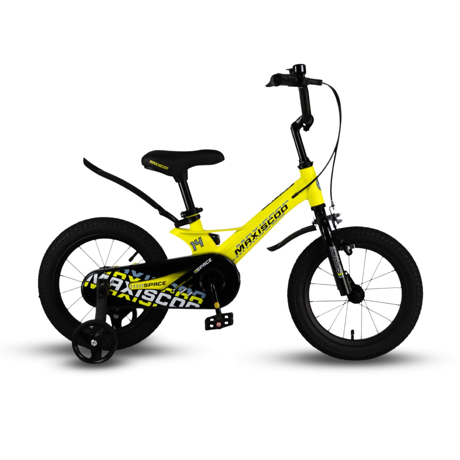 Велосипед 14 maxiscoo space стандарт плюс, цвет жёлтый матовый. Технические характеристики: рама - облегченный магниевый сплав;прочная стальная вилка;стальные колесные диски;задний роллерный и передний ободной ручной тормоз;надежный стальной руль с регулировкой по высоте;прорезиненные ручки с поддержкой запястья;эргономичное сиденье, регулируемое по высоте;дополнительные боковые колеса;полная защита цепи для безопасности;нескользящие педали;процент сборки из коробки - 85%;крылья в комплекте. Цвет: Жёлтый Для кого: Унисекс Количество скоростей: 1 Максимально допустимый вес, кг: 40 Модельный год: 2024 Наличие амортизаторов: Без амортизаторов Материал рамы: Магниевый сплав Диаметр колёс, дюймы: 14 Передний тормоз: Ободной (V-Brake) Задний тормоз: Ободной (V-Brake) Рекомендуемый возраст, лет: 4 - 5 Рекомендуемый рост, см: 90 - 110 Подножка: Нет Вид: Универсальный Дополнительные боковые колёса: Да  развернуть описание ▼