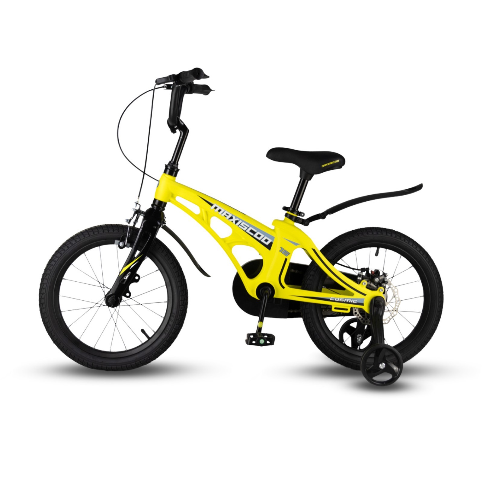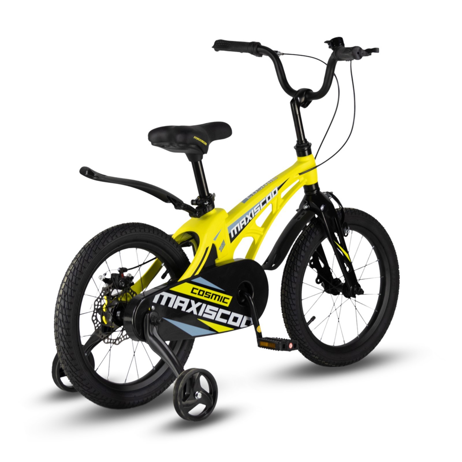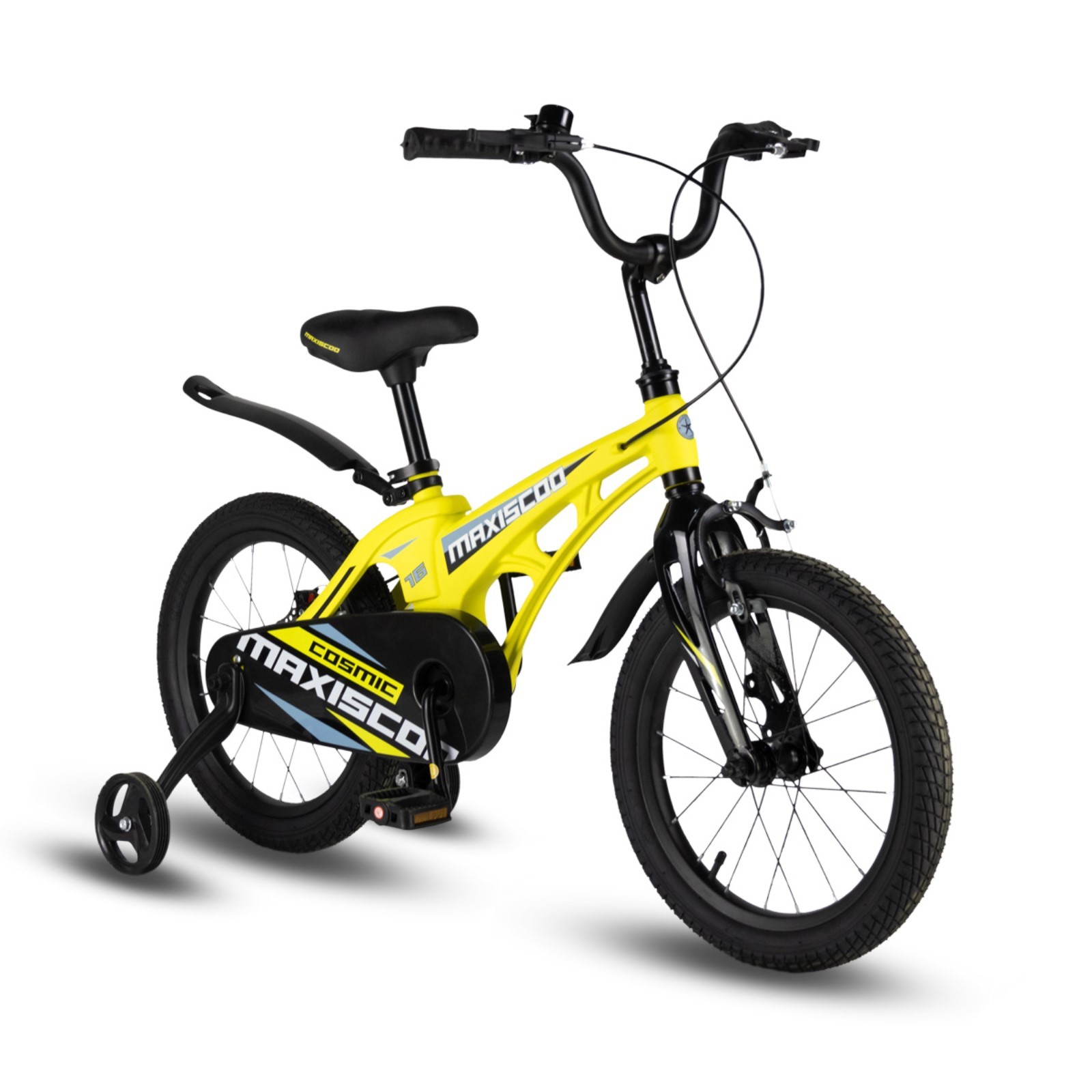 Велосипед 16 maxiscoo cosmic стандарт, цвет жёлтый матовый. Технические характеристики: рама - облегченный магниевый сплав;вилка - облегченный магниевый сплав;стальные колесные диски;задний дисковый и передний ободной ручной тормоз;надежный стальной руль с регулировкой по высоте;прорезиненные ручки с поддержкой запястья;эргономичное сиденье, регулируемое по высоте;дополнительные боковые колеса;полная защита цепи для безопасности;нескользящие педали;процент сборки из коробки - 85%;крылья в комплекте. Цвет: Жёлтый Для кого: Унисекс Количество скоростей: 1 Максимально допустимый вес, кг: 40 Модельный год: 2024 Наличие амортизаторов: Без амортизаторов Материал рамы: Магниевый сплав Диаметр колёс, дюймы: 16 Передний тормоз: Ободной (V-Brake) Задний тормоз: Дисковый механический Рекомендуемый возраст, лет: 4 - 5 Рекомендуемый рост, см: 100 - 120 Подножка: Нет Вид: Универсальный Дополнительные боковые колёса: Да  развернуть описание ▼
