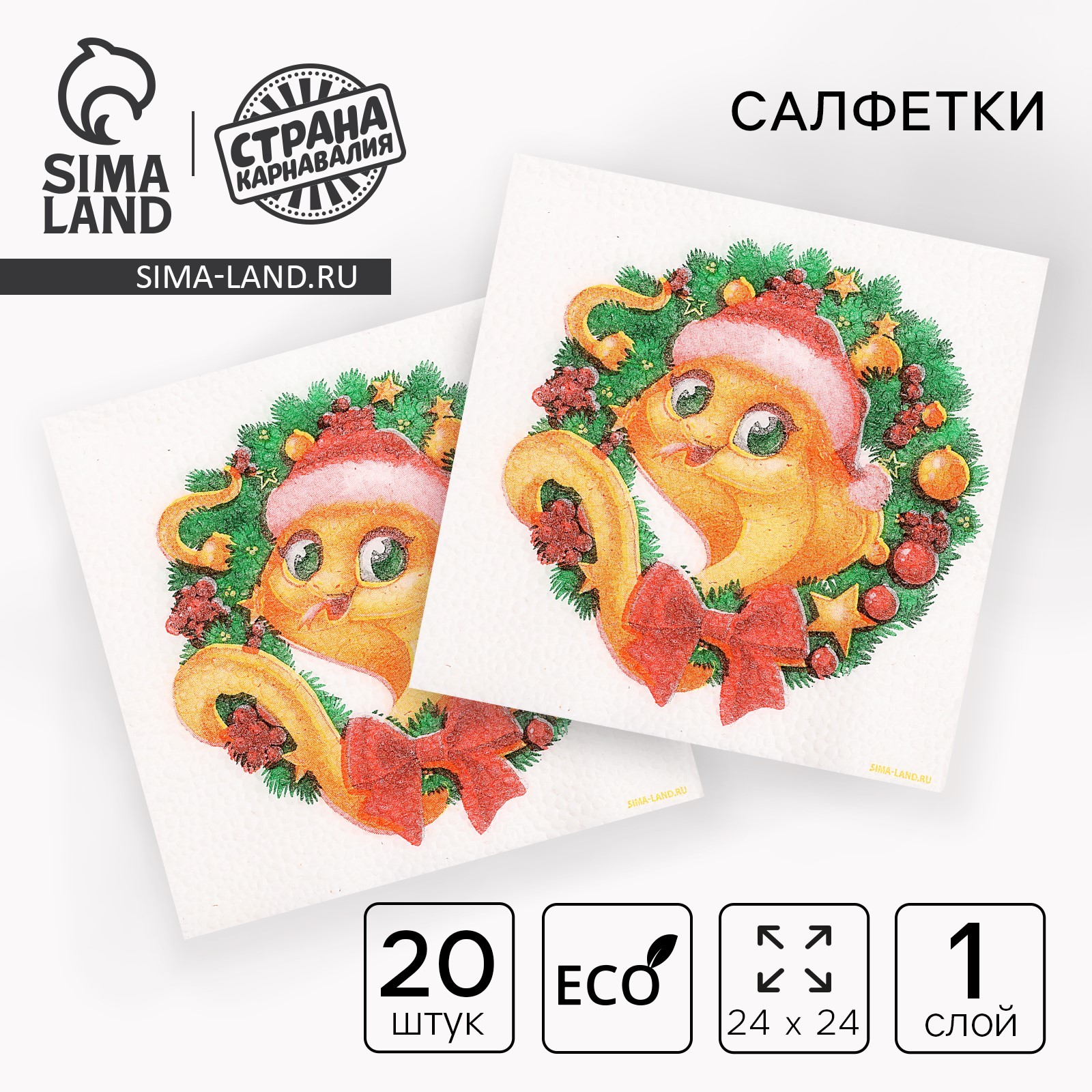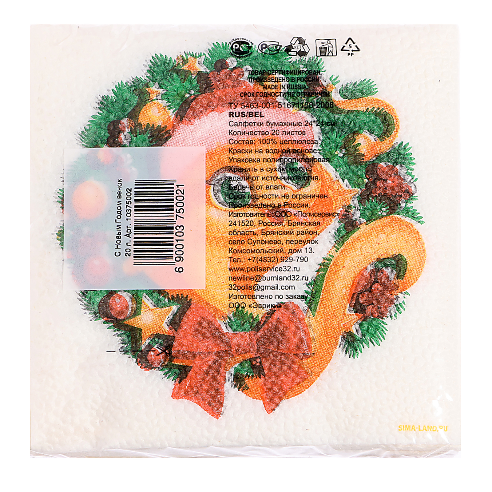 Салфетки бумажные однослойные «с новым годом», венок, 24х24 см, набор 20 шт.