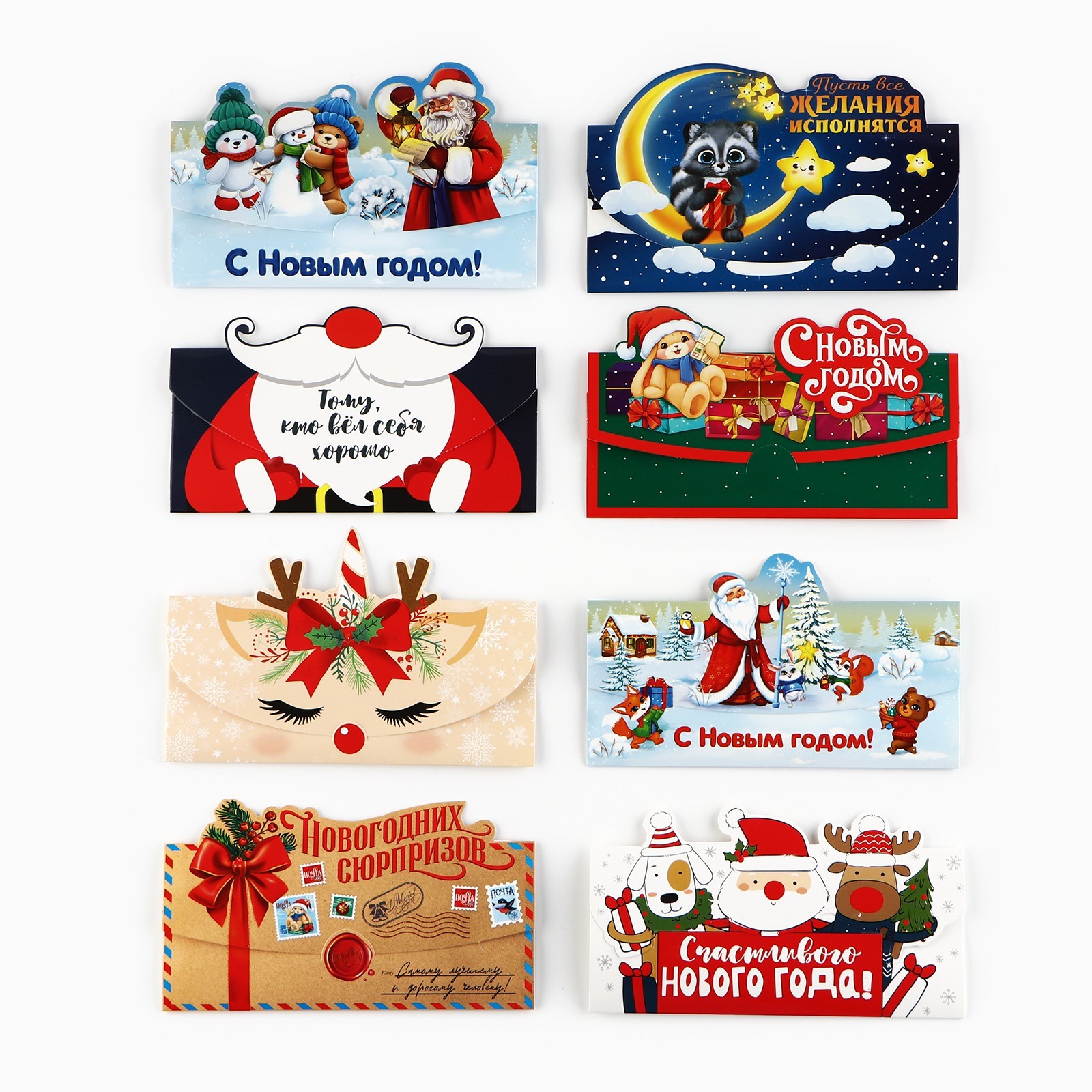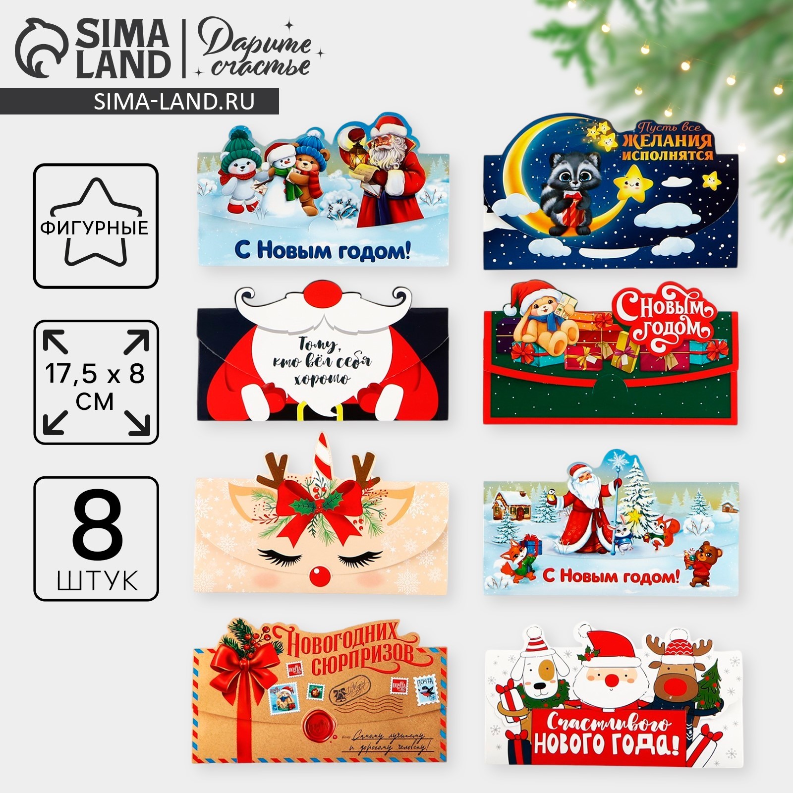 Конверт для денег фигурный «с новым годом!», 8 шт., 17.5 х 8 см. Для кого:Унисекс|Размер, см:8 х 17.5|Отделка:Фигурная вырубка|Символ года:Нет|Тематика праздника:Новый год|Адресат:Без адресата|Страна:Китай