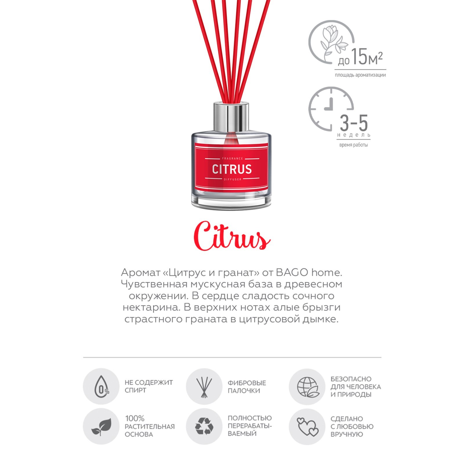 Ароматический диффузор апельсин и гранат 40 мл. Ароматический диффузор "Апельсин и гранат" от BAGO home пульсирует сочной энергией. Ароматический диффузор в насыщенном алом цвете 25 мл. Время работы: 4 недели. Площадь ароматизации: 15 м2. В комплекте 6 красных фибровых палочек из прессованного волокна. Открываясь цитрусовой кислинкой в верхнем ярусе, композиция погружается в спелую сладость нектарина в сердце пирамиды. Фруктовый дуэт оттеняет чувственная мускусная база с древесными тонами в нижних нотах. Пирамида аромата: верхние ноты - цитрус; средние ноты - нектарин; нижние ноты - мускус BAGO home – это бренд ароматов для дома с европейским качеством. Главные ценности компании – создавать натуральные и экологически чистые ароматы для каждого дома. Огромная палитра ароматов, авторский дизайн, безопасный состав и контроль всего цикла производства – все это делает компанию уникальной на международном рынке, где бренд Баго хоум знают и любят уже в 12 странах. Ароматы для дома Баго Хоум из коллекции "AROMATIC ELIXIR" с цветными палочками и яркими этикетками дарят заряд формы и цвета! Коллекция ароматов для дома AROMATIC ELIXIR от BAGO home разработана для ярких индивидуальных интерьеров и создания акцентов. Откройте упаковку и достаньте диффузор. Открутите и снимите крышку, затем удалите защитную мембрану. Закрутите крышку обратно на место. Освободите фибровые палочки от скотча и вставьте 2-3 палочки в диффузор. Используйте только те палочки, которые поставляются в комплекте с диффузором. Добавьте больше палочек для усиления аромата при необходимости. Разместите диффузор в подходящем месте, избегая прямых солнечных лучей и тепла. наслаждайтесь. Объём, мл: 40 Вид ароматизатора: Диффузор Аромат: Гранат Аромат: Апельсин Температурное ограничение: Нет  развернуть описание ▼