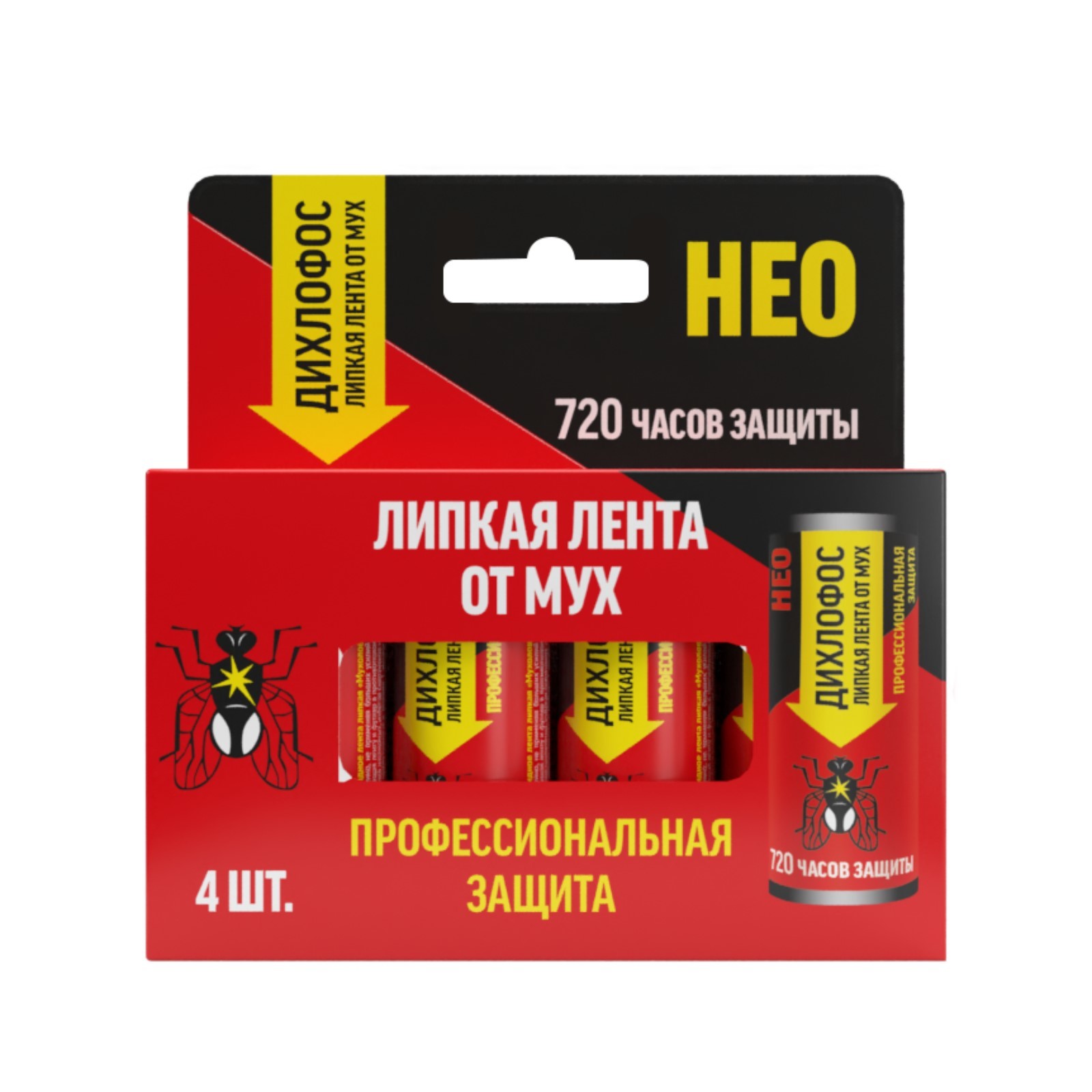 Лента липкая для мух дихлофос нео, 4 шт. Эффективная защита от мух, комаров, молиСовременное действующее вещество — вапортрин — преодолевает природную устойчивость мух к различным ядам, мгновенно уничтожает ихСредство безопасно для людей, животных и растенийРаботает при открытых окнахБез запахаСоставКлеевая основа: смола сосновая — 55. 0%, каучук — 5. 0%, аттрактант пищевой — 0. 5%, маслона туральное — 39. 5%. Вид средства: Липкие ленты  развернуть описание ▼