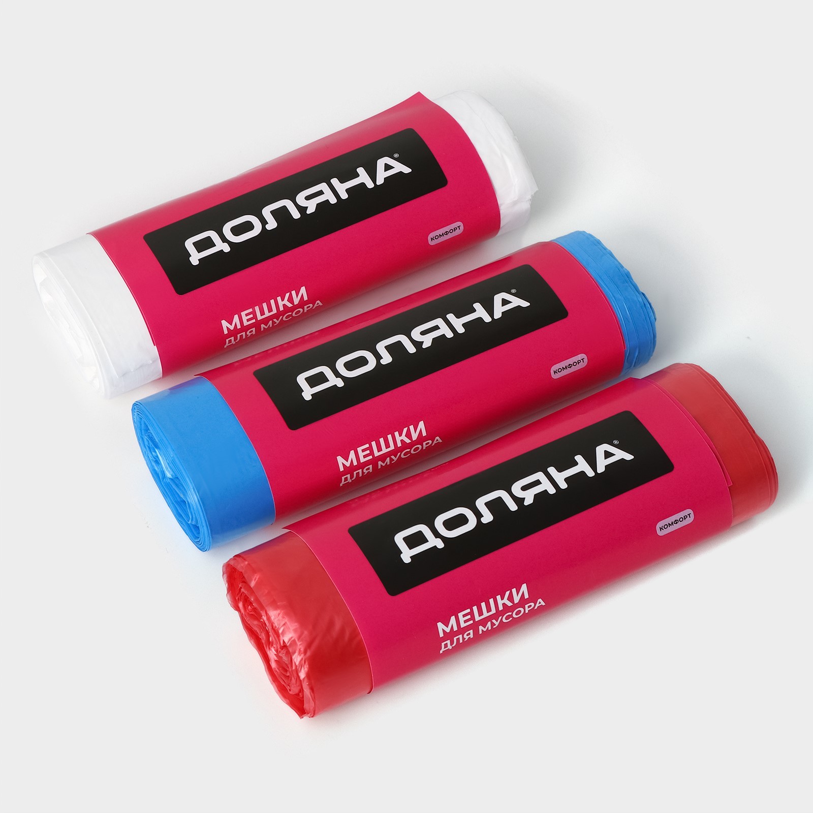 Набор мешков для мусора доляна, 3 рулона, 60 л, 18 мкм, 55x64 см, пнд, 20 шт. Мешки для мусора Доляна - это современный подход к утилизации мусора, в котором надёжность материалов соединяется с высокими требованиями к качеству. Особенности:Объем:Разновидность объема удовлетворяет любые потребности и делает их идеальным выбором для кухни, дачи, офиса и т. п. Материал:Две разновидности плотности полиэтилена: Изготовленные из полиэтилена низкой плотности (ПНД - гладкий и блестящий) и полиэтилена высокого давления (ПВД - матовый и шершавый). Толщина:Толщина мешков от 5 мкм, до 100 мкм. обеспечивает долгий срок службы, при этом сохраняя легкость и удобство использования. Универсальное применение:Подходят для различных видов мусора, включая пищевые отходы, бумагу, пластик и другие бытовые отходы. Цвет: Синий Цвет: Красный Цвет: Белый С ручками: Нет Толщина, мкм: 18 В упаковке, шт.: 20 Объём, л: 60 Материал: ПНД С завязками: Нет Ароматизированные: Нет Температурное ограничение: Нет Биоразлагаемый: Нет  развернуть описание ▼