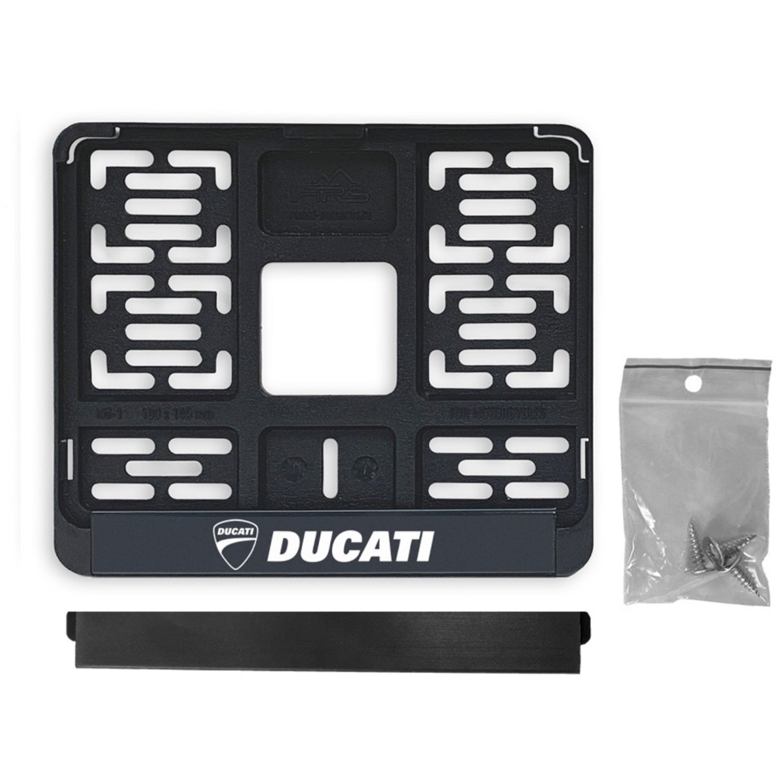 Рамка номерного знака ars ducati, 190 х 145 мм.   Для нанесения изображений на рамки используется технология УФ-печати. Данная технология позволяет наносить полноцветное изображение с помощью UV-красок на нижнее поле рамки. После нанесения изображения поверхность покрывается стойким лаком, что гарантирует долговечность покрытия.  Рамка для мотоцикла со съемной планкой изготовлена из прочного пластика.  Она состоит из двух частей – основы, в которую вставляется номер, и планки, на которую наносится изображение.  Для установки рамки нужно отстегнуть планку, начиная с середины, зафиксировать рамку на мотоцикле саморезами, вставить номер в рамку и прикрепить планку к рамке.  В комплекте с рамками идут 3 самореза 16 мм для крепления рамки к мотоциклу.