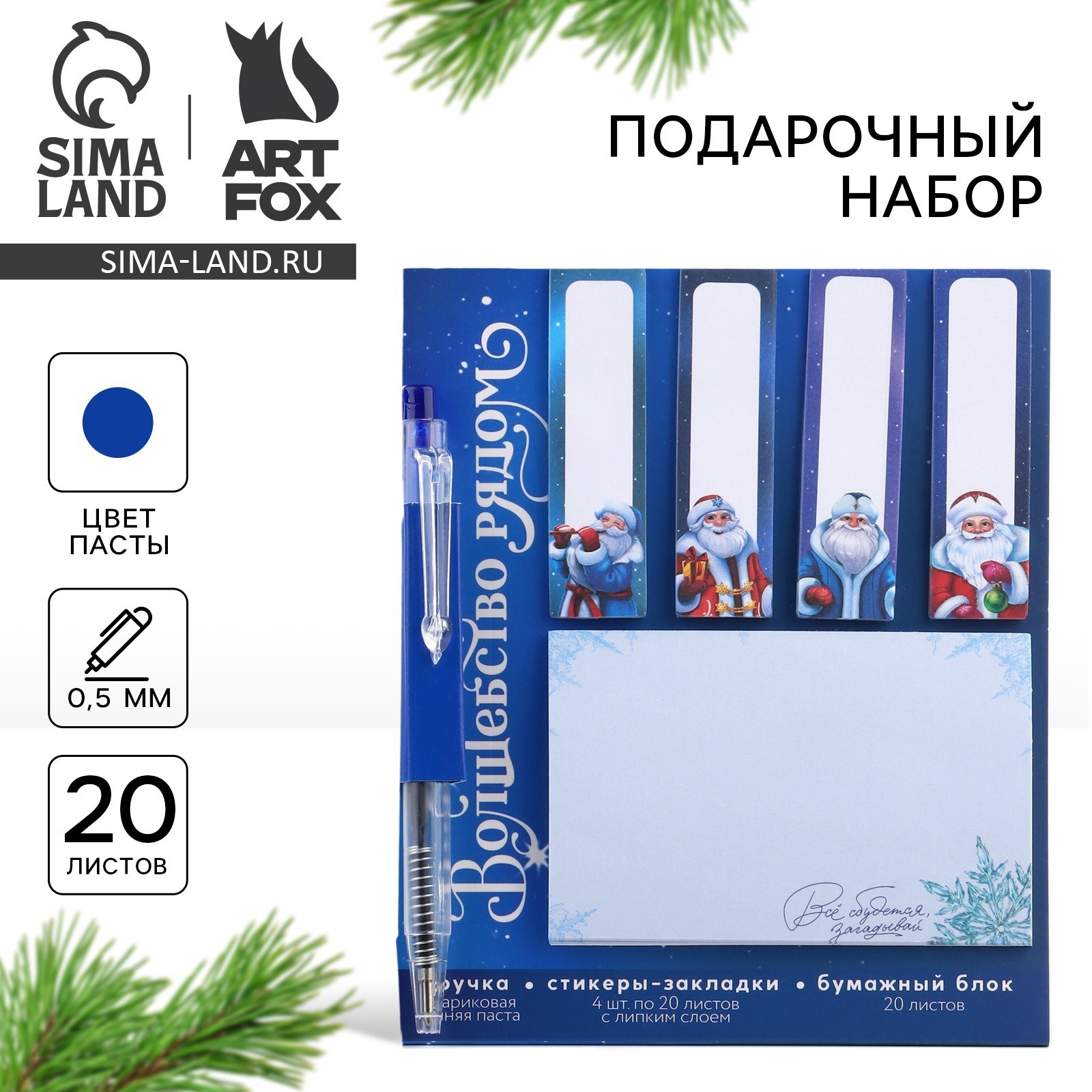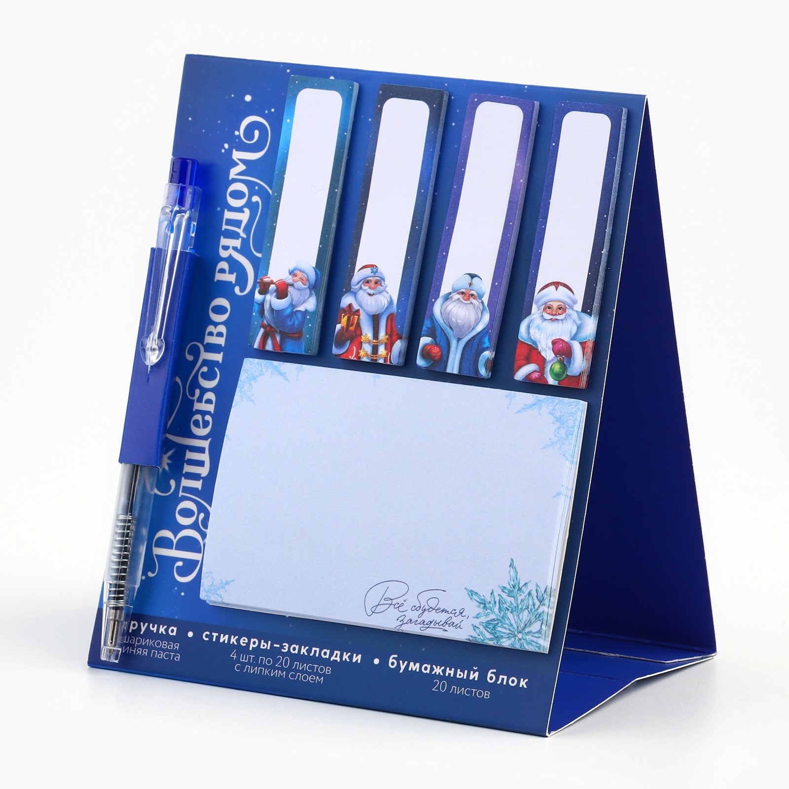Подарочный набор новогодний «исполнения желаний», ручка, стикеры для заметок, 20 листов. Новогодний набор торговой марки ArtFox — прекрасный подарок для тех, кто любит читать и писать! Ручка Диаметр пишущего узла, мм: 0.5;Стержень заменяемый: да;Материал: пластик;Тип: автоматическая ручка;Вид ручки: шариковая;Цвет стержня: синий.Стикеры-закладки Размер, см: 1.5 х 5.5;Количество листов: 20.Бумажный блок Количество листов: 20.Набор:Да|Для кого:Для мальчика|В наборе, шт.:6|Количество листов:20|Вид упаковки:Пакет|Символ года:Нет|Тематика праздника:Новый год|Адресат:Без адресата|Материал:Пластик|Материал:Бумага|Материал:Картон|Составляющие набора:Блок бумаг|Составляющие набора:Ручка|Составляющие набора:Стикеры|Возраст:Для детей|Страна:Китай  развернуть описание ▼