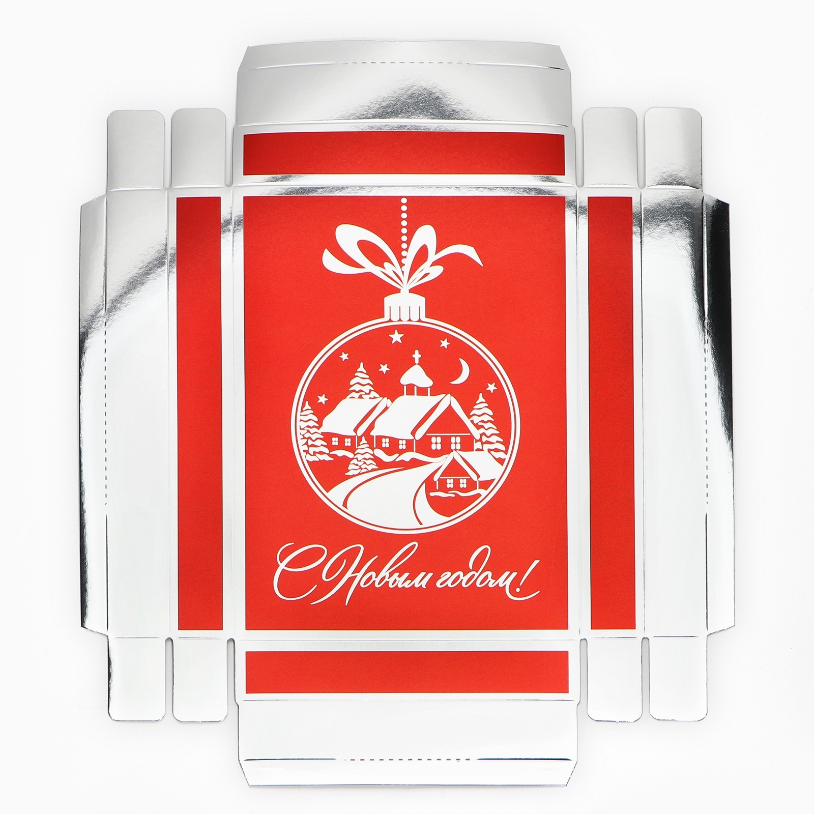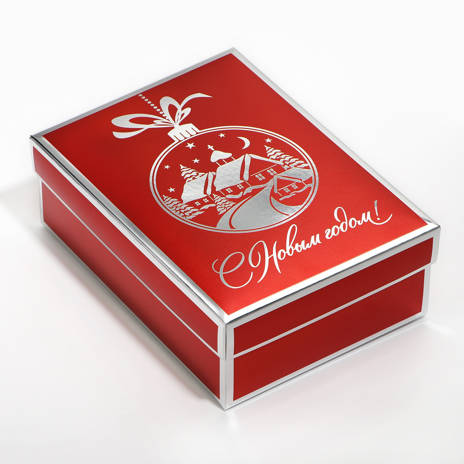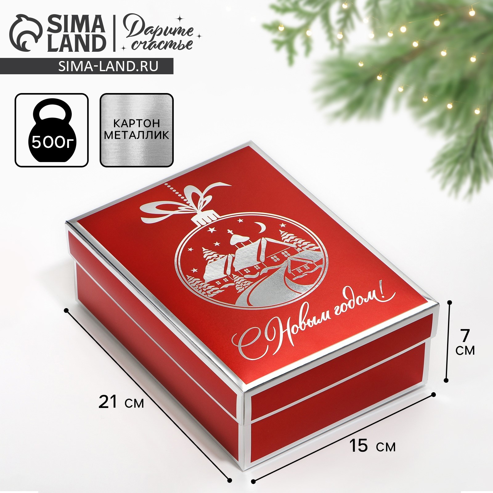 Цвет:Красный|Форма:Прямоугольная|Плотность, г/м :300|Длина, см:21|Ширина, см:15|Высота, см:7|Допустимый вес вложения, г:500|Тематика:Новогодняя|Символ года:Нет|Тематика праздника:Новый год|Материал:Металлизированный картон|Вид:Складные коробки|Размер:Средний (18-24 см)|Окошко:Нет|Крышка-дно:Да|Страна:Китай