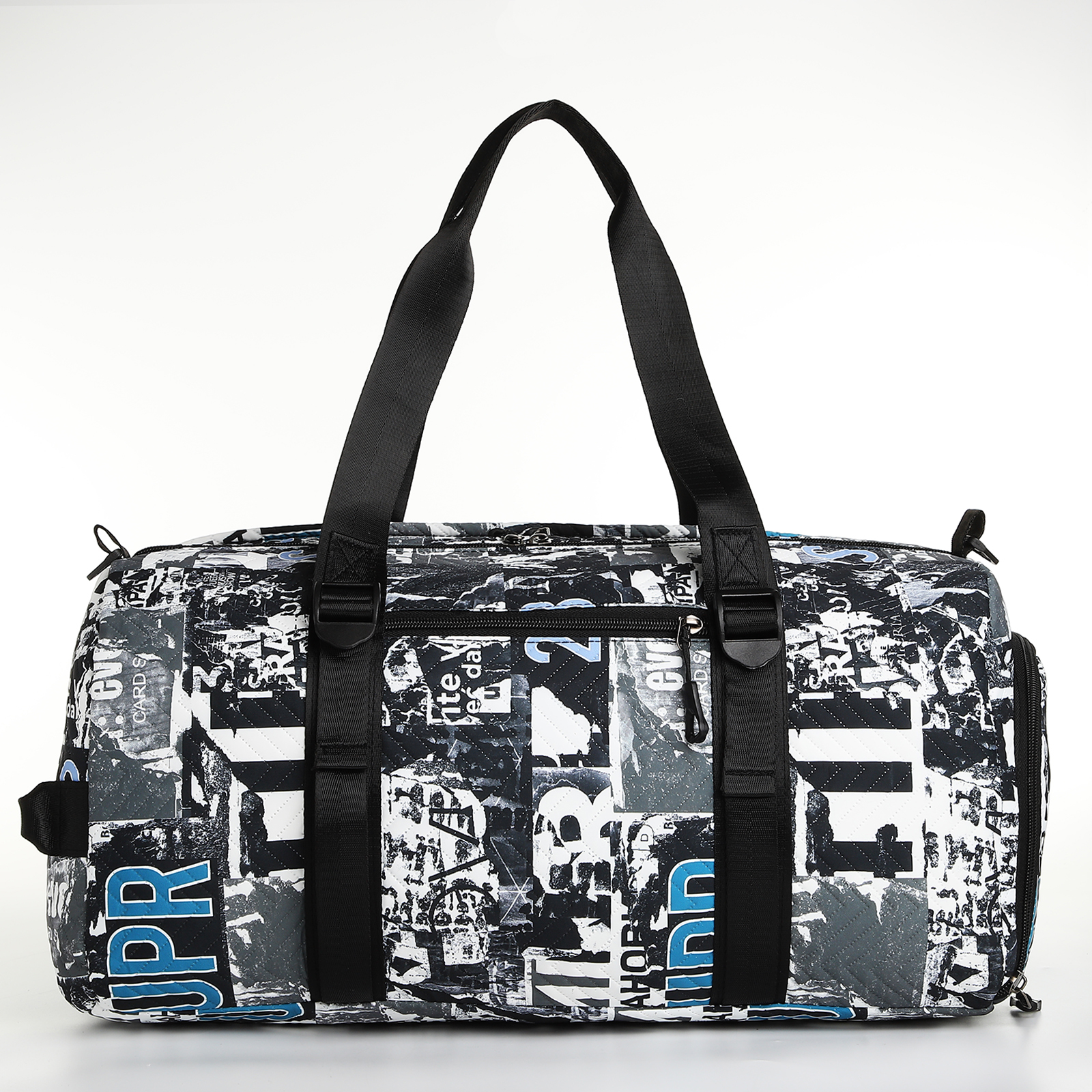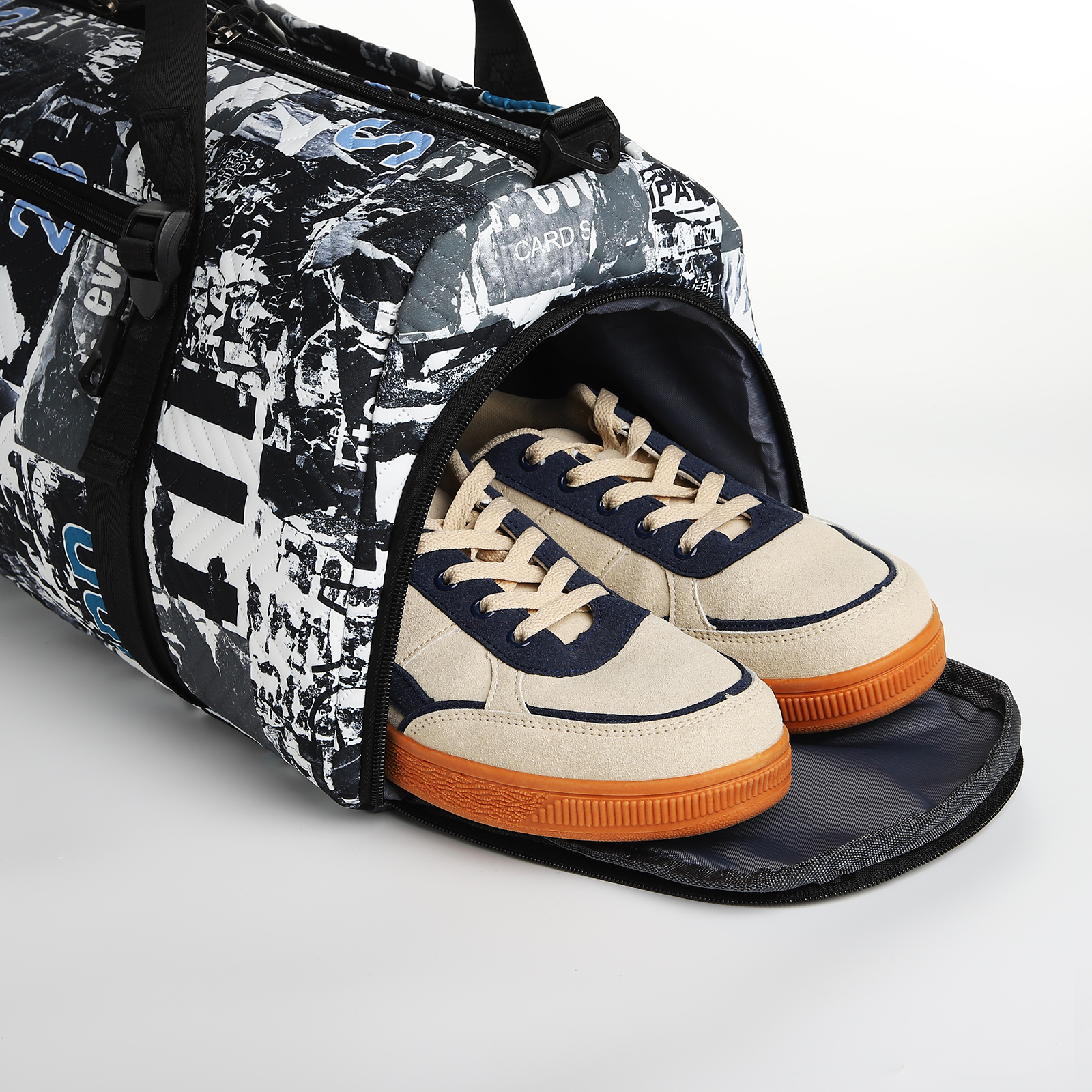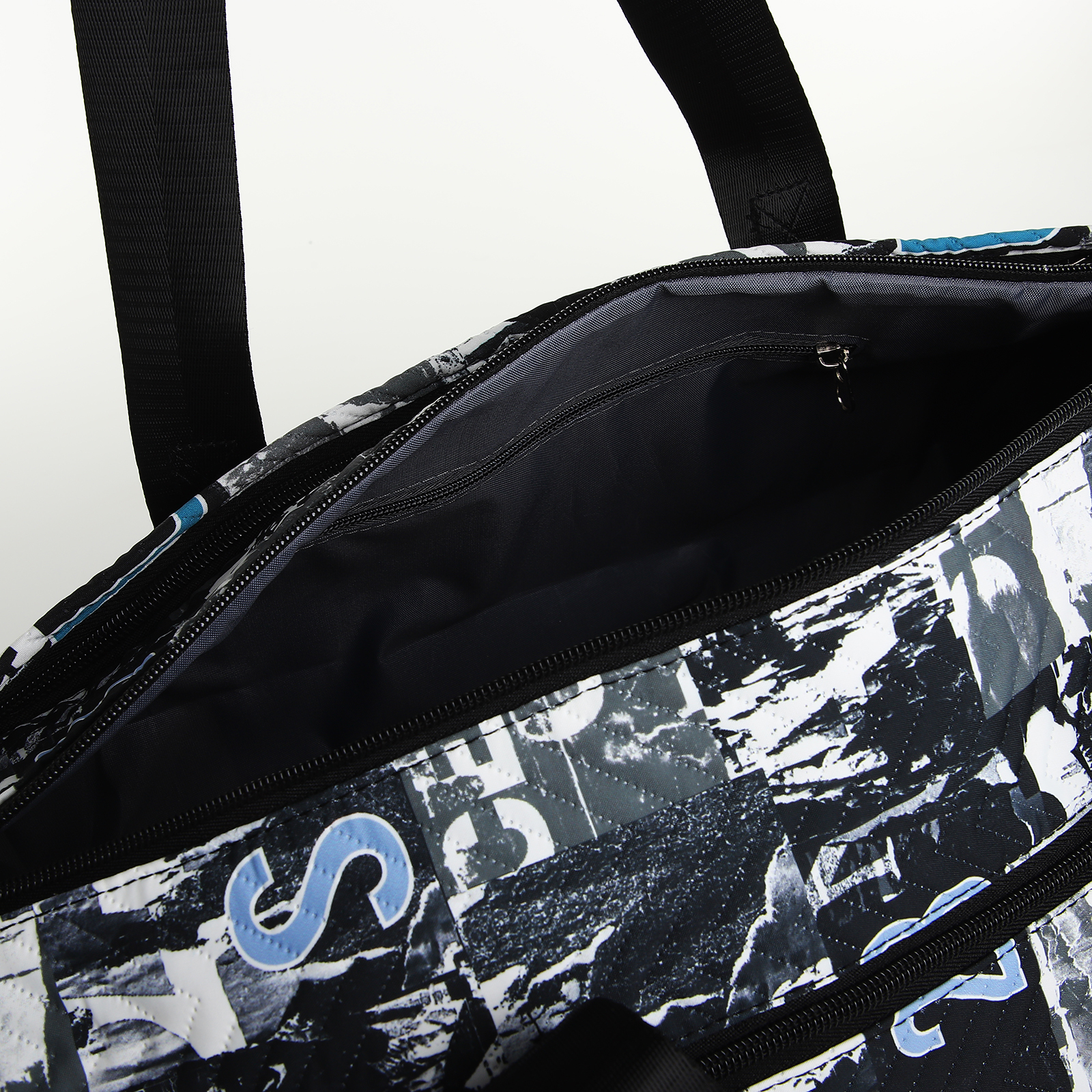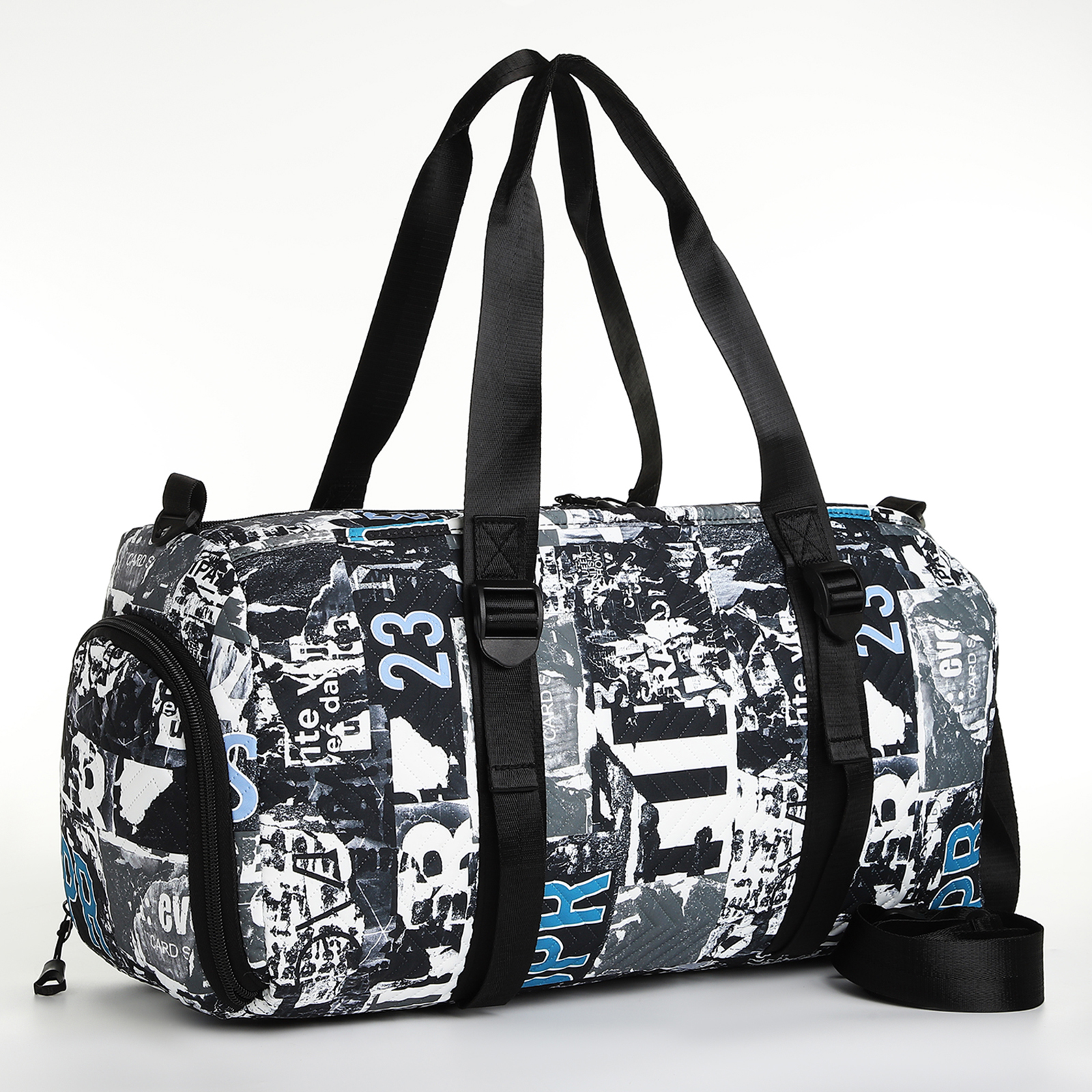 Сумка спортивная на молнии, отдел для обуви, 2 наружных кармана, длинный ремень, средний размер, цвет чёрный/голубой