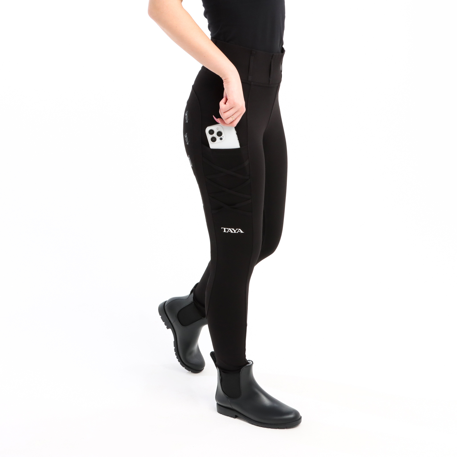 Бриджи для верховой езды taya equestrianism цвет черный, размер 36, tl1. Спортивные бриджи для верховой езды «Aphrodite» представляют новую коллекцию «Pantheon» бренда TAYA Equestrianism. По ощущениям такие бриджи столь же комфортные, как и обычные женские спортивные лосины, но при этом имеют боковые карманы, а также полную силиконовую лею, которая надежно удержит в седле при любых обстоятельствах. Бордовые бриджи данной линейки имеют крепкие, максимально износостойкие, но вполне мягкие швы, а достаточно высокая талия и плотная посадка на широкой резинке пояса отлично защищает поясницу от продувания при активной езде или при использовании в комплекте с коротким спортивным топом. Данные конные бриджи с карманами, причем удобными, так как в них вмещаются не только мелкие вкусняшки для лошади, но и, к примеру, полностью помещается смартфон без вероятности его выпадения во время конкура или выездки. В них легче и проще переносить летнюю жару и можно считать своим стандартным всесезонным вариантом для не экстремальных температур. Цвет: Чёрный Для кого: Для женщины Размер: 36 Возраст: Взрослый Состав ткани: Полиамид Состав ткани: Вискоза Состав ткани: Эластан Температурное ограничение: Нет  развернуть описание ▼