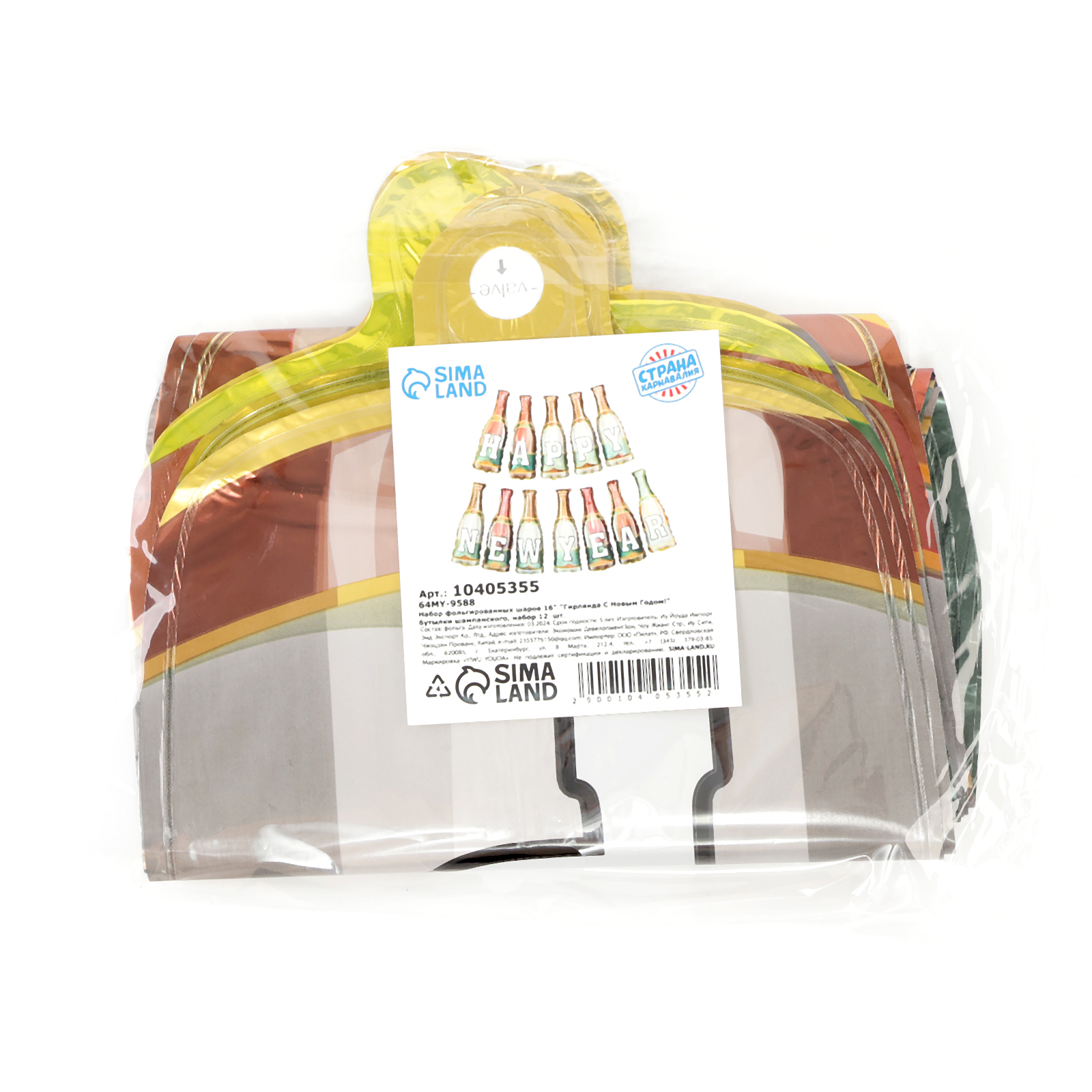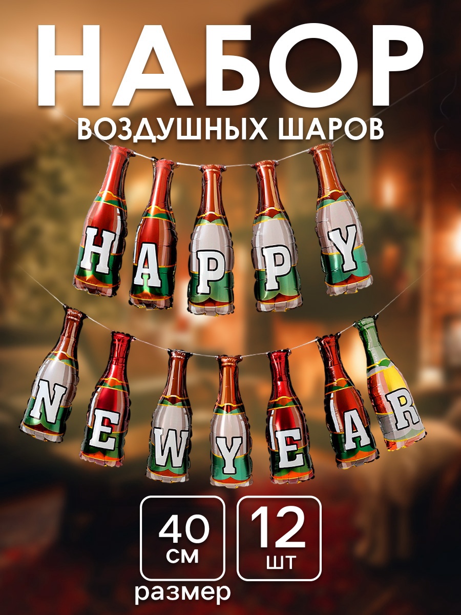Воздушные шары фольгированные 16 «бутылки шампанского», новогодний набор 12 шт.. Набор фольгированных шаров «Гирлянда С Новым Годом!» — это праздничный комплект из 12 шаров в виде бутылок шампанского, который идеально подойдет для создания новогоднего настроения. Шары легко надуваются воздухом и могут использоваться как отдельный декор или в составе гирлянды, украшая любые пространства. Преимущества набора Комплект включает 12 шаров диаметром 16 дюймов, идеально подходящих для декора.Яркий дизайн с новогодней тематикой добавит праздничного настроения.Прочный материал и клапан обеспечивают долговечность и удобство использования.Идеальный выбор для праздника Этот шар подойдёт для украшения как дома, так и на корпоративных мероприятиях, создавая праздничную атмосферу и добавляя радость в любой уголок вашего пространства. Набор:Да|Цвет:Разноцветный|В наборе, шт.:12|Диаметр, дюйм:16|Рисунок:Да|Тематика праздника:Новый год|Материал:Фольга|Тематика рисунка:Новый год |Тематика рисунка:Еда, напитки|Вид шара:Надписи и буквы|Наличие клапана:Да|Надувка шара:Воздухом|Индивидуальная упаковка:Да|Язык надписи:Английский|Оттенок:Глянец|Страна:Китай  развернуть описание ▼