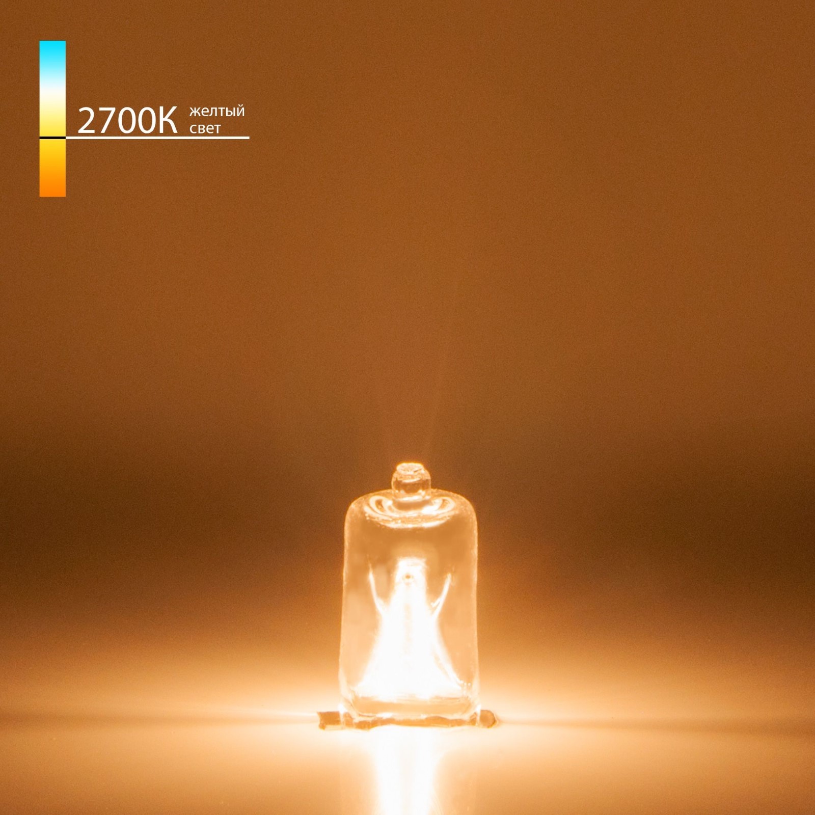 Лампа галогенная, прозрачная, elektrostandard, g9 220v, 14х14х40 мм, 40вт, g9, 430лм, 2700к.   Галогенная лампа 40W G9. Среди наиболее популярных источников света, широко используемых для внутреннего и наружного освещения, можно смело назвать галогеновые лампы с цоколем G9 и размерами 40 мм по высоте и диаметром в 14 мм. Цветовая температура – 2700K, т. е. теплый свет.  Галогенные лампы – это долговечные и яркие осветительные устройства, которые стойки к перепадам температуры и напряжения. Они служат от 2000 часов и более при соблюдении условий эксплуатации. Лампа может изменять силу свечения при использовании в технике, поддерживающей технологию диммирования.  Цвет свечения: Жёлтый Вид лампы: Галогенная Вид лампы: Светодиодная Цоколь: G9 Длина, см: 1.4 Ширина, см: 1.4 Высота, см: 4 Мощность, Вт: 40 Количество предметов в наборе: 1 Гарантийный срок, мес.: 6 Напряжение, В: 170 Напряжение, В: 240 Материал основания: Стекло Цветовая температура: 2700К Форма лампы: Трубчатая Управление светильником: Умный дом Цветовая температура, К: 2700 Световой поток, лм: 430 Тип источника освещения: Лампа не в комплекте  развернуть описание ▼