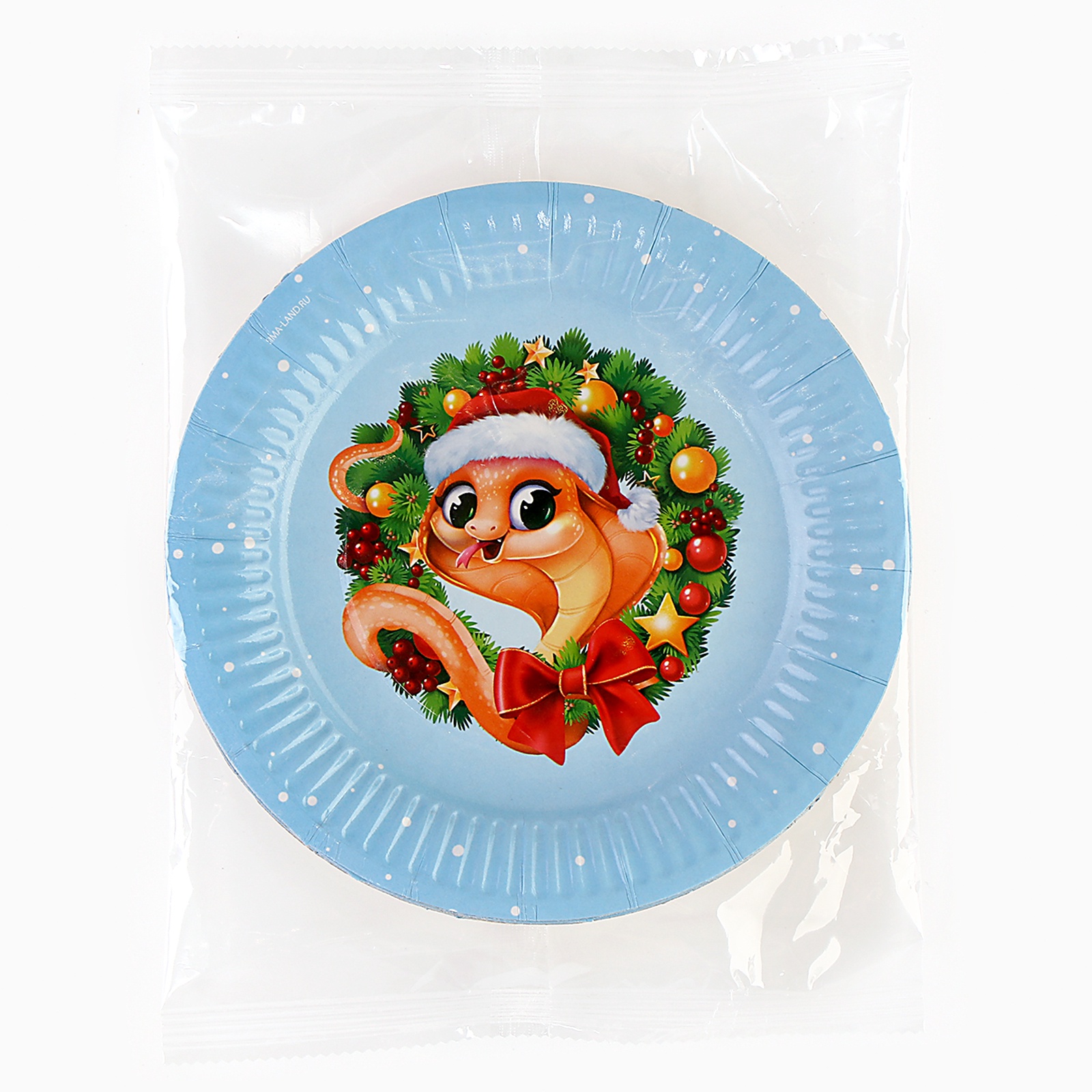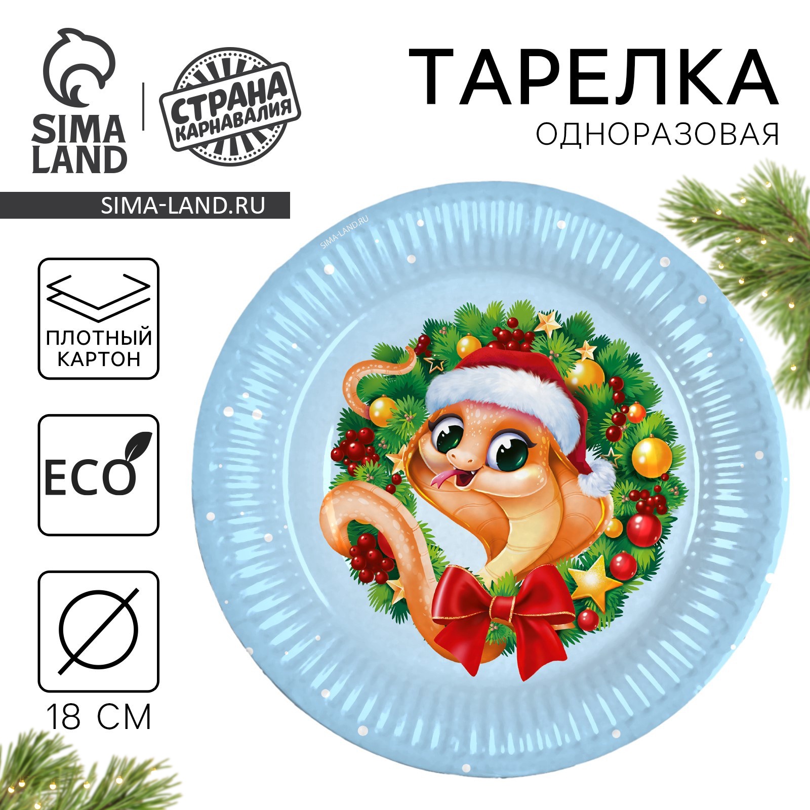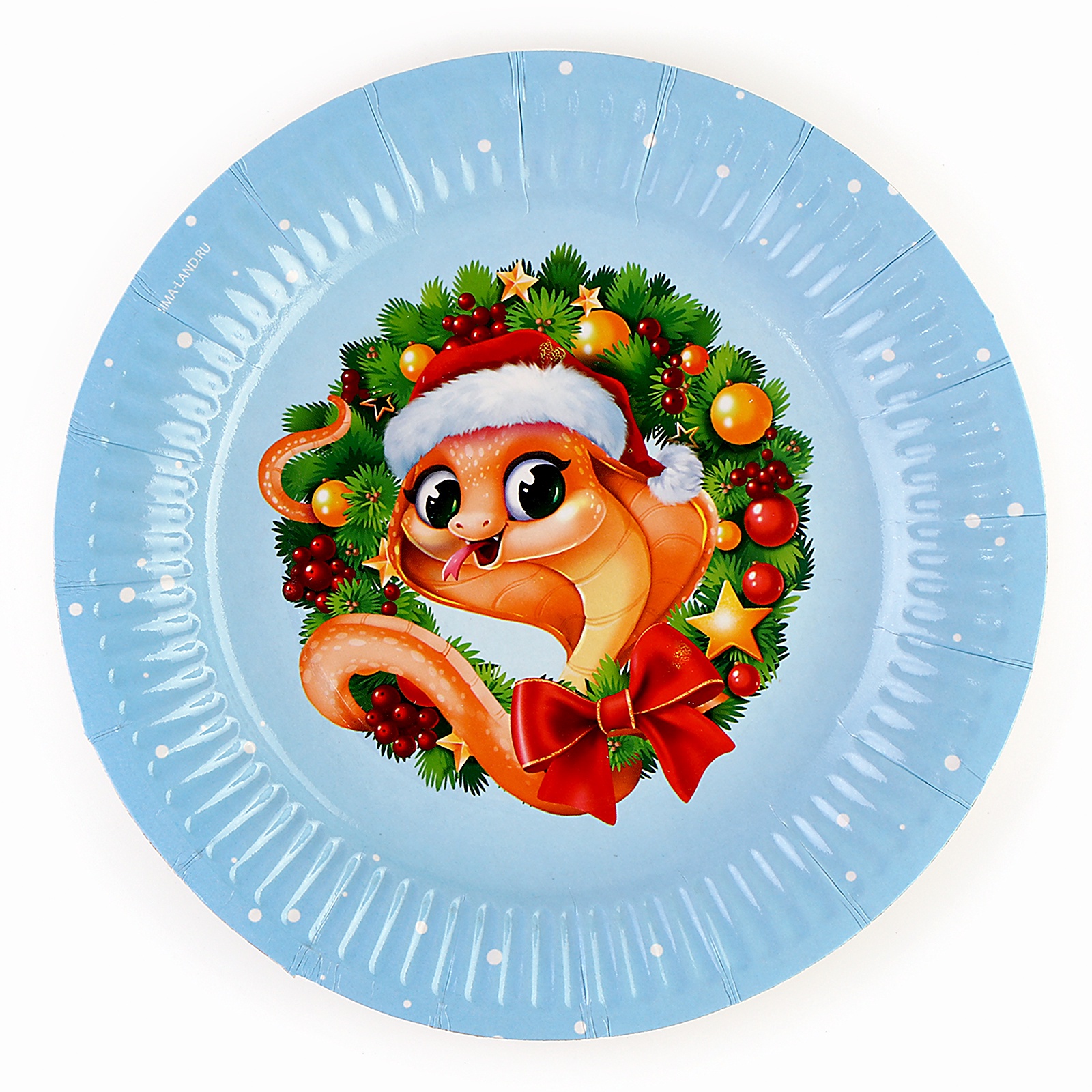 Тарелка новогодняя бумажная "с новым годом", змея с веночком, 18 см, одноразовая