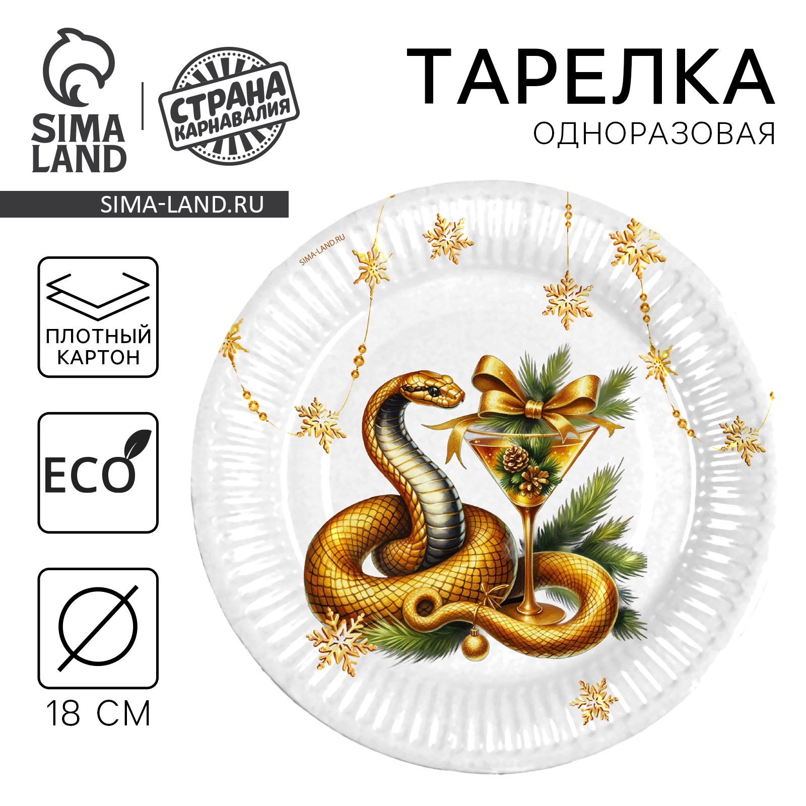 Тарелка новогодняя бумажная "с новым годом", змея с бокалом, 18 см, одноразовая