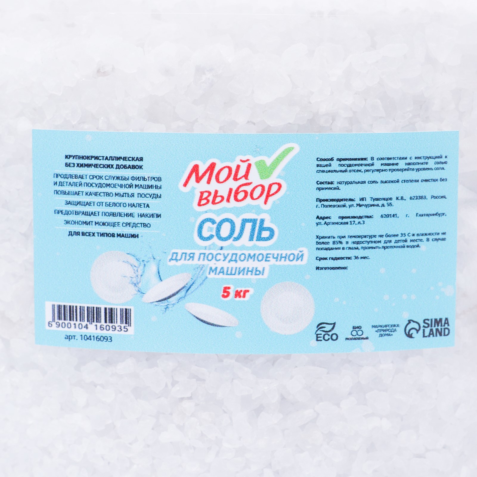 Соль для посудомоечной машины "мой выбор", 5 кг. Соль для посудомоечной машины "Мой Выбор" - это специальное средство, предназначенное для смягчения воды и предотвращения образования известкового налета на посуде и внутренних частях посудомоечной машины. Она значительно повышает эффективность работы машины и продлевает срок ее службы. Соль упакована в удобную упаковку весом 1 кг, что позволяет использовать ее долгое время. Вес, кг: 5 Форма выпуска: Соль Температурное ограничение: Нет  развернуть описание ▼