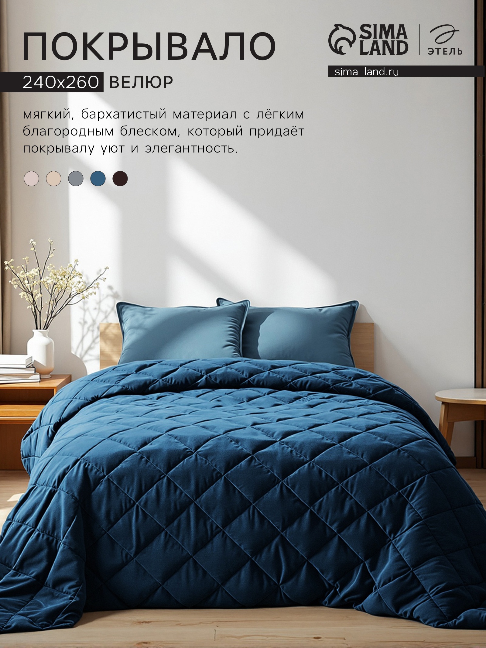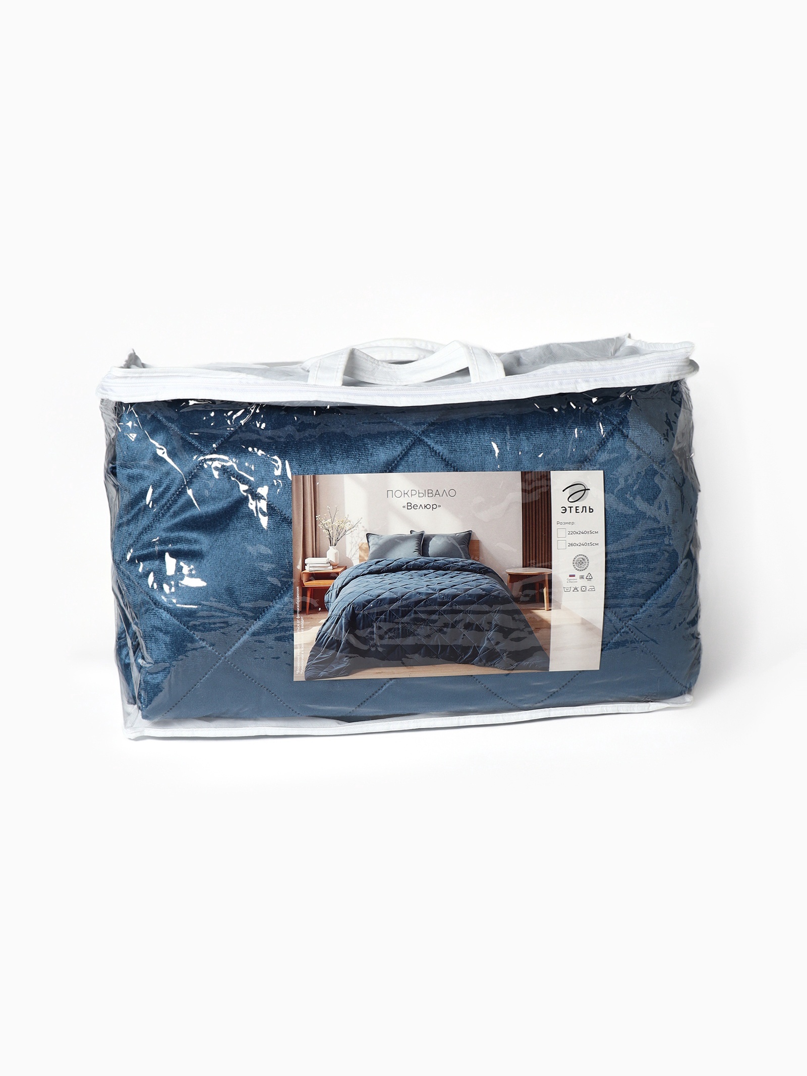 Покрывало «этель» 260 240±5 см, велюр, синее. Синее велюровое покрывало 260 240 см создаёт атмосферу уюта и стиля в вашем доме. Этот элемент текстиля не просто украшение, а практичное решение для создания комфортного пространства. Глубокий синий цвет привносит в интерьер нотки спокойствия и гармонии, идеально сочетаясь с различными оттенками и стилями оформления. Особенности Размер евро 260 240 см подходит для больших кроватей и диванов, обеспечивая полное покрытие.Однотонный дизайн легко вписывается в любой интерьер, от классики до современности.Отстрочка по краю добавляет аккуратности и предотвращает износ ткани.Упаковка в ПВХ-сумку обеспечивает удобство хранения и транспортировки.Уход прост: стирка при 30 °C, барабанная сушка на низкой температуре и глажка при 110 °C.Материал, который заботится о вас Изготовленное из высококачественного полиэстера, это покрывало обладает уникальными свойствами. Велюр — это не просто мягкая ткань, а результат тщательного плетения волокон, создающего приятную на ощупь текстуру. Каждый элемент поверхности словно обнимает вас, даря ощущение тепла и уюта. Полиэстер, входящий в состав, обеспечивает долговечность и устойчивость к износу, а также лёгкость в уходе. Он не впитывает влагу, что делает покрывало идеальным для использования в любое время года. Велюровая фактура не только приятна на ощупь, но и эффективно отталкивает пыль и грязь. Это означает, что вам не придётся тратить много времени на уборку. Просто протрите поверхность влажной тряпкой, и покрывало снова будет выглядеть как новое. Благодаря своим свойствам, оно не теряет цвет даже после многократных стирок, сохраняя насыщенность синего оттенка. Создаём уют вместе Это покрывало станет не только функциональным элементом, но и стильным акцентом в вашем интерьере. Оно создаёт атмосферу уюта и спокойствия, позволяя вам расслабиться после долгого дня. Используйте его для оформления спальни или гостиной, укрывайтесь им во время чтения книги или просмотра любимого фильма. Оно станет вашим надёжным спутником в создании комфортного пространства, где всегда приятно возвращаться. Цвет:Синий|Ткань:Велюр|Длина, см:240|Ширина, см:260|Размер:Евро|Тематика:Однотонная|Вид упаковки:PVC-сумка|Декоративные элементы:Отстрочка|Рекомендации по уходу:Стирка при 30 °С|Рекомендации по уходу:Не отбеливать|Рекомендации по уходу:Глажка при 110 °С|Рекомендации по уходу:Барабанная сушка при низкой температуре|Состав ткани:Полиэстер|Страна:Россия  развернуть описание ▼