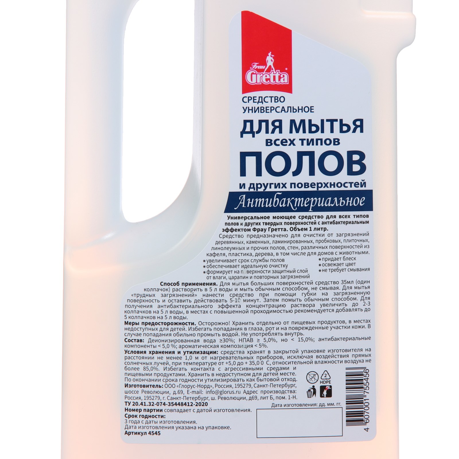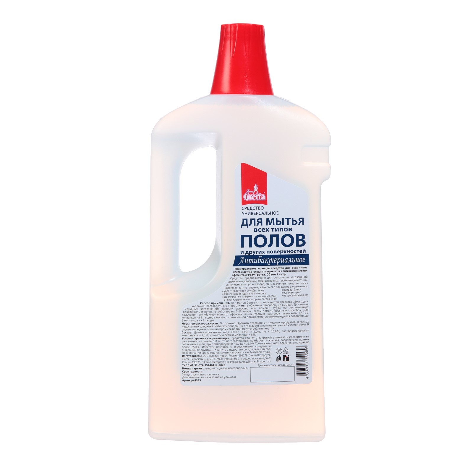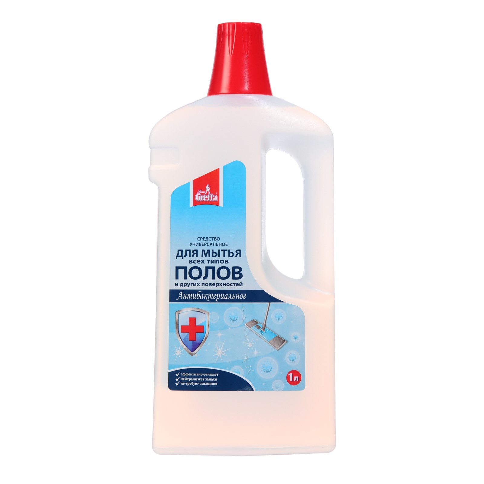 Средство для мытья полов frau gretta, антибактериальное, 1 л. Средство для мытья полов Frau Gretta - концентрированное, антибактериальное, эффективное средство для мытья полов в объеме 1 л. Жидкость для мытья пола очищает все типы напольных покрытий. -Предназначено для мытья полов, стен, различных поверхностей из кафеля, паркета, ламината, дерева, пробки, камня, линолеума. -Увеличивает срок службы полов, формируя на поверхности защитный слой от влаги, царапин и повторных загрязнений. -Придаёт блеск, не требует смывания и не оставляет разводов, освежает цвет, обладает приятным лёгким ароматом лаванды. Способ применения: Перед применением взболтать, 30 мл средства добавить в 5 литров тёплой воды, мыть обычным способом, не смывая. Для мытья стойких загрязнений необходимо нанести средство с помощью губки на поверхность и оставить на 15-30 минут, затем смыть чистой водой. Объём, л: 1 Ароматизированные: Да Температурное ограничение: Нет Особенности: Не требует смывания Содержание хлора: Нет  развернуть описание ▼