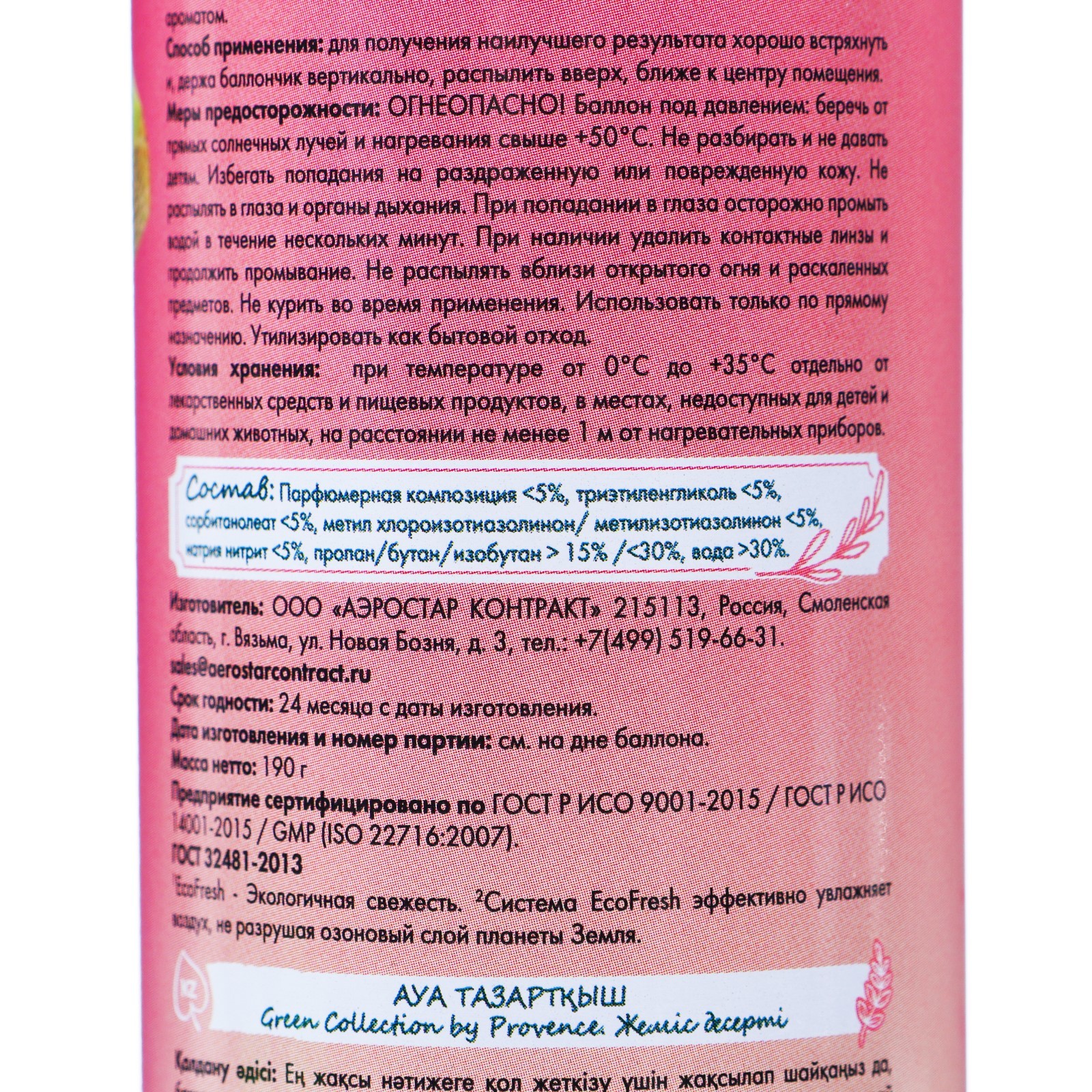 Освежитель воздуха «provence» фруктовый десерт, 300 мл. -Освежитель воздуха на водной основе без применения органических растворителей. -Уникальная система Ecofresh эффективно очищает и увлажняет воздух, не разрушая озоновый слой планеты. -Сочный аромат фруктов надолго наполнит Ваш дом радостью и хорошим настроением. Способ применения: Для получения наилучшего результата хорошо встряхнуть и, держа баллон вертикально, распылить вверх ближе к центру помещения. Объём, мл: 300 Аромат: Фруктовый микс Форма выпуска: Аэрозоль Принцип работы: Ручной Вид распыления: Влажное Температурное ограничение: Нет Тип: Освежитель воздуха  развернуть описание ▼