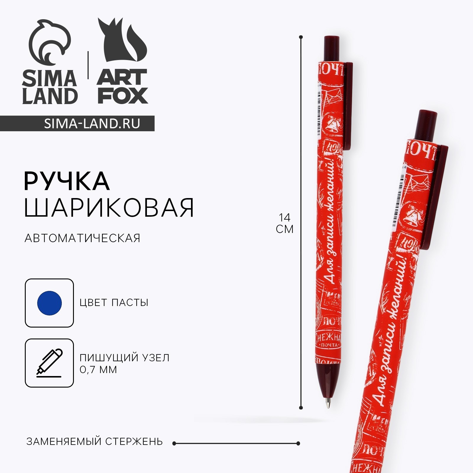 Ручка шариковая, синяя паста, 0.7 мм, автоматическая, матовая «для записи желаний!». Ручка торговой марки ArtFox отлично подойдет в качестве подарка. Яркий дизайн несомненно привлечет внимание и будет выделяться среди других предметов, а удобная форма корпуса позволит использовать ее с комфортом. Вид ручки: шариковая;Цвет стержня: синий;Стержень заменяемый: да;Материал: пластик;Форма корпуса: круглая.Упаковка: пакет. Диаметр пишущего узла, мм:0.7|Набор:Нет|Цвет стержня:Синий|Европодвес:Нет|Вид упаковки:Пакет|Символ года:Нет|Тематика праздника:Новый год|Адресат:Без адресата|Материал:Пластик|Материал упаковки:Полиэтилен|Составляющие набора:Ручка|Штрихкод на единице товара:Да|Наличие грипа:Нет|Страна:Китай  развернуть описание ▼