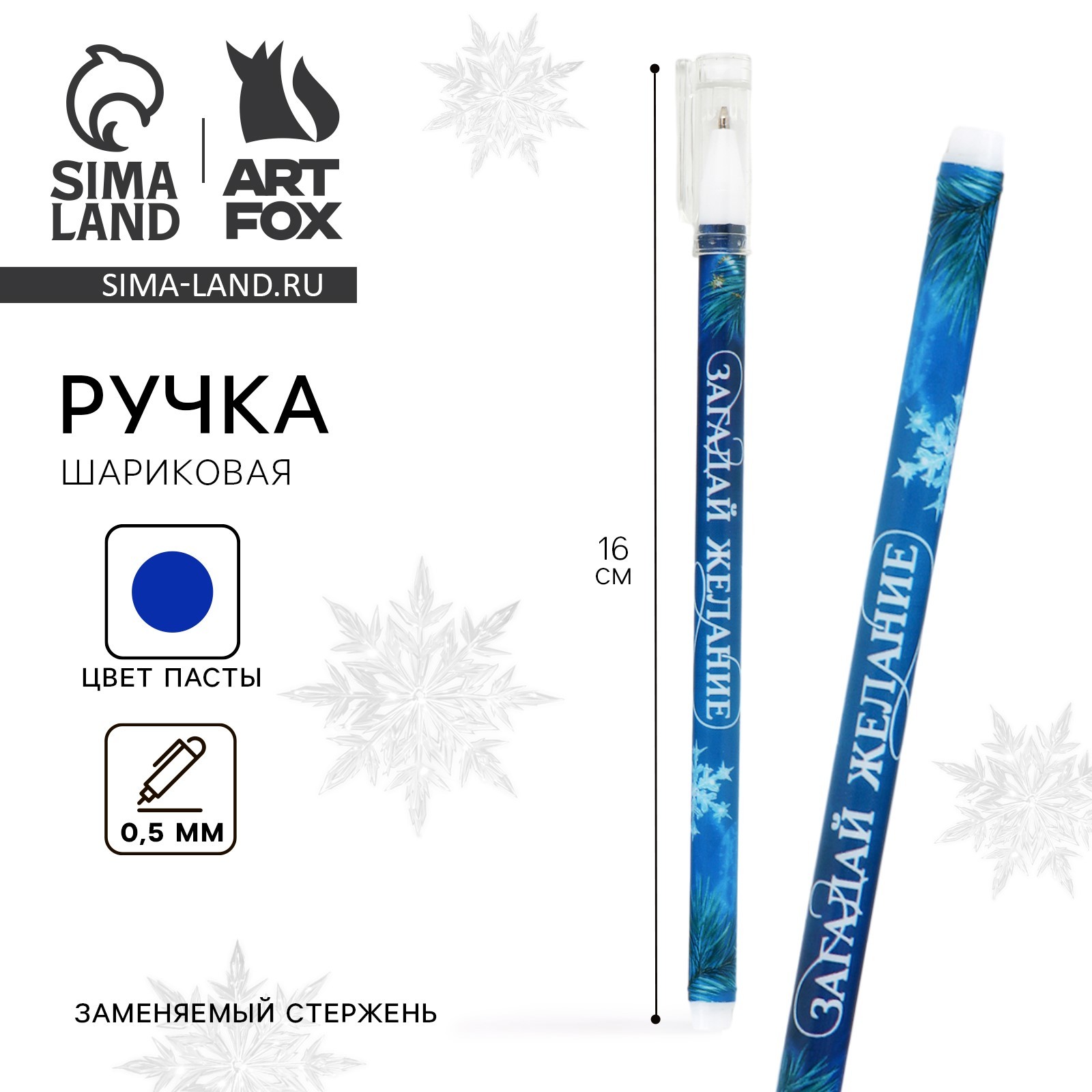 Ручка шариковая, синяя паста, 0.5 мм, с колпачком, пластик «загадай желание». Ручка торговой марки ArtFox отлично подойдет в качестве подарка. Яркий дизайн несомненно привлечет внимание и будет выделяться среди других предметов, а удобная форма корпуса позволит использовать ее с комфортом. Цвет стержня: синий;Стержень заменяемый: да;Материал: пластик;Форма корпуса: круглая.Диаметр пишущего узла, мм:0.5|Набор:Нет|Цвет стержня:Синий|Европодвес:Нет|Вид упаковки:Пакет|Символ года:Нет|Тематика праздника:Новый год|Адресат:Без адресата|Материал:Пластик|Материал упаковки:Полиэтилен|Составляющие набора:Ручка|Штрихкод на единице товара:Да|Наличие грипа:Нет|Страна:Китай  развернуть описание ▼