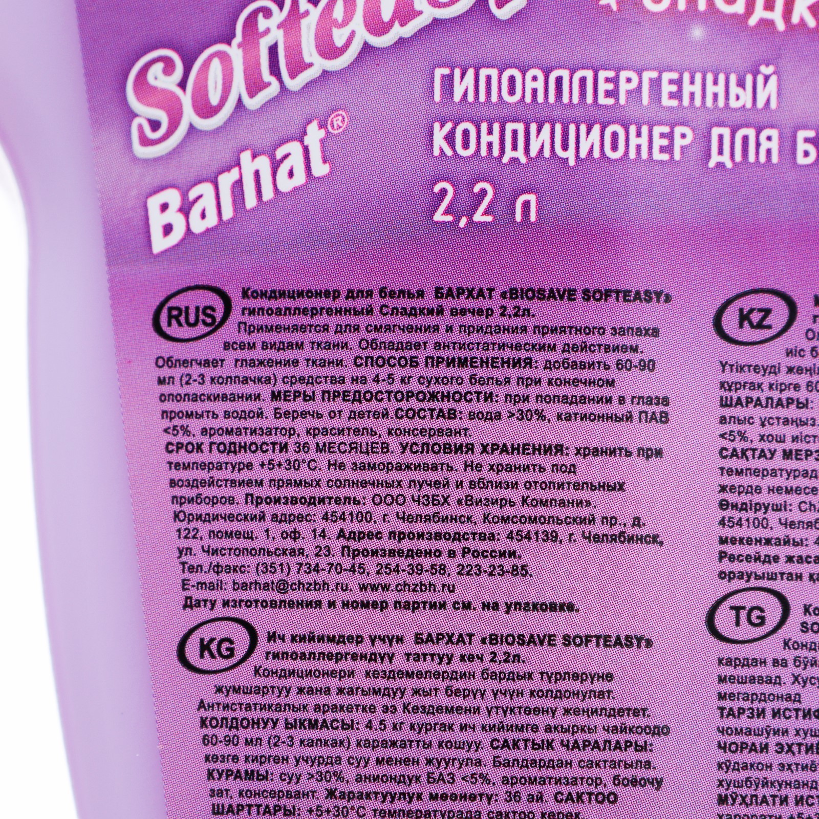 Кондиционер гипоаллергенный бархат biosave softeasy, сладкий вечер, 2,2 л. Кондиционер гипоаллергенный Бархат BIOSAVE SOFTEASY, Сладкий вечер — это мягкое и безопасное средство для ухода за различными типами тканей. Благодаря особой формуле, кондиционер эффективно восстанавливает структуру волокон, делая их мягкими и приятными на ощупь. Он также облегчает процесс глажки и помогает сохранить яркость цветов. Продукт обладает приятным ароматом "Сладкий вечер", который придает белью свежесть и чистоту. Кондиционер подходит для всех видов стиральных машин и ручной стирки, экономичен в использовании и безопасен для окружающей среды. Объём, л: 2.2 Назначение: Для всех видов тканей Температурное ограничение: Нет Особенности средства: Антистатический эффект  развернуть описание ▼