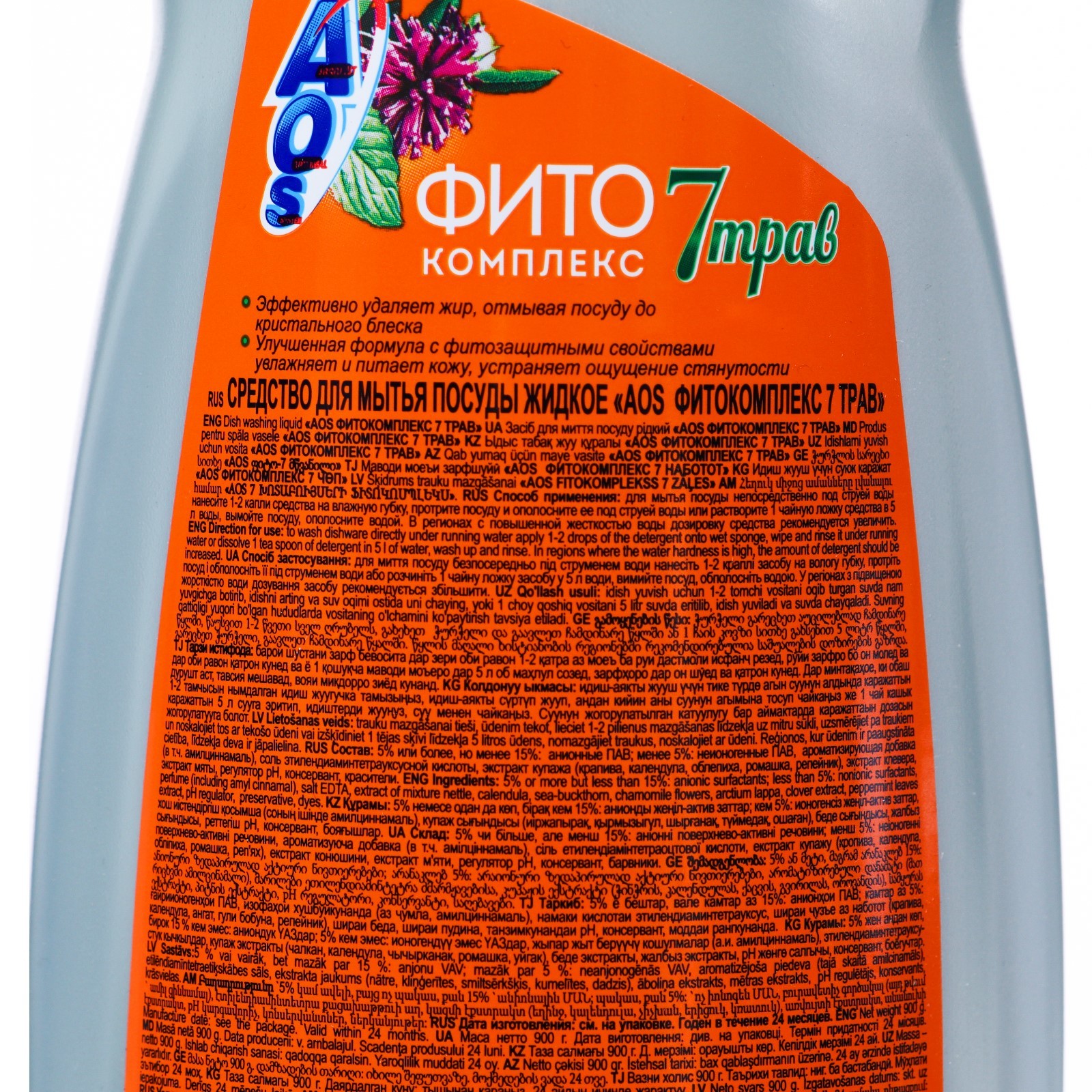 Средство для мытья посуды aos фитокомплекс 7 трав, 900 мл. Средство для мытья посуды AOS Фитокомплекс 7 трав, 900 мл -Эффективно удаляет жир, отмывая посуду до кристального блеска -Улучшенная формула с фитозащитными свойствами увлажняет и питает кожу, устраняет ощущение стянутости Способ применения:Для мытья посуды непостредственно под струей воды нанесите 1-2 капли средства на влажную губку, протрите посуду и ополосните ее под струей воды или растворите 1 чайную ложку средства в 5 л воды, вымойте посуду, ополосните водой. Состав:5% или более, но менее 15%: анионные ПАВ; менее 5%: неионогенные ПАВ, ароматизирующая добавка (в т. ч. линалоол, лимонен, цитронеллол, гексилциннамаль, амилциннамаль), соль этилендиаминтетрауксусной кислоты, регулятор рН, консервант, масло семян розы мускусной. Меры предосторожности: Использовать средство только по назначению. Хранить в недоступном для детей месте. Хранить вдали от пищевых продуктов. Хранить с закрытой крышкой. Хранить в сухом, прохладном и темном месте. Условия хранения: Хранить в сухом помещении при температуре не ниже минус 10 0С и не выше плюс 25 0С, предохраняя от прямых солнечных лучей, вдали от отопительных приборов; в недоступном для детей месте. При попадании средства на слизистые оболочки и в глаза необходимо промыть их проточной водой. По истечении указанного срока годности средство можно применять для мытья полов, кафеля, зеркал, моющихся обоев. Средство замерзает, после размораживания сохраняет свои свойства. Вес, г/Объём, мл: 900 Температурное ограничение: Нет Вид: Жидкость  развернуть описание ▼